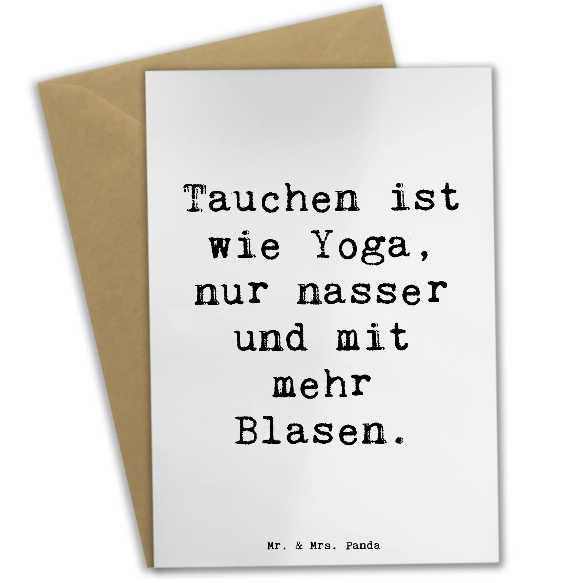 Die Grußkarte "Tauchen" von Mr. & Mrs. Panda ist die perfekte Wahl für alle Sportliebhaber und Wassersportfans! Mit dem zauberhaften Spruch "Tauchen ist wie Yoga, nur nasser und mit mehr Blasen." bringt diese Karte nicht nur Freude, sondern auch ein Lächeln auf die Gesichter deiner Freunde und Familie.