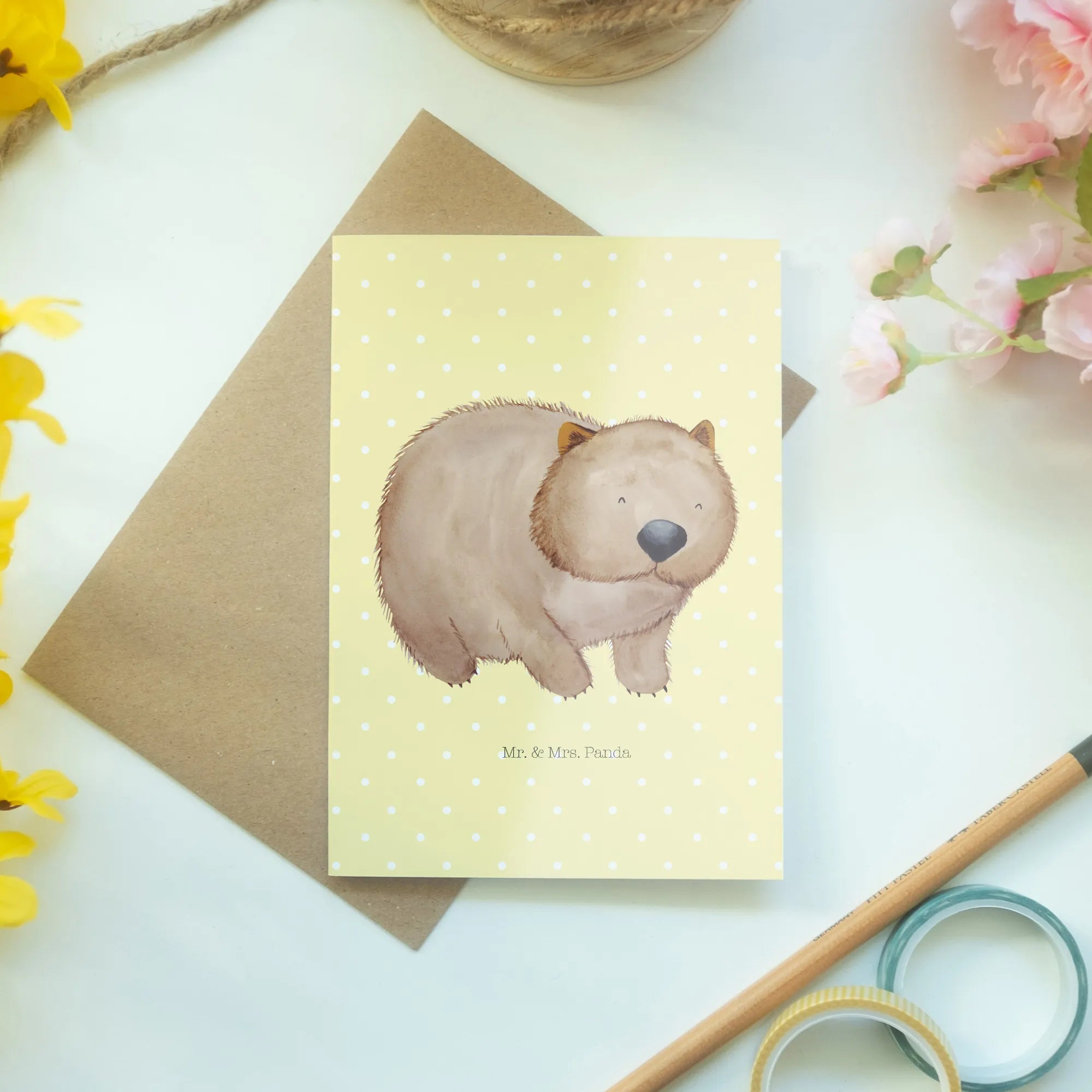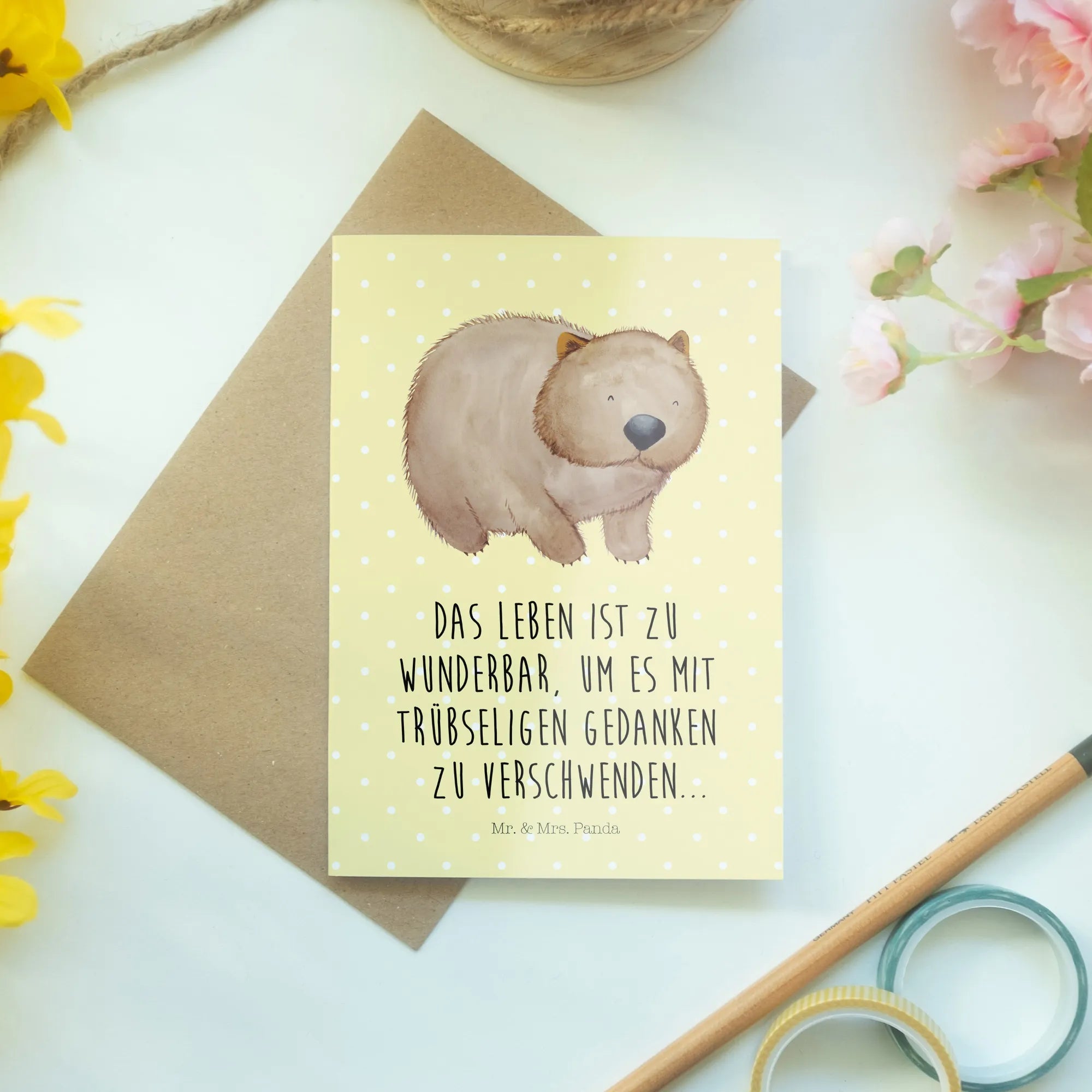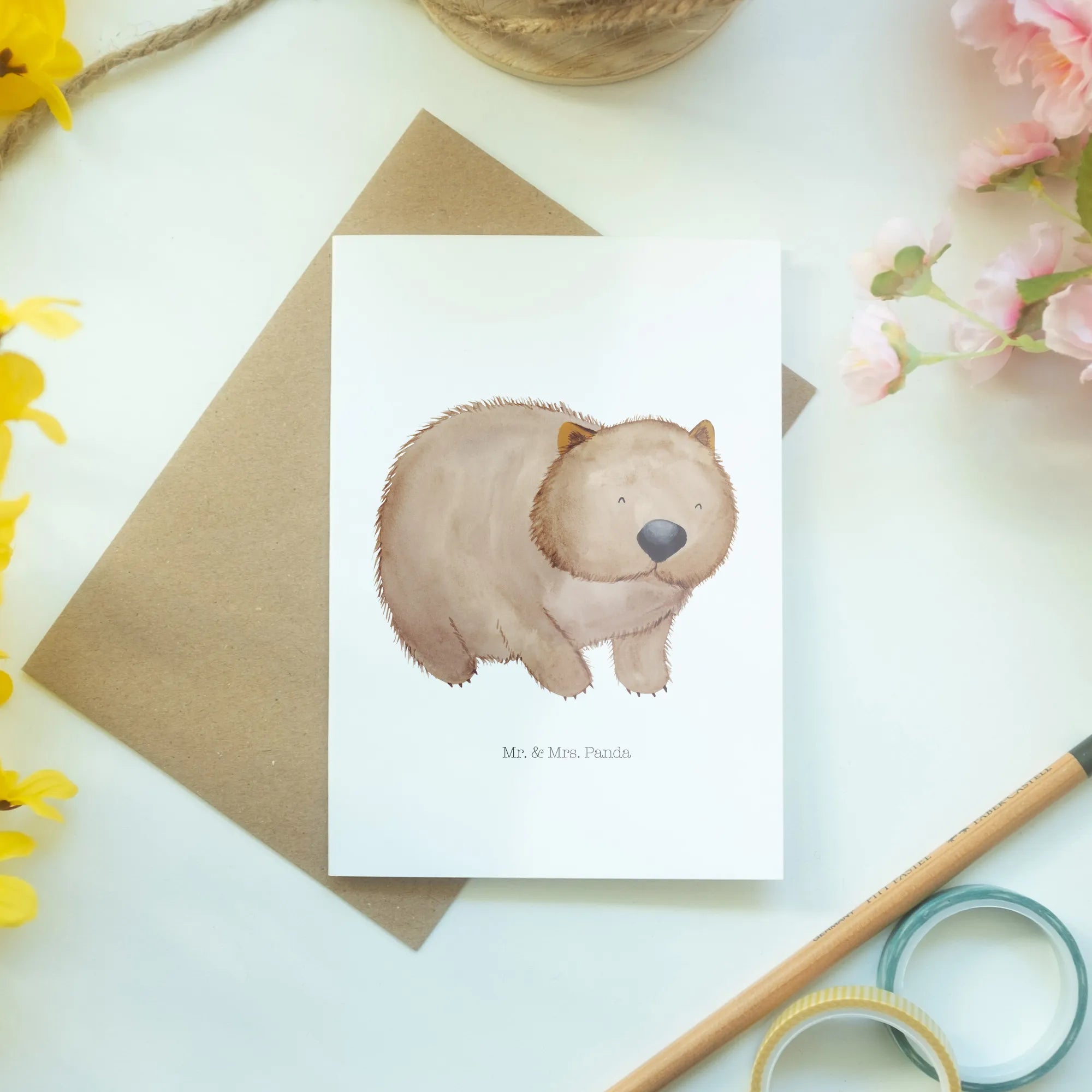 Hast du schon die perfekte Grußkarte für Deinen nächsten besonderen Anlass entdeckt? Die Grußkarte mit dem zauberhaften Wombat aus der Small World Kollektion von Mr. & Mrs. Panda ist genau das, was Du gesucht hast! Sie ist nicht nur ein fröhlicher Hingucker, sondern bringt auch eine Botschaft mit sich, die das Leben feiert.