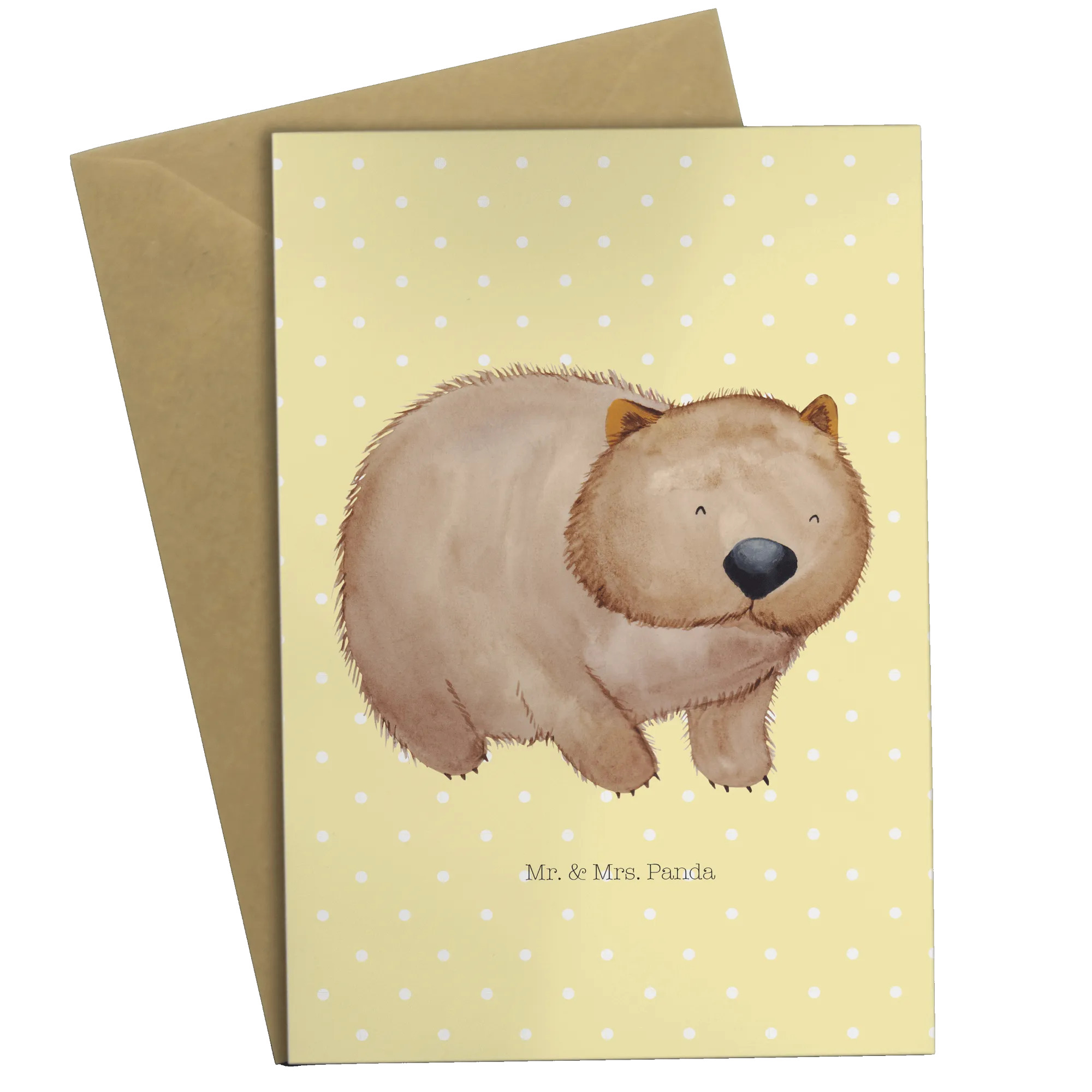 Die herzliche Ausstrahlung des Wombats in Kombination mit warmen Farben und weichen Linien macht jede Botschaft besonders. Diese Grußkarte wurde aus hochwertigem Karton gefertigt und verfügt über eine hochglänzend veredelte Vorderseite, die das süße Wombat-Motiv eindrucksvoll zur Geltung bringt.