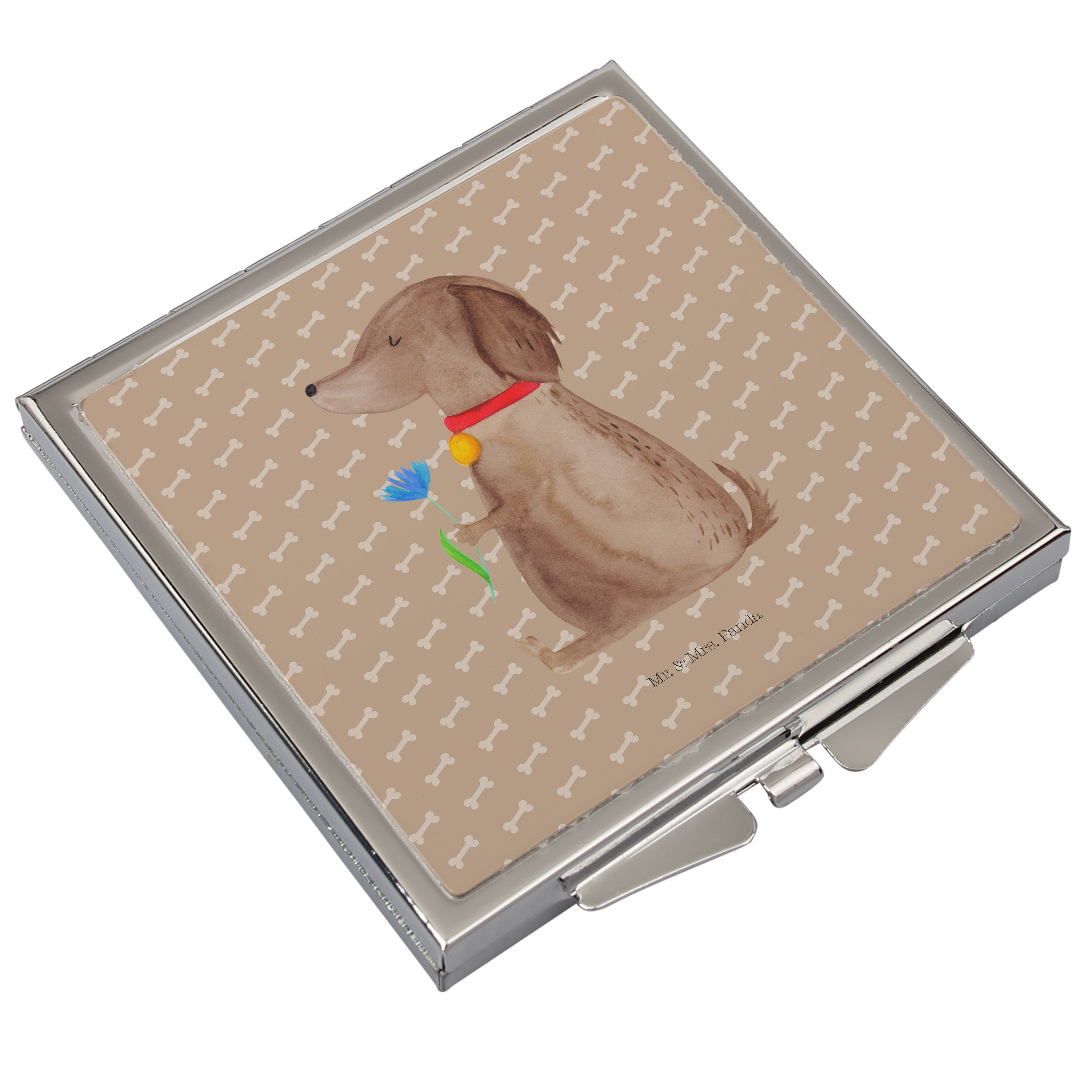 Ein treuer Begleiter für die Handtasche: Der quadratische Handtaschenspiegel „Hund Blume“ von Mr. & Mrs. Panda vereint niedliches Design mit praktischer Funktion. Die zauberhafte Illustration einer süßen Hündin mit einer Blume im Fell macht den Taschenspiegel zu einem besonderen Hingucker, ideal für alle Hundeliebhaber und Hundebesitzer.