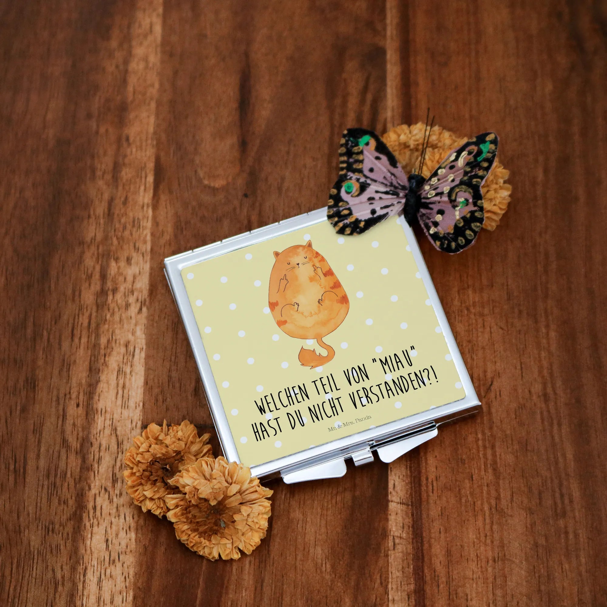 Handtaschenspiegel quadratisch Katze Mittelfinger - mit Spruch - Gelb Pastell