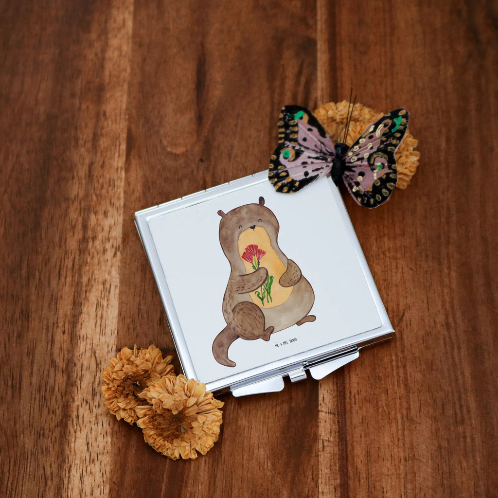 Handtaschenspiegel quadratisch Otter Blumenstrauß - mit Spruch - Grau Pastell