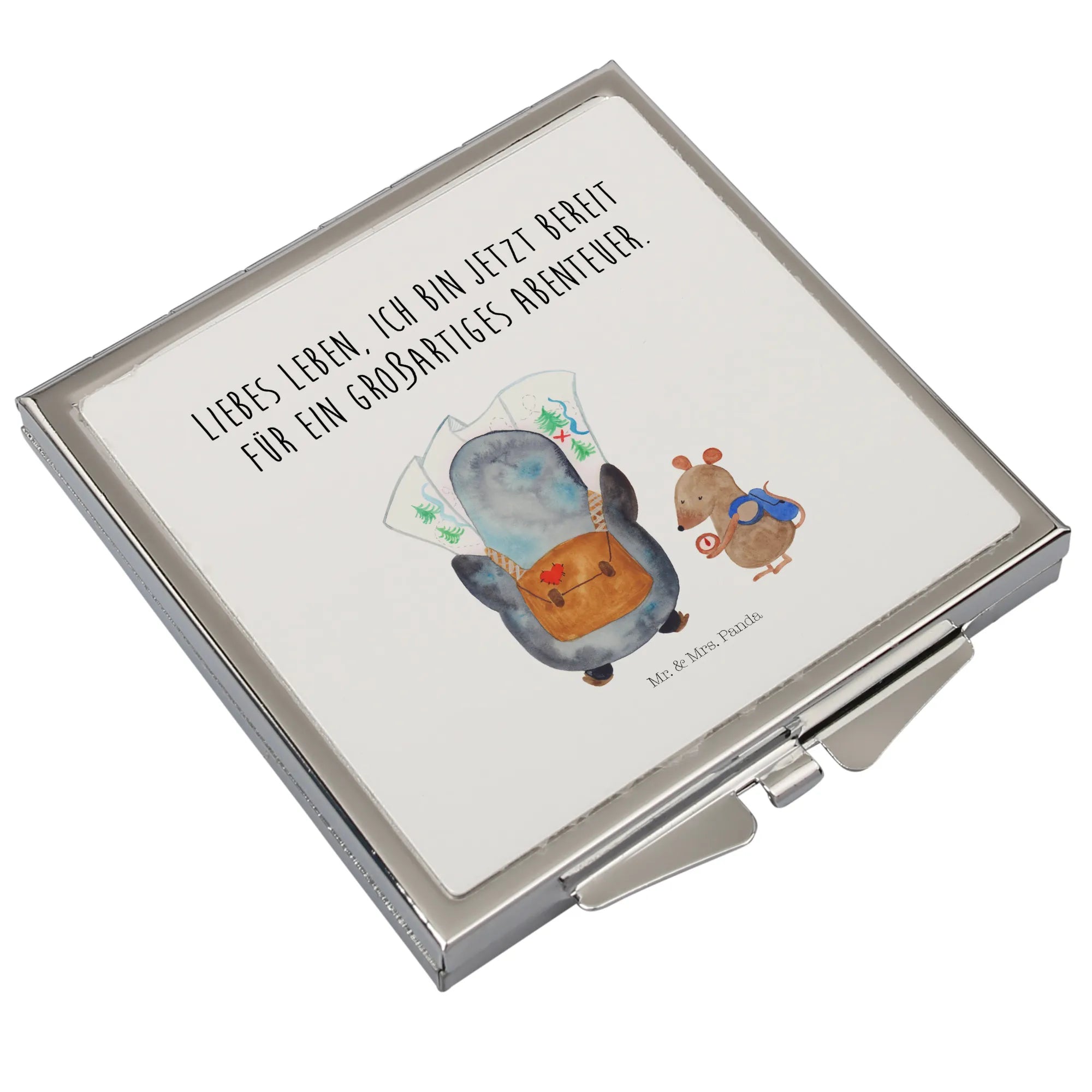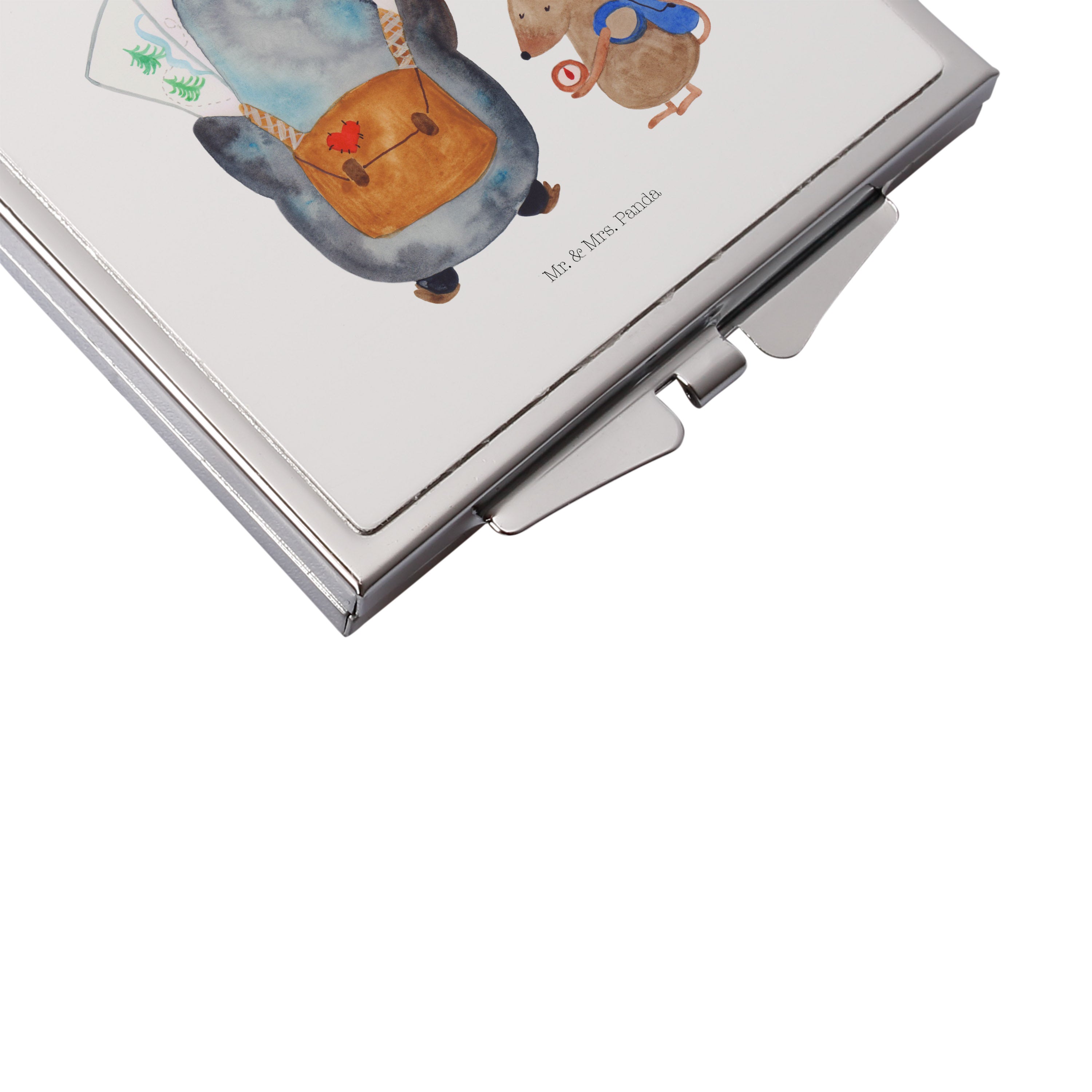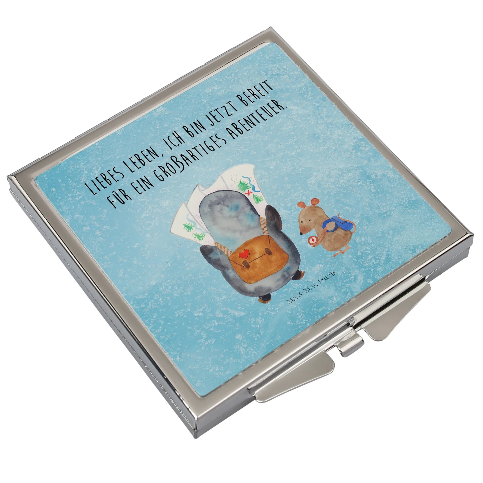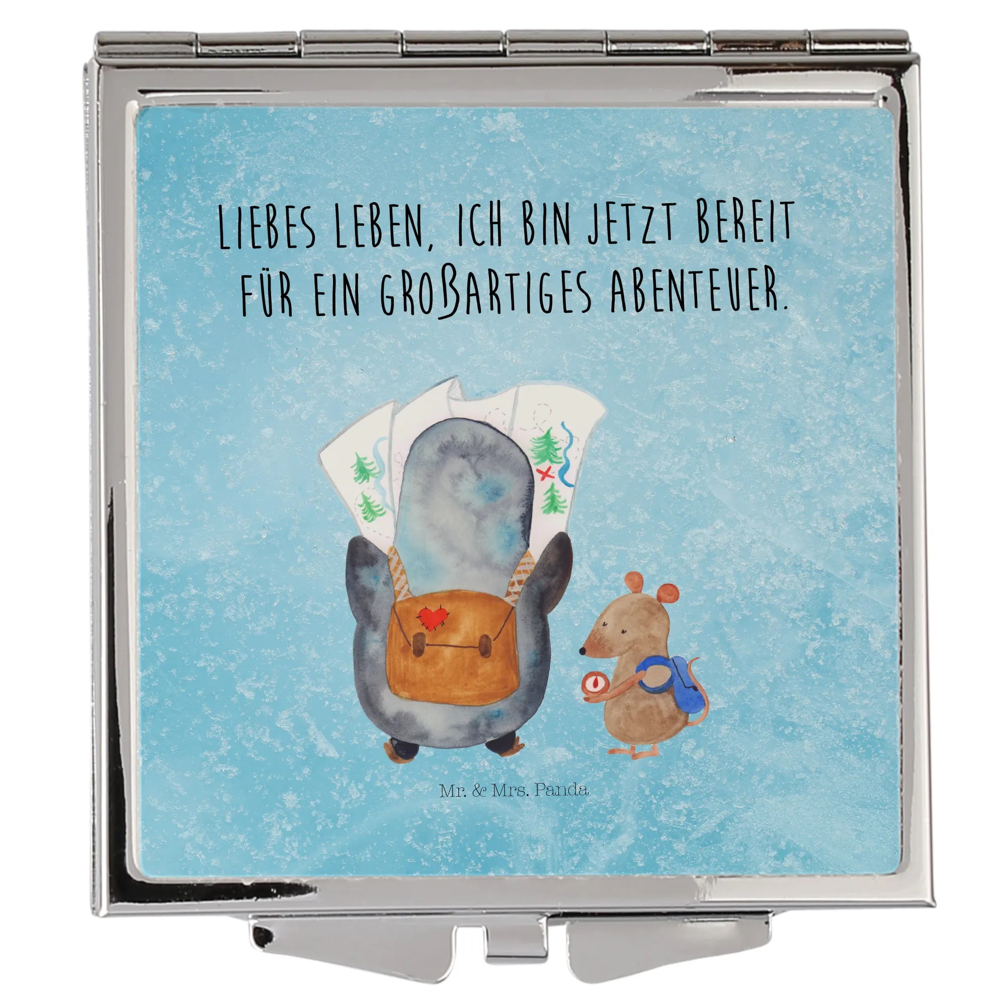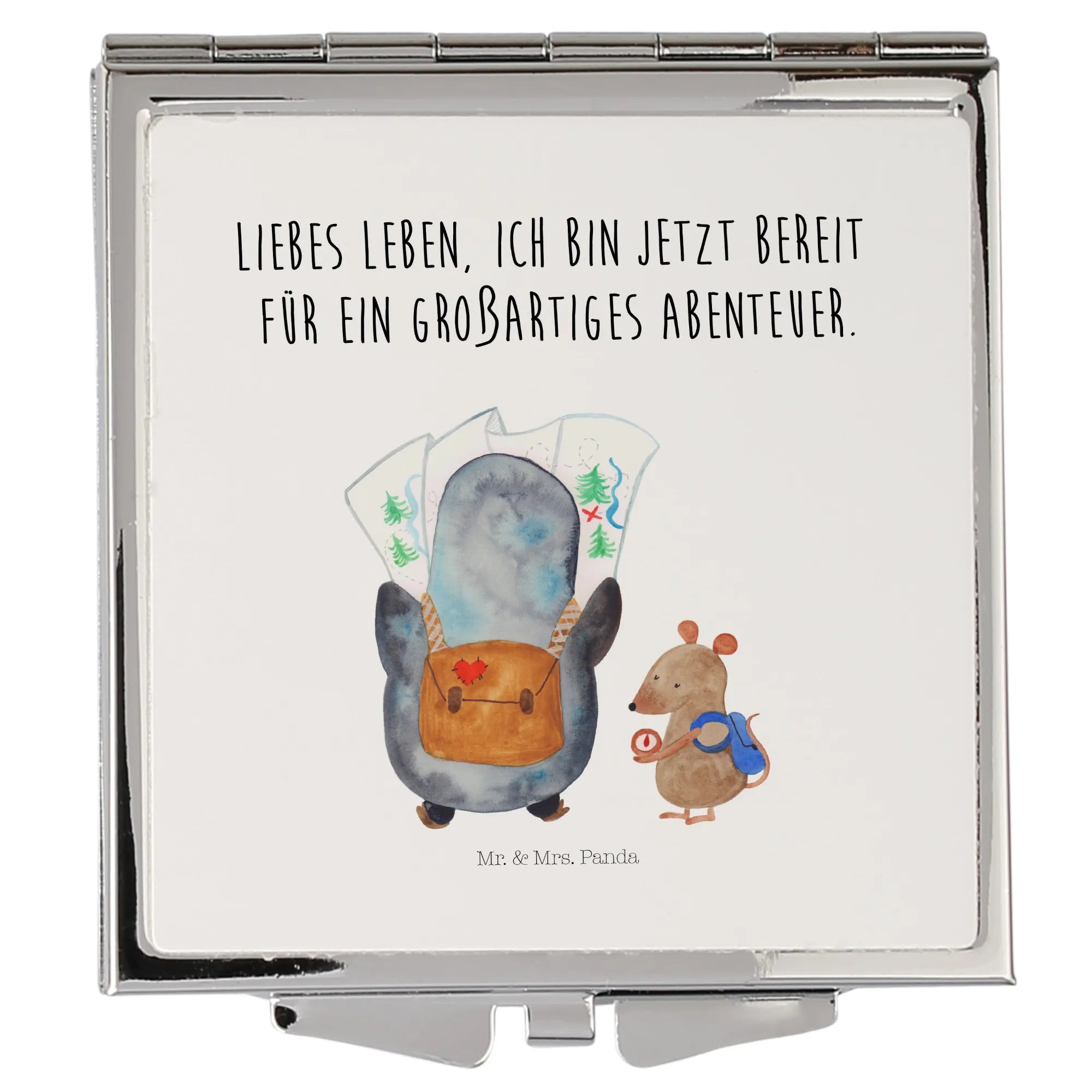 Handtaschenspiegel quadratisch Pinguin & Maus Wanderer - mit Spruch - Weiß