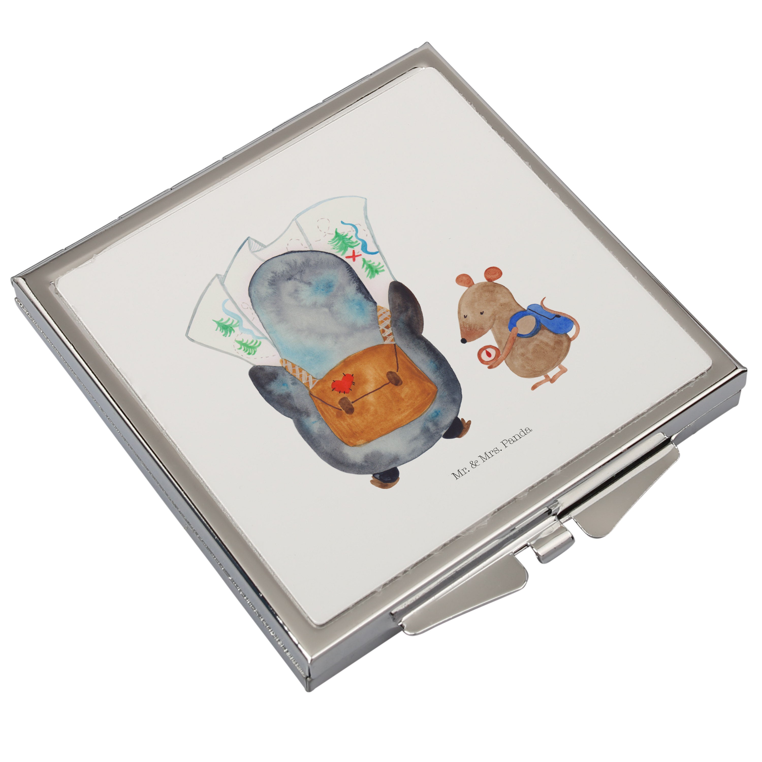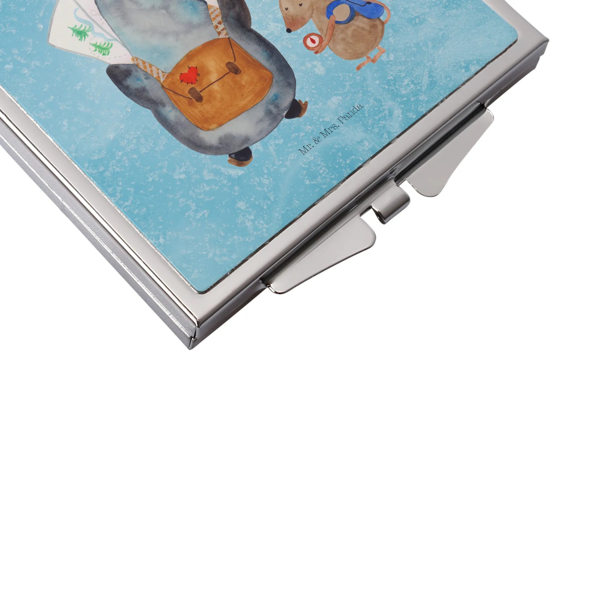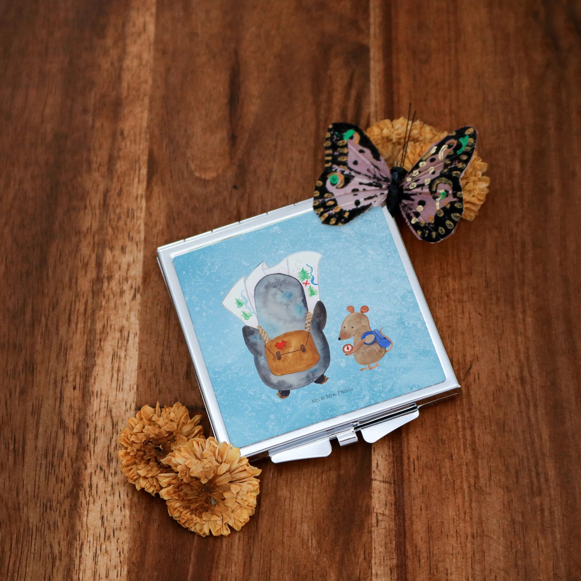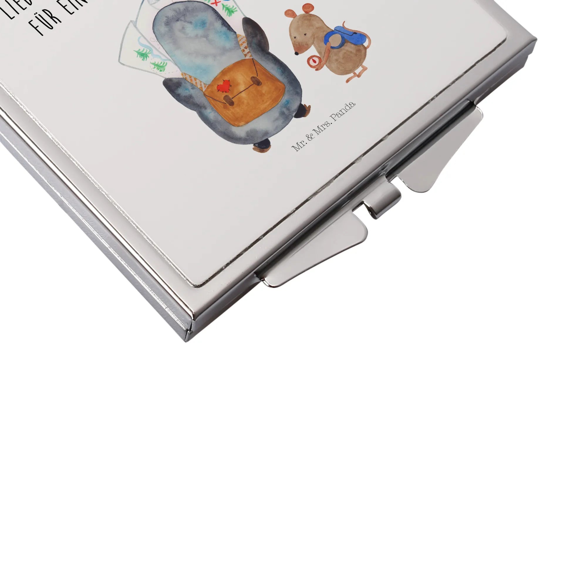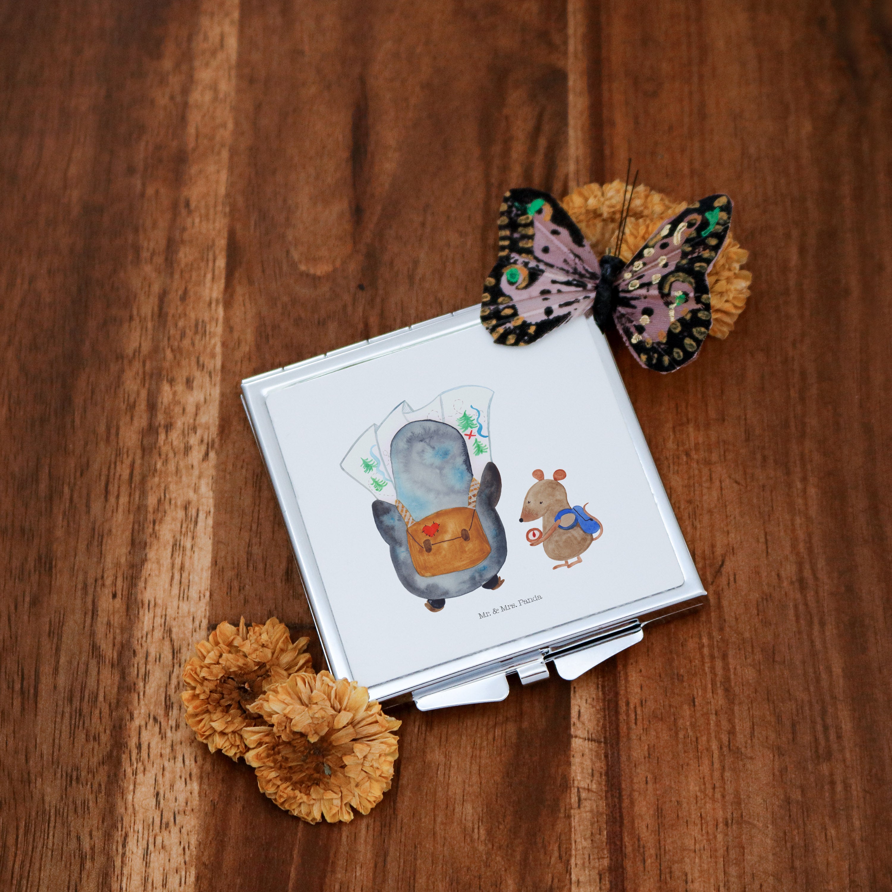 Handtaschenspiegel quadratisch Pinguin & Maus Wanderer - mit Spruch - Weiß