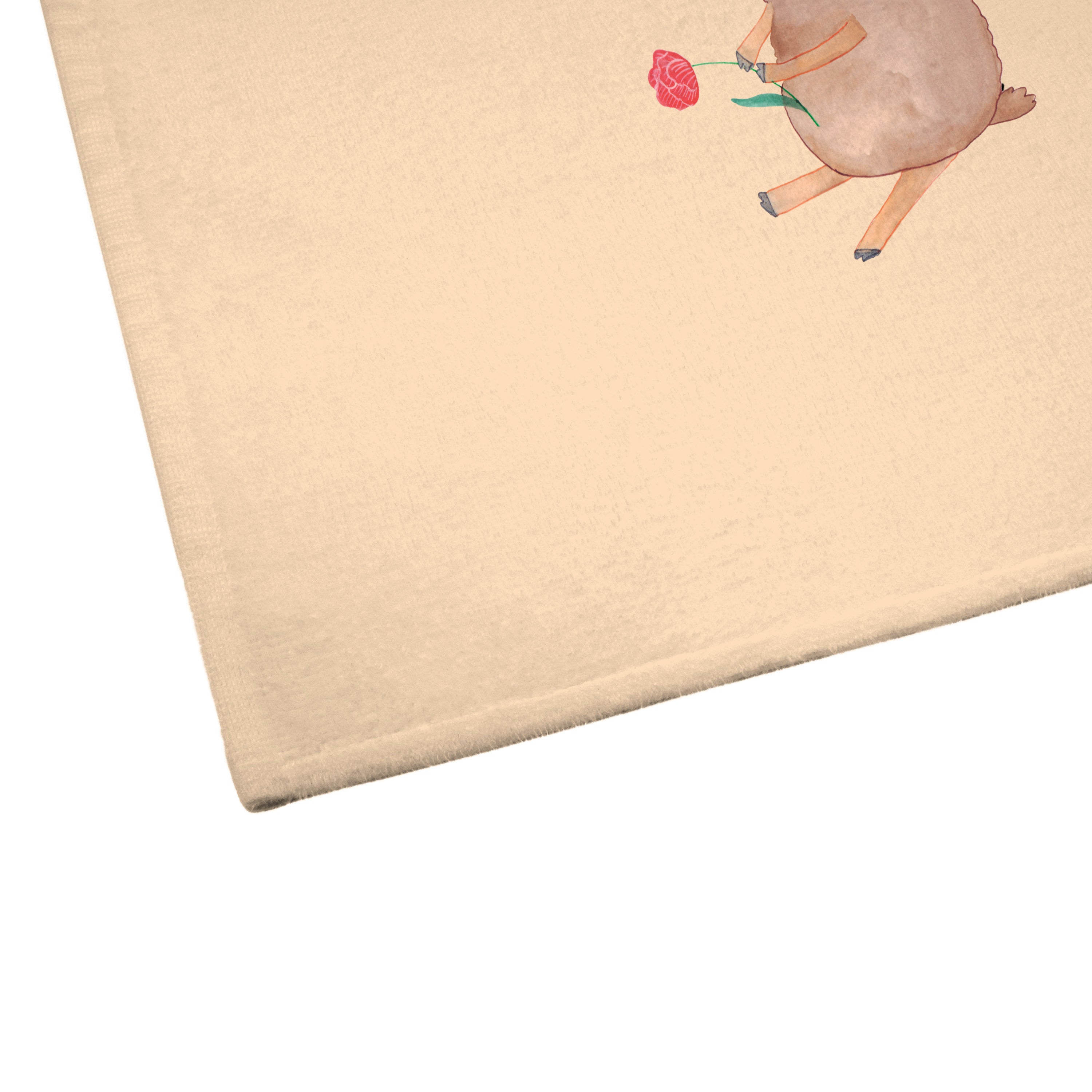 Ein wunderschönes Gästehandtuch von Mr. & Mrs. Panda mit dem zauberhaften Motiv Alpaka Blume ist der perfekte Begleiter für dein Badezimmer. Es begeistert nicht nur mit seinem weichen Material aus einer hochwertigen Baumwollmischung, sondern bringt auch einen Hauch von Fröhlichkeit in jeden Raum. Mit einer Größe von 300 mm x 500 mm ist es ideal für jedes Gästebad.