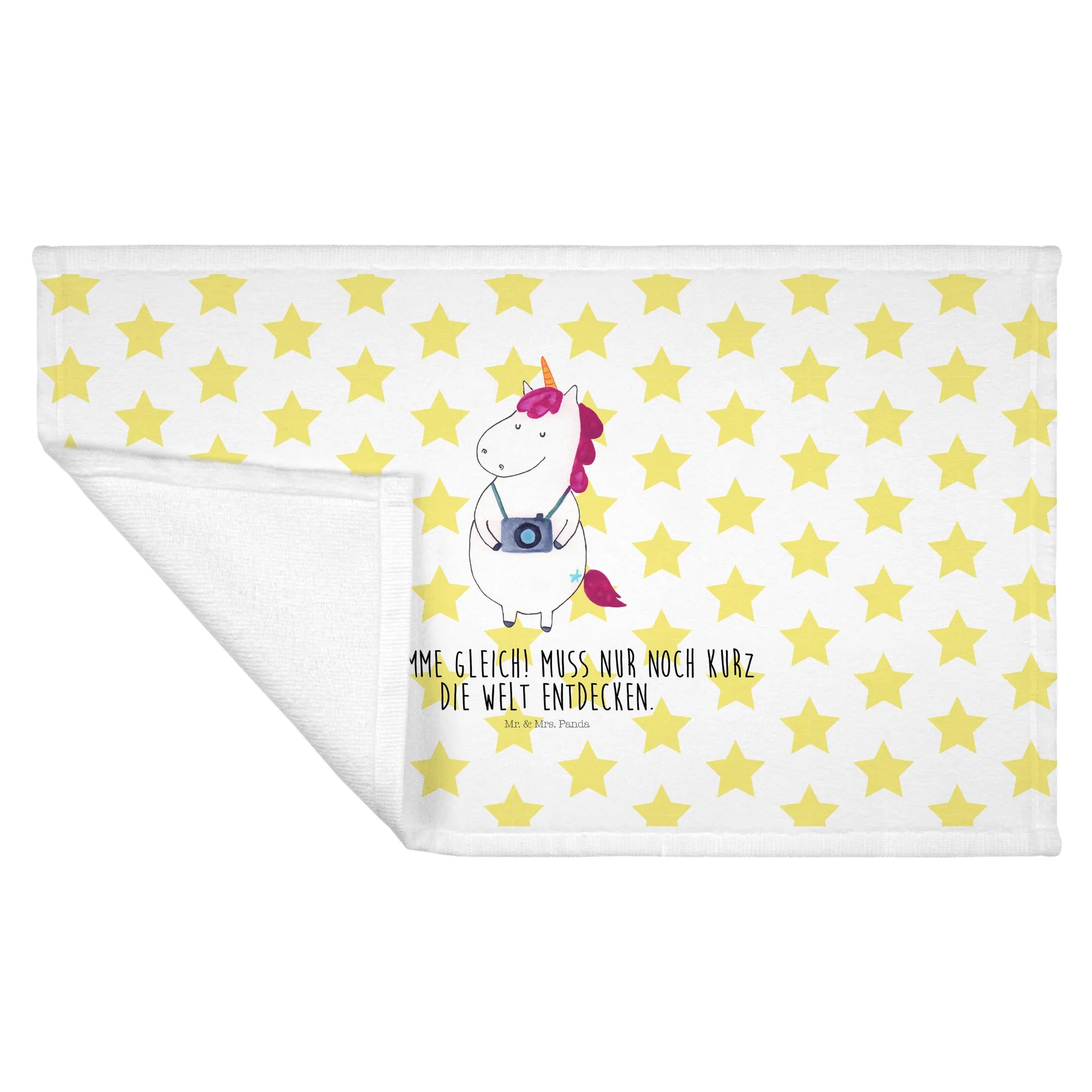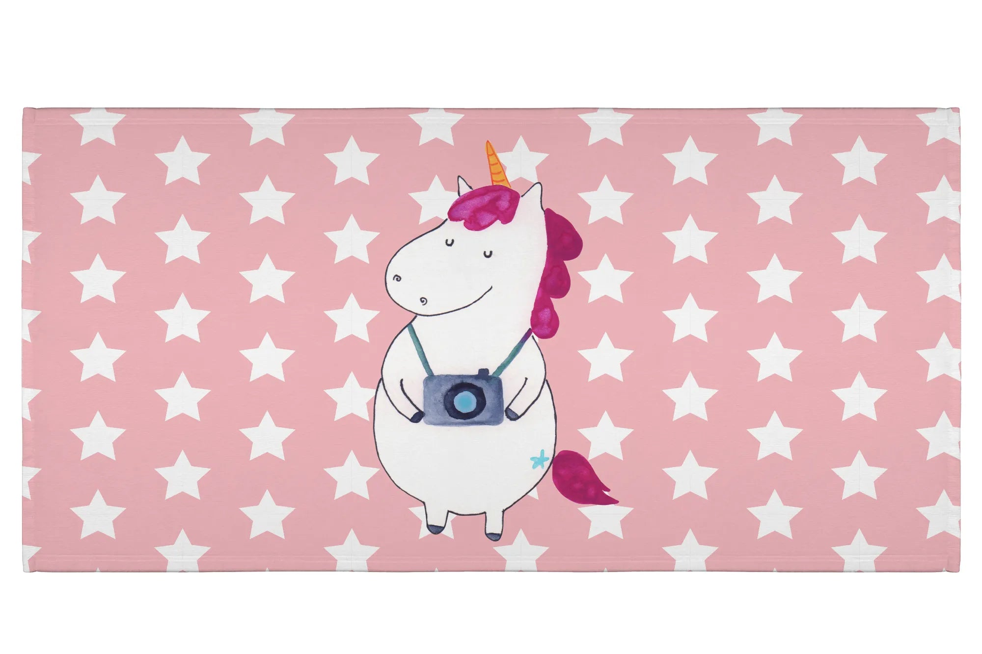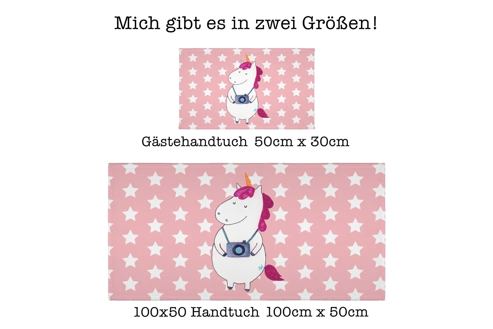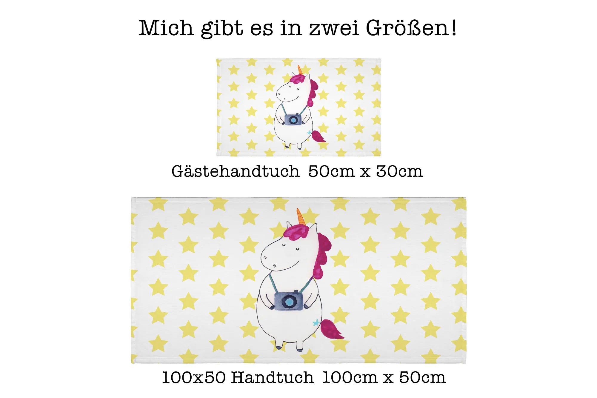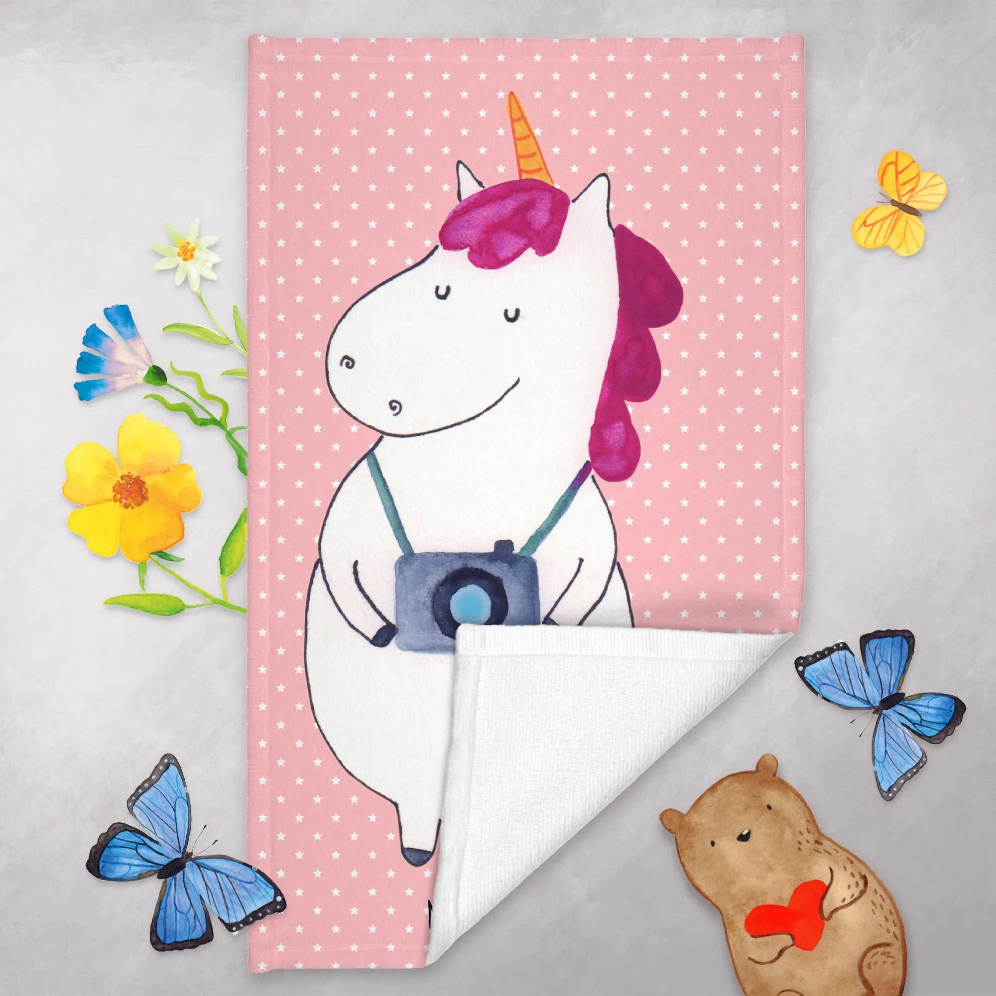 Das 50 x 100 Handtuch mit dem zauberhaften Einhorn Fotografen von Mr. & Mrs. Panda ist das perfekte Geschenk für alle Weltenbummler und Einhornliebhaber! Es bringt mit seinem bunten, hochwertigen Druck ein Lächeln in jedes Badezimmer und eignet sich hervorragend für die tägliche Gesichtspflege oder einfach für den Alltag.