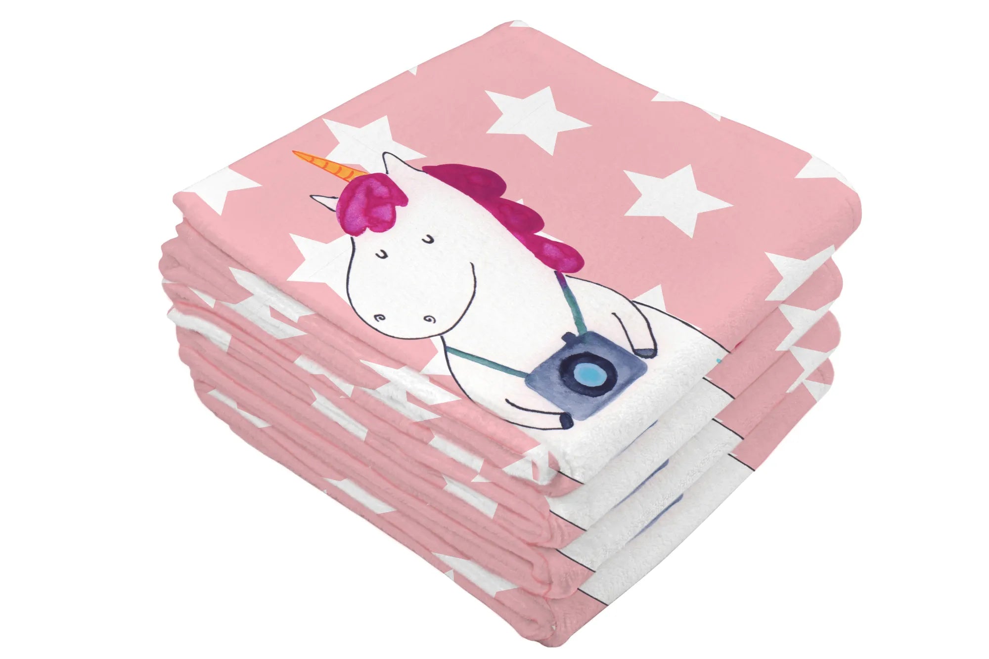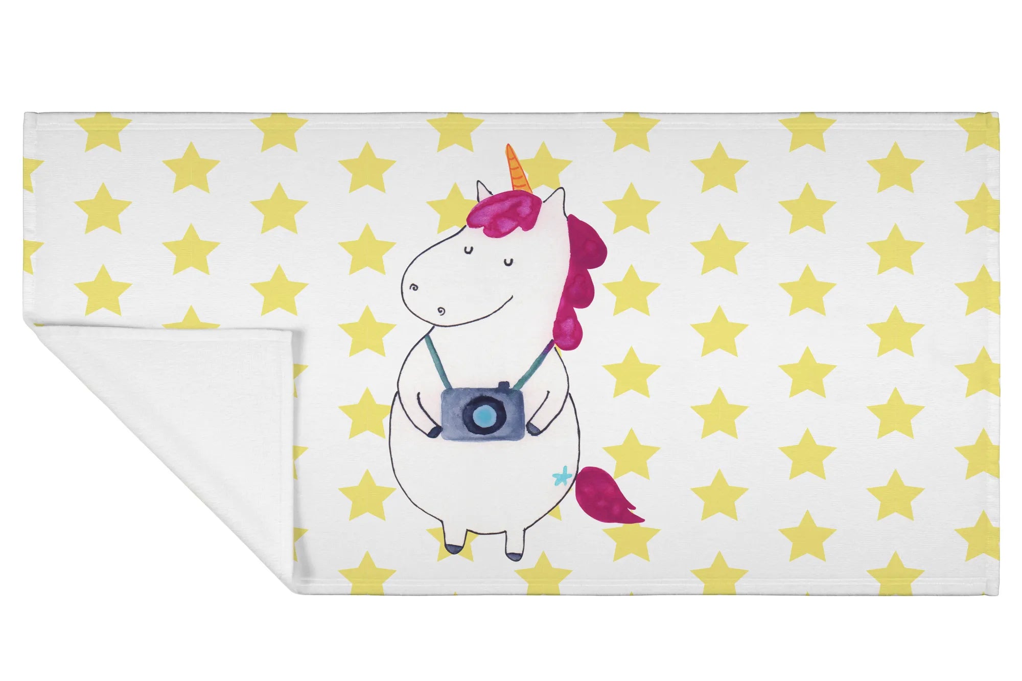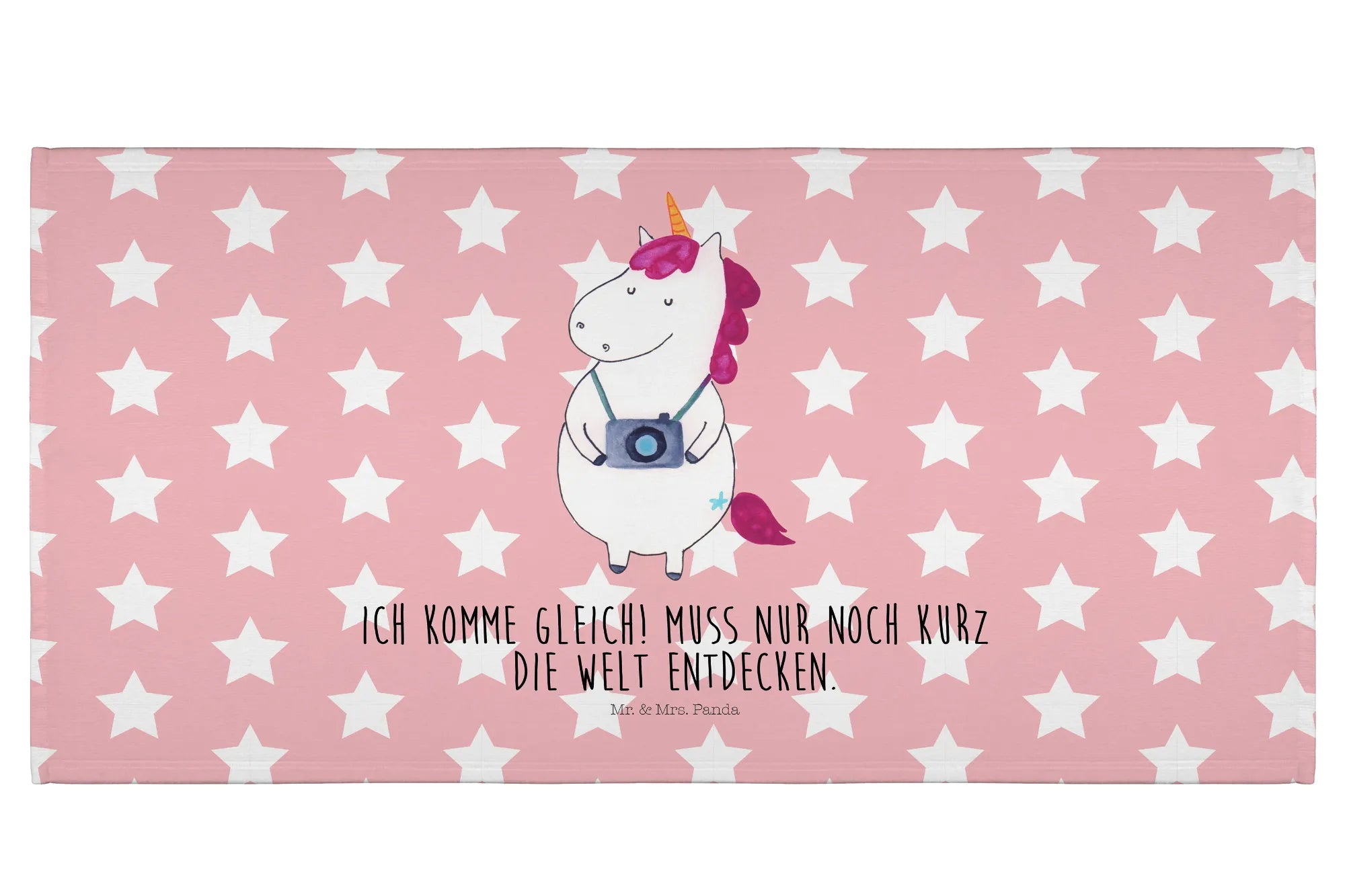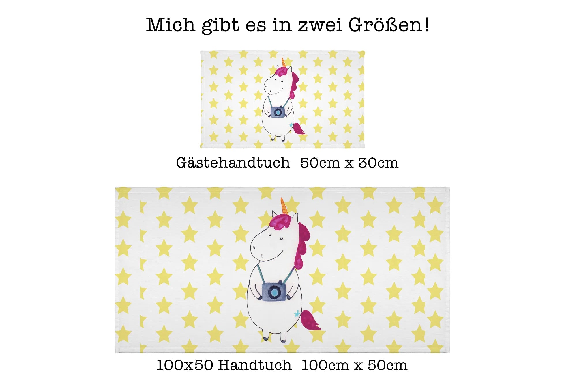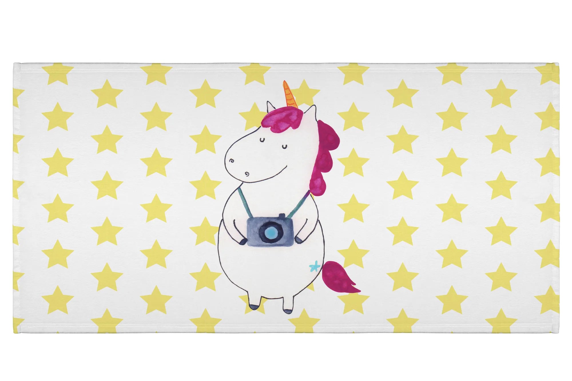 Das 50 x 100 Handtuch mit dem zauberhaften Einhorn Fotografen von Mr. & Mrs. Panda ist das perfekte Geschenk für alle Weltenbummler und Einhornliebhaber! Es bringt mit seinem bunten, hochwertigen Druck ein Lächeln in jedes Badezimmer und eignet sich hervorragend für die tägliche Gesichtspflege oder einfach für den Alltag.