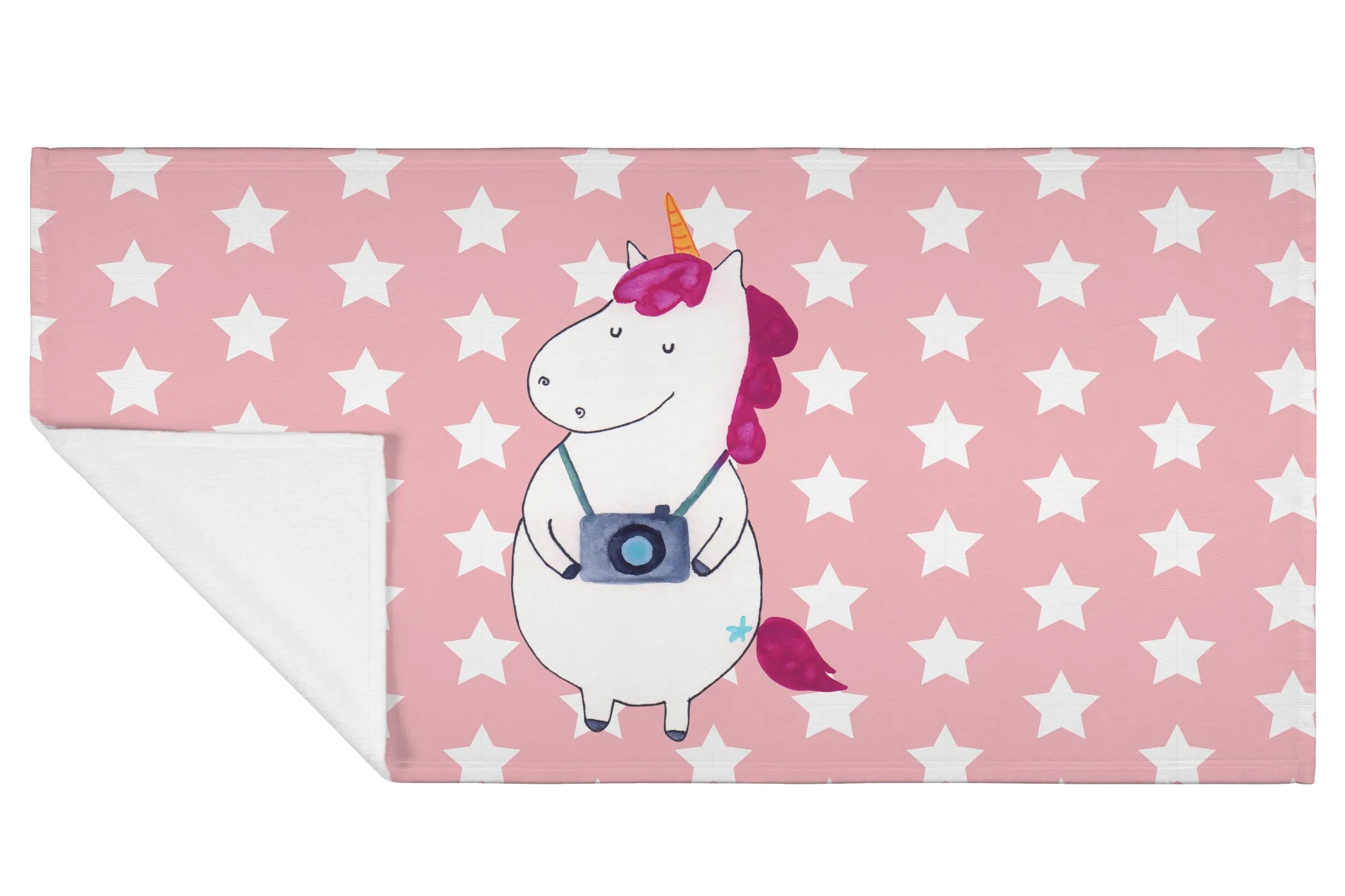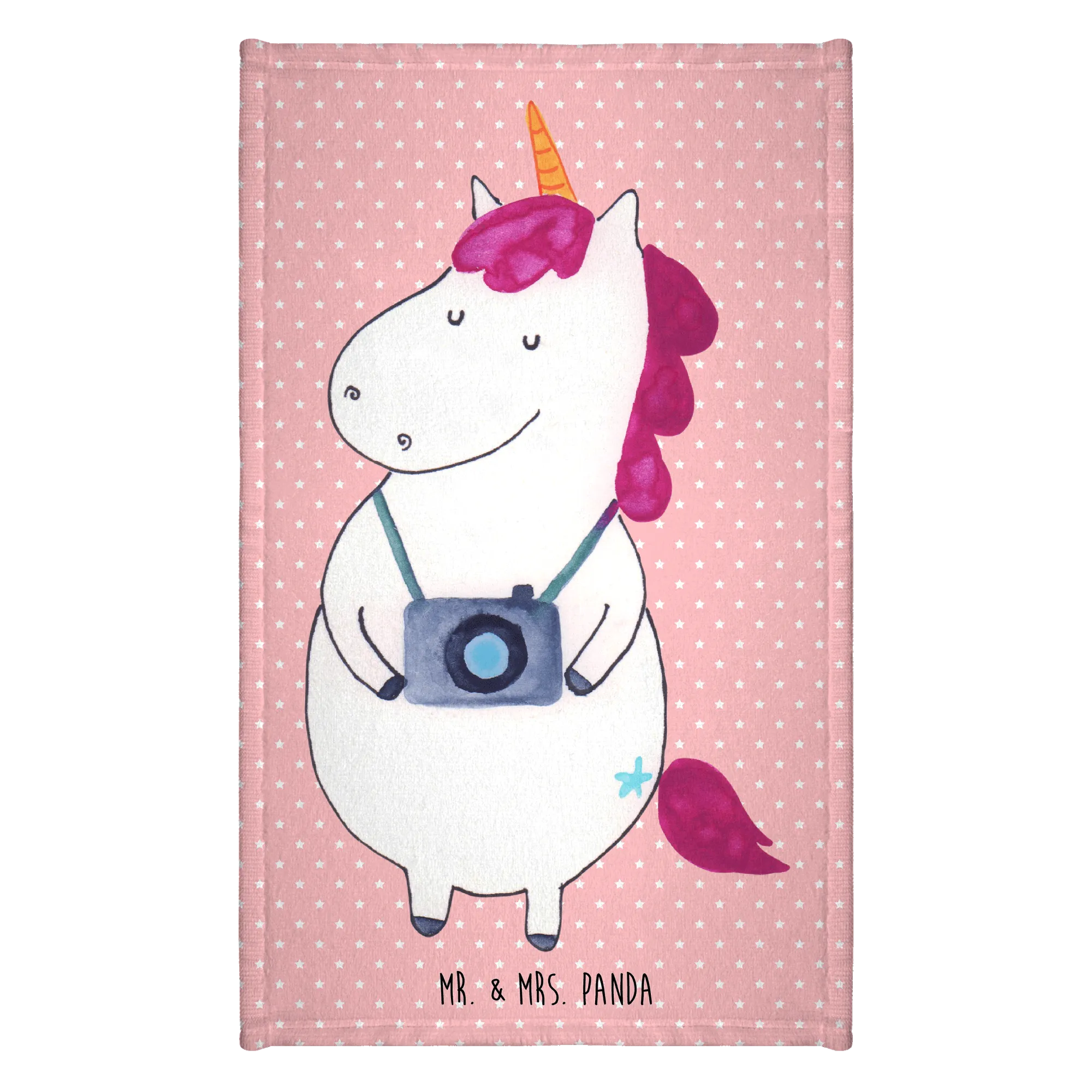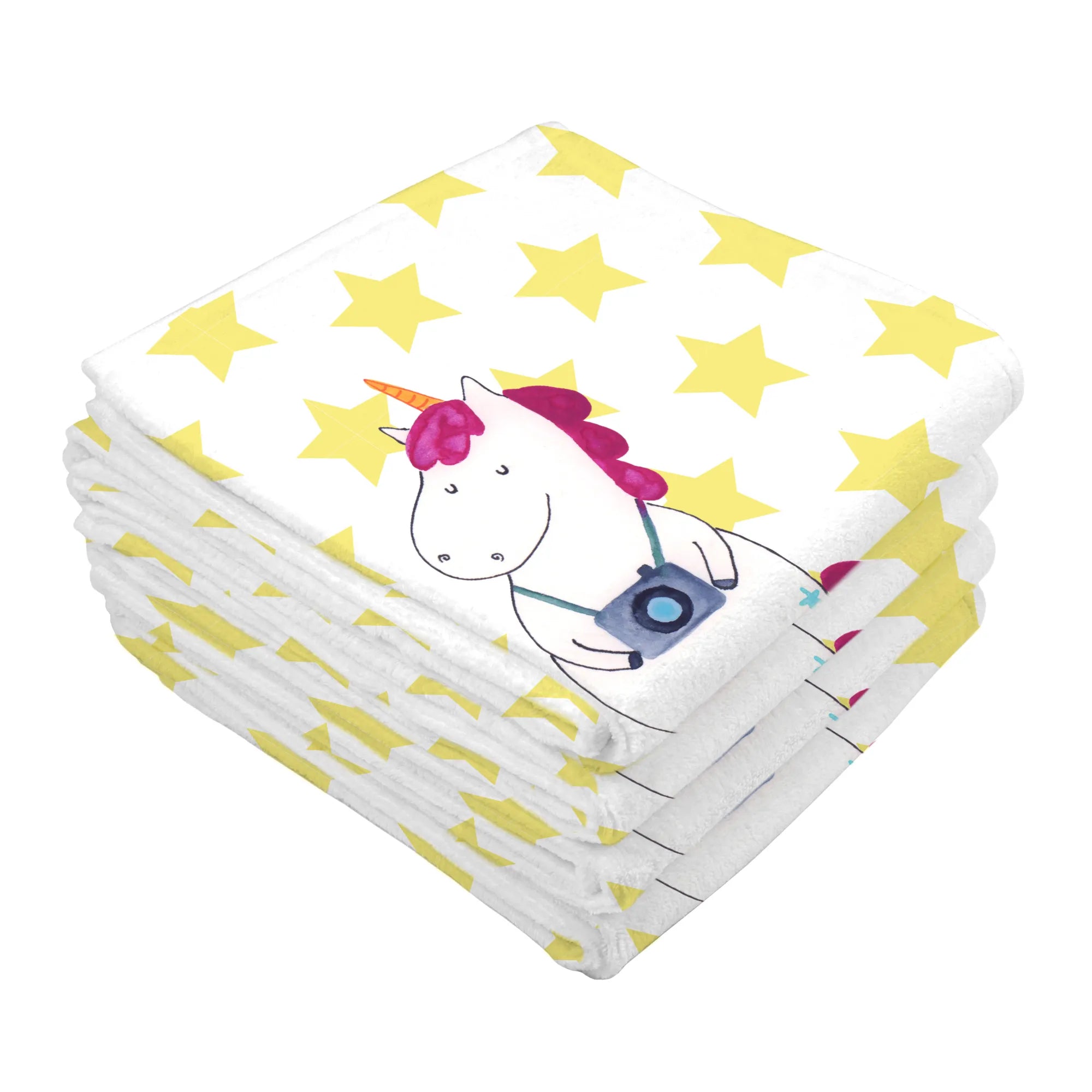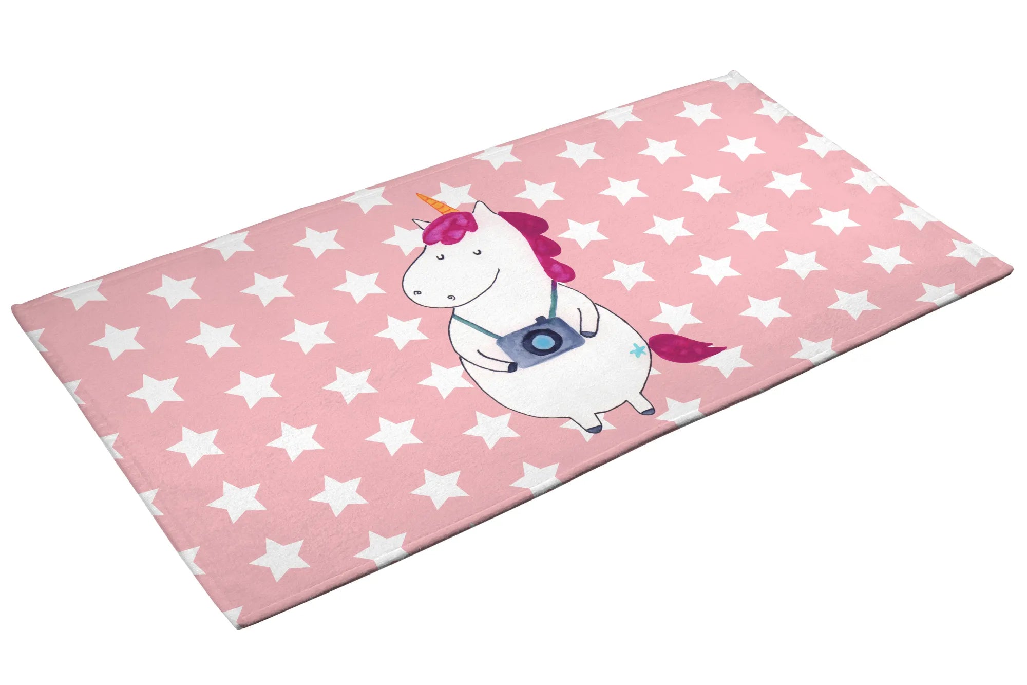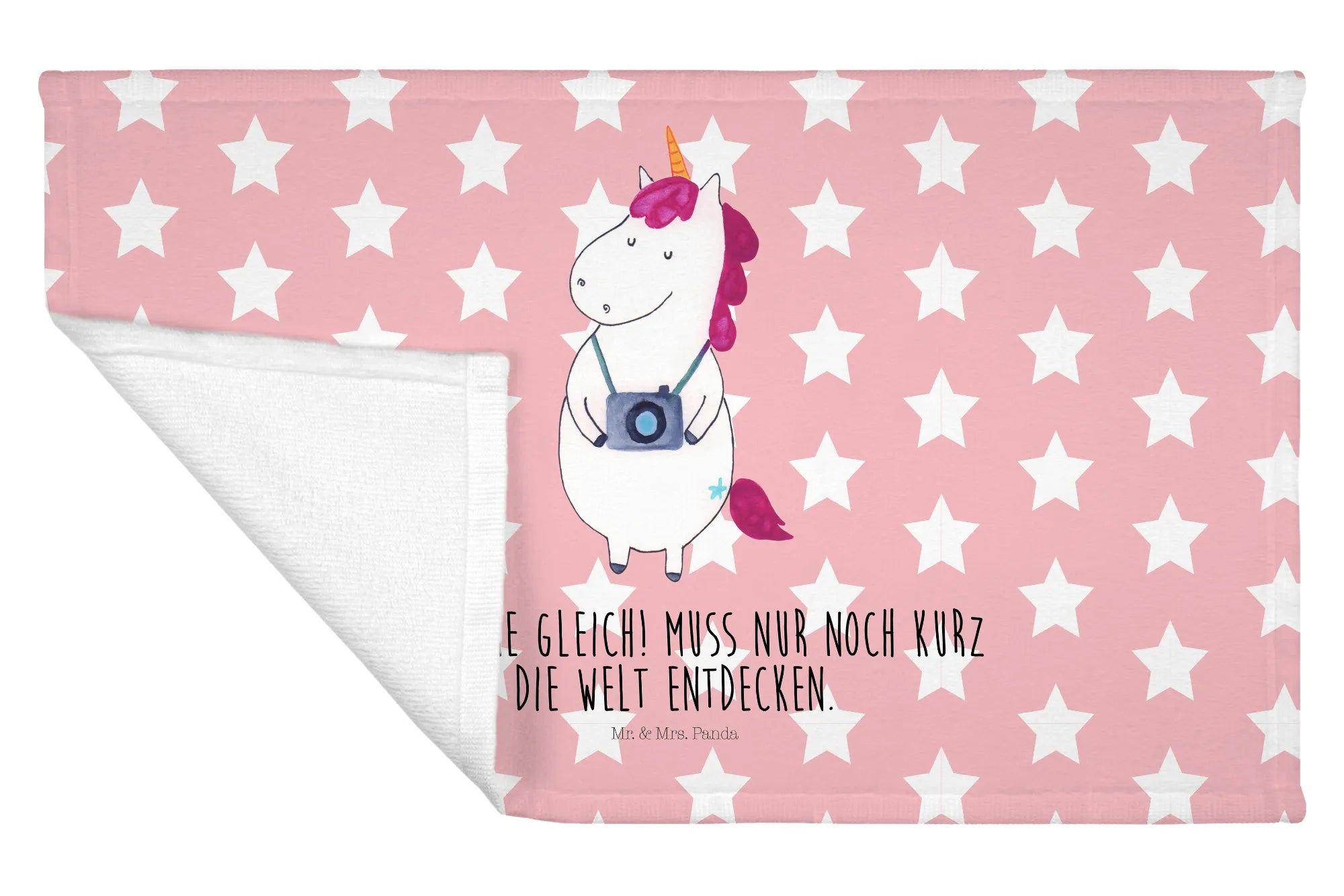 Das 50 x 100 Handtuch mit dem zauberhaften Einhorn Fotografen von Mr. & Mrs. Panda ist das perfekte Geschenk für alle Weltenbummler und Einhornliebhaber! Es bringt mit seinem bunten, hochwertigen Druck ein Lächeln in jedes Badezimmer und eignet sich hervorragend für die tägliche Gesichtspflege oder einfach für den Alltag.