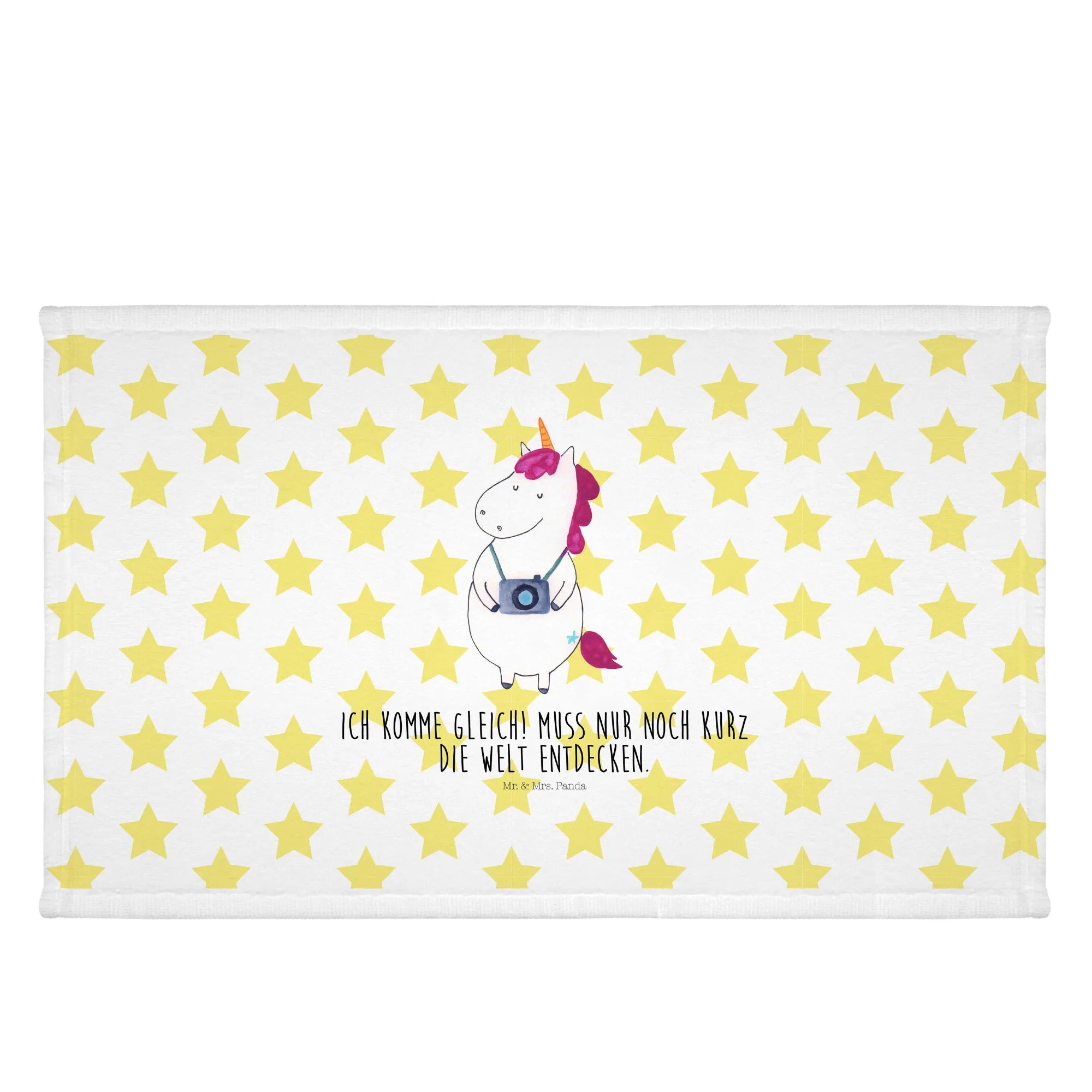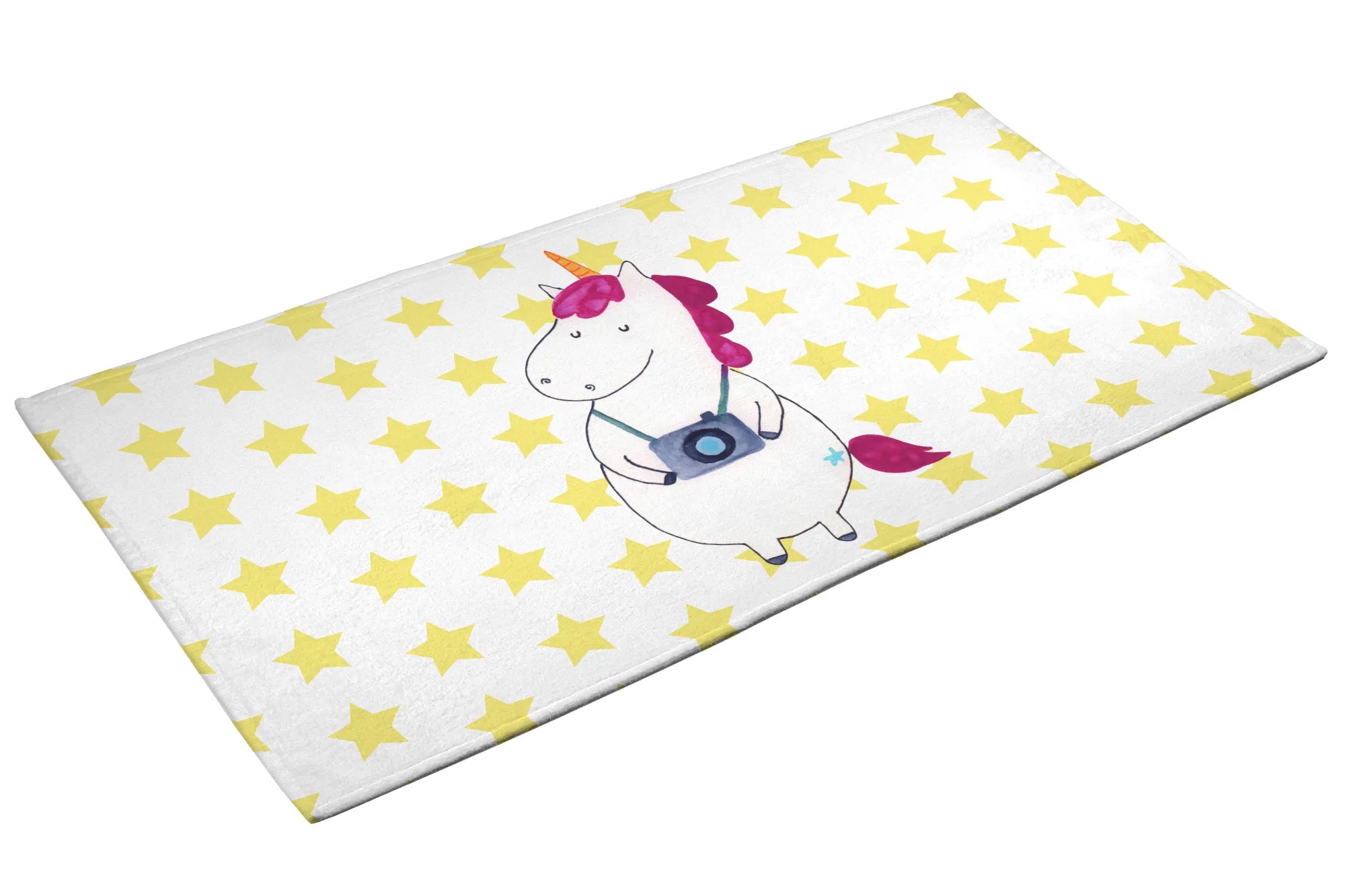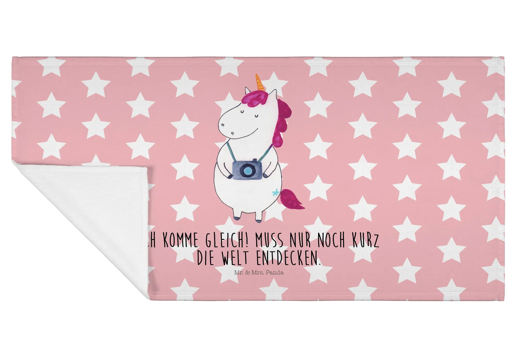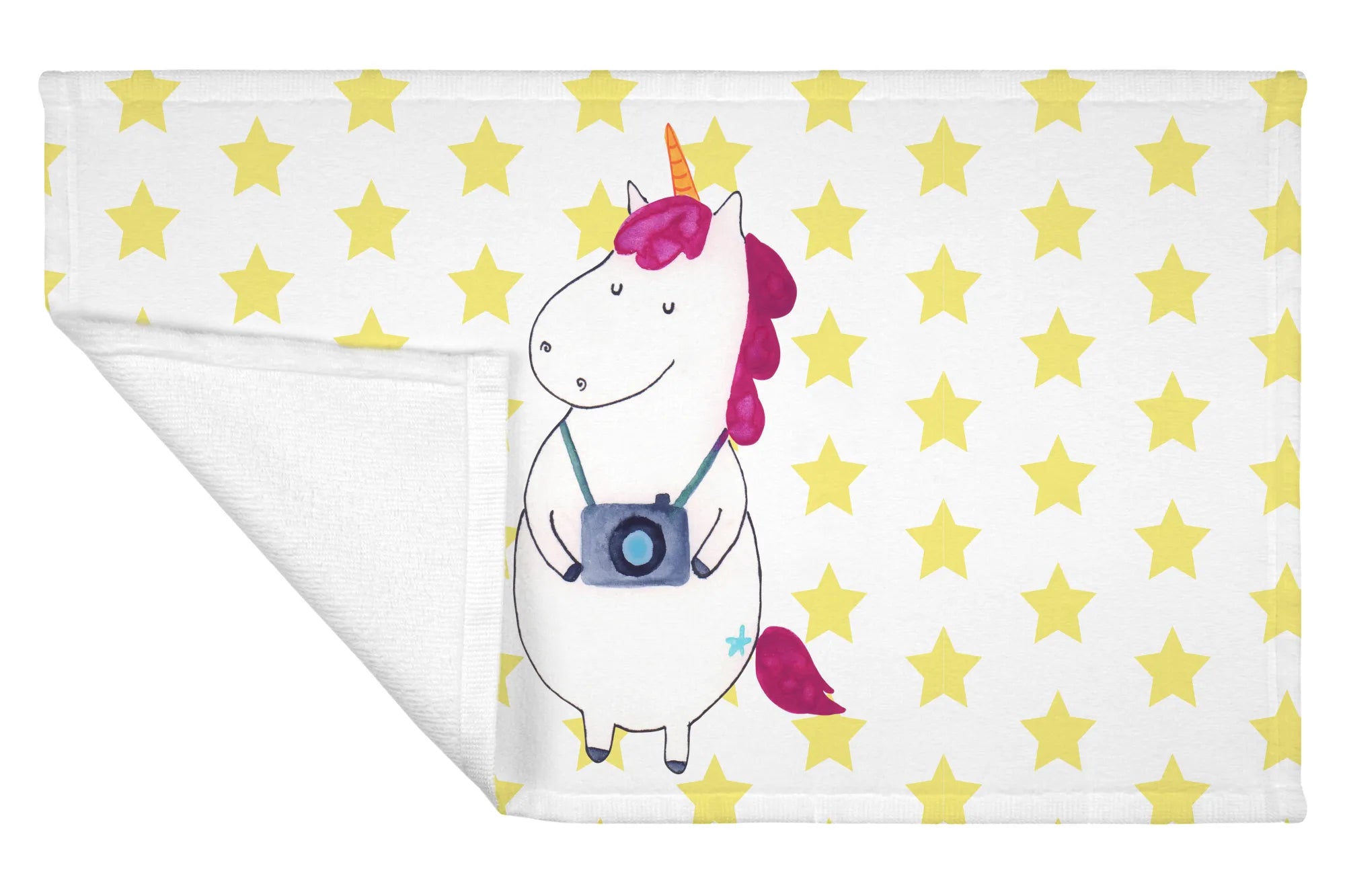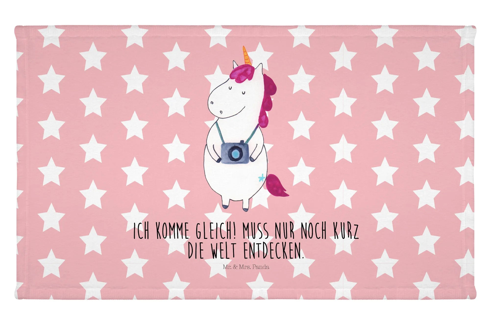 Das 50 x 100 Handtuch mit dem zauberhaften Einhorn Fotografen von Mr. & Mrs. Panda ist das perfekte Geschenk für alle Weltenbummler und Einhornliebhaber! Es bringt mit seinem bunten, hochwertigen Druck ein Lächeln in jedes Badezimmer und eignet sich hervorragend für die tägliche Gesichtspflege oder einfach für den Alltag.