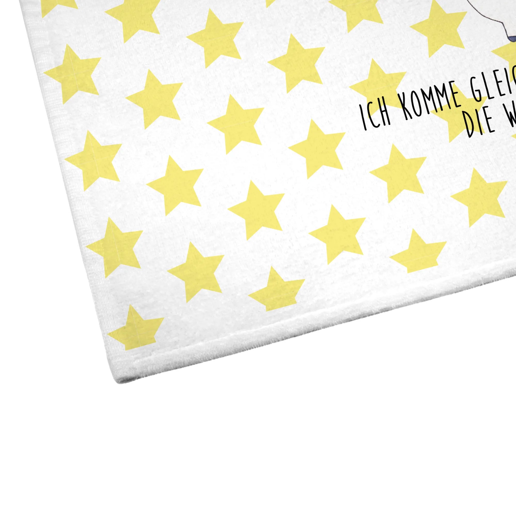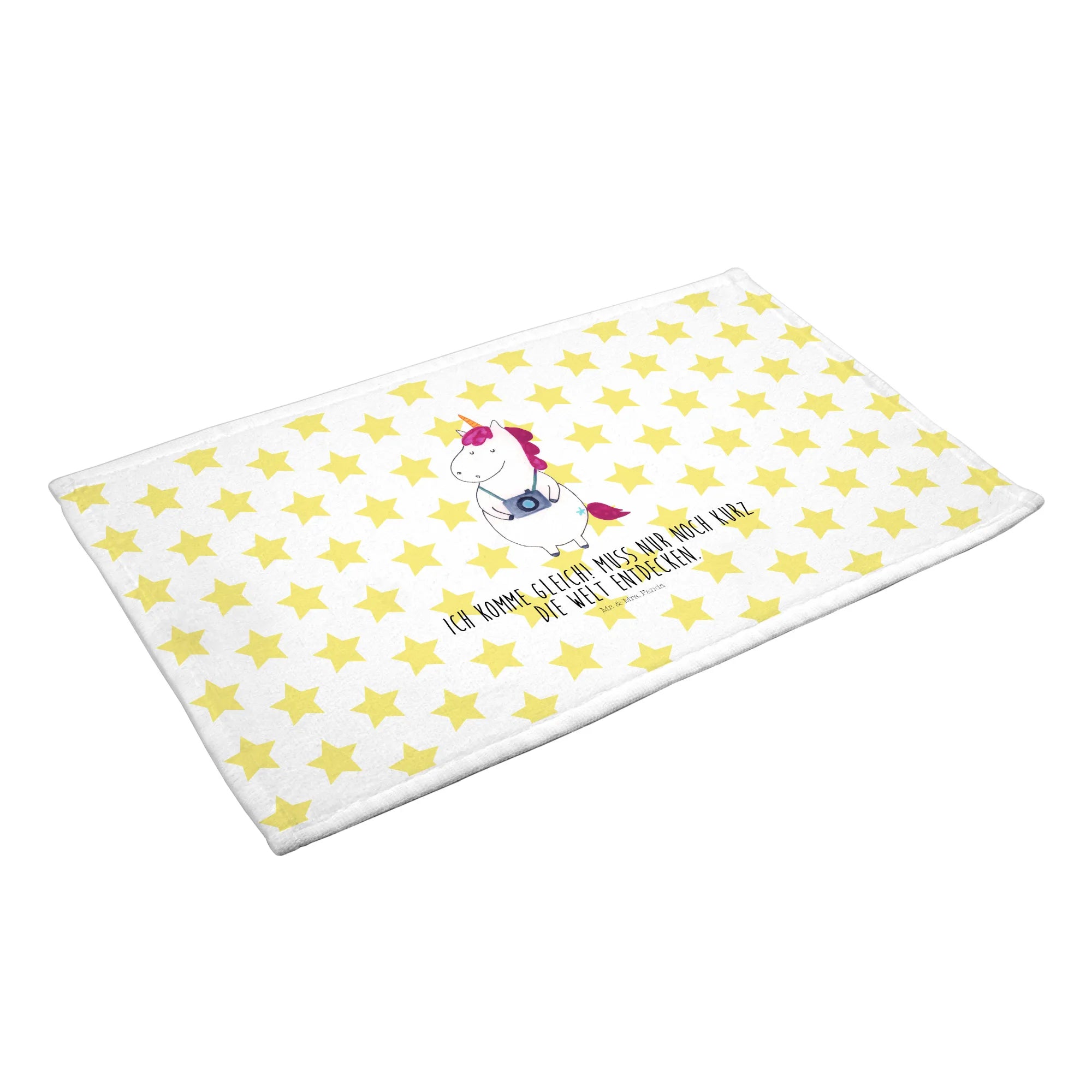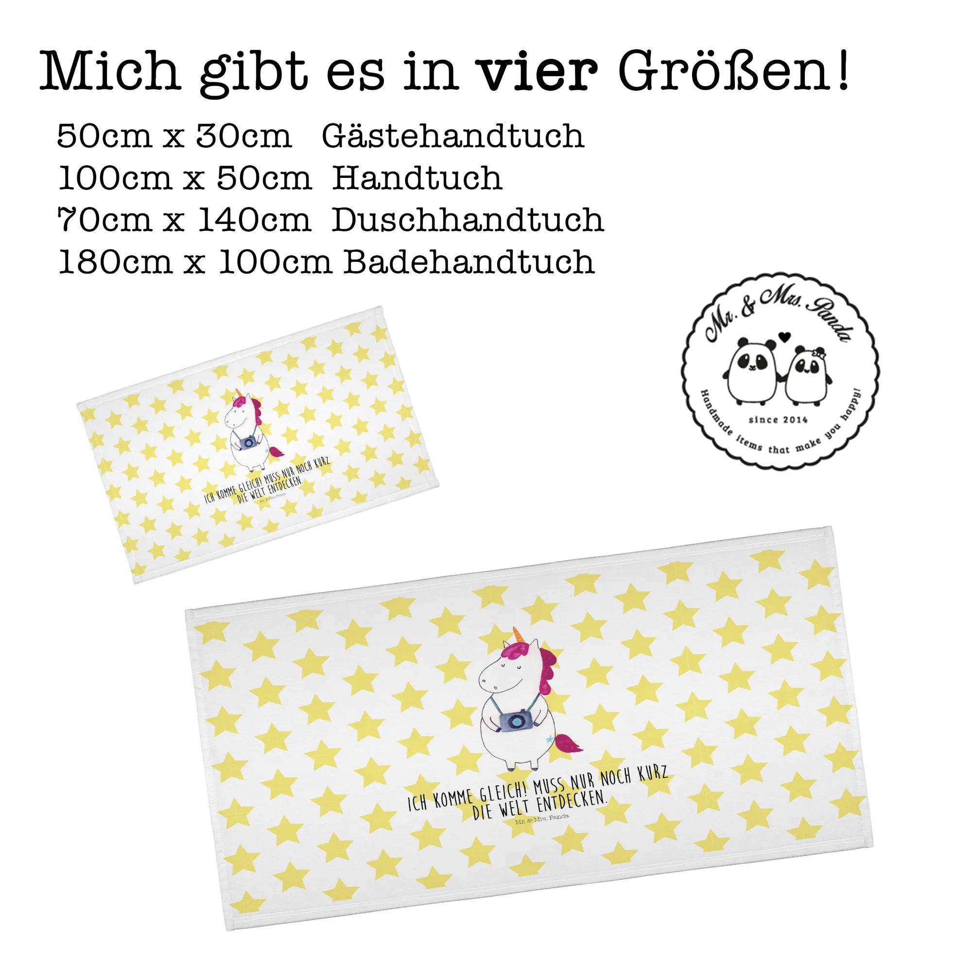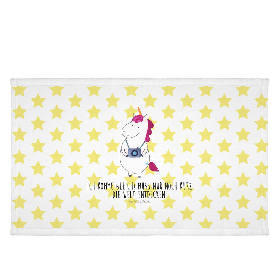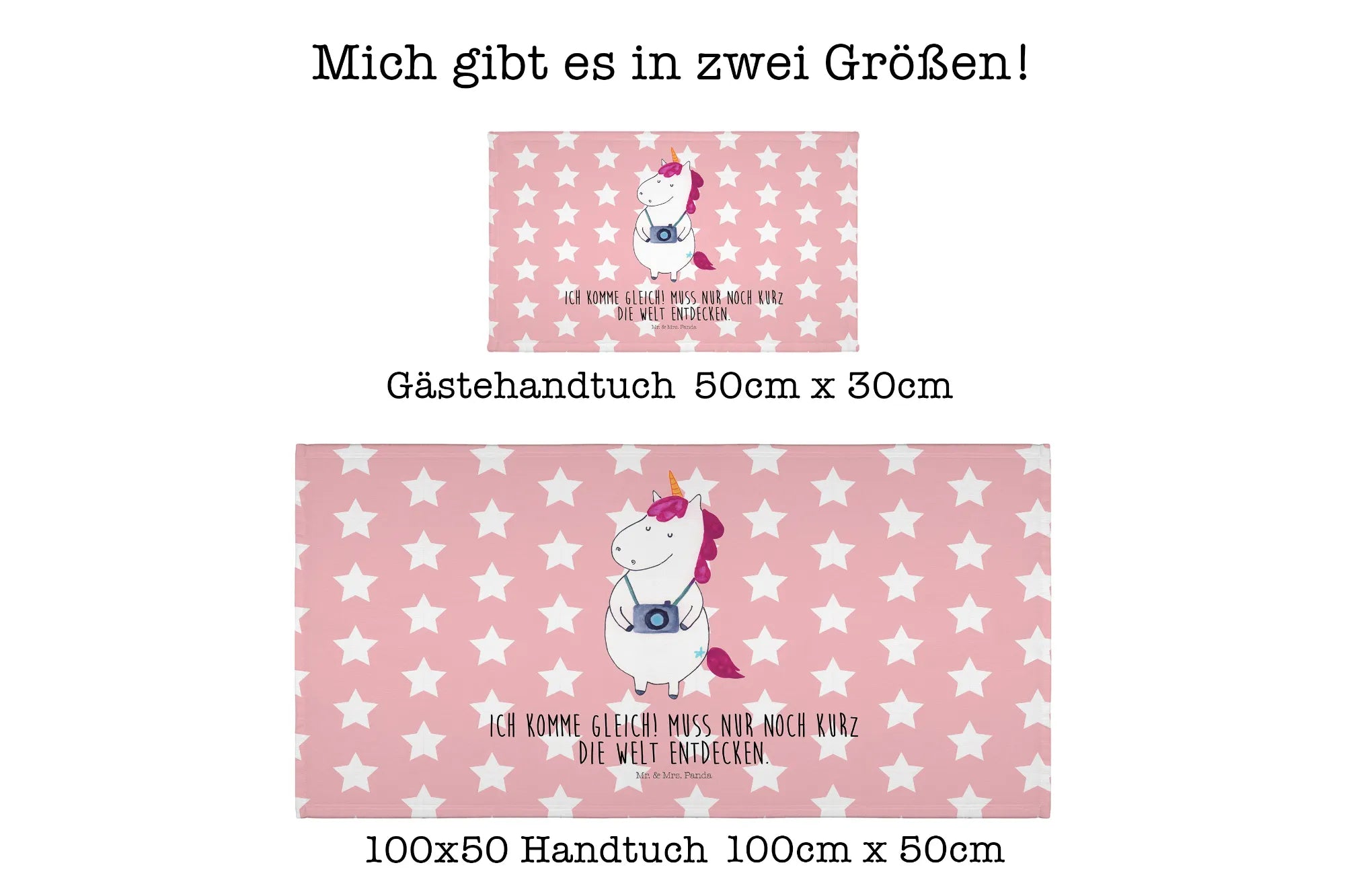 Das wunderschöne Gästehandtuch mit dem zauberhaften Einhorn Fotograf Motiv von Mr. & Mrs. Panda ist das perfekte Geschenk für alle, die das Reisen lieben und ein Herz für Einhörner haben! Mit dem Slogan "Ich komme gleich! Muss nur noch kurz die Welt entdecken." bringt das Handtuch eine fröhliche Note in jedes Badezimmer.