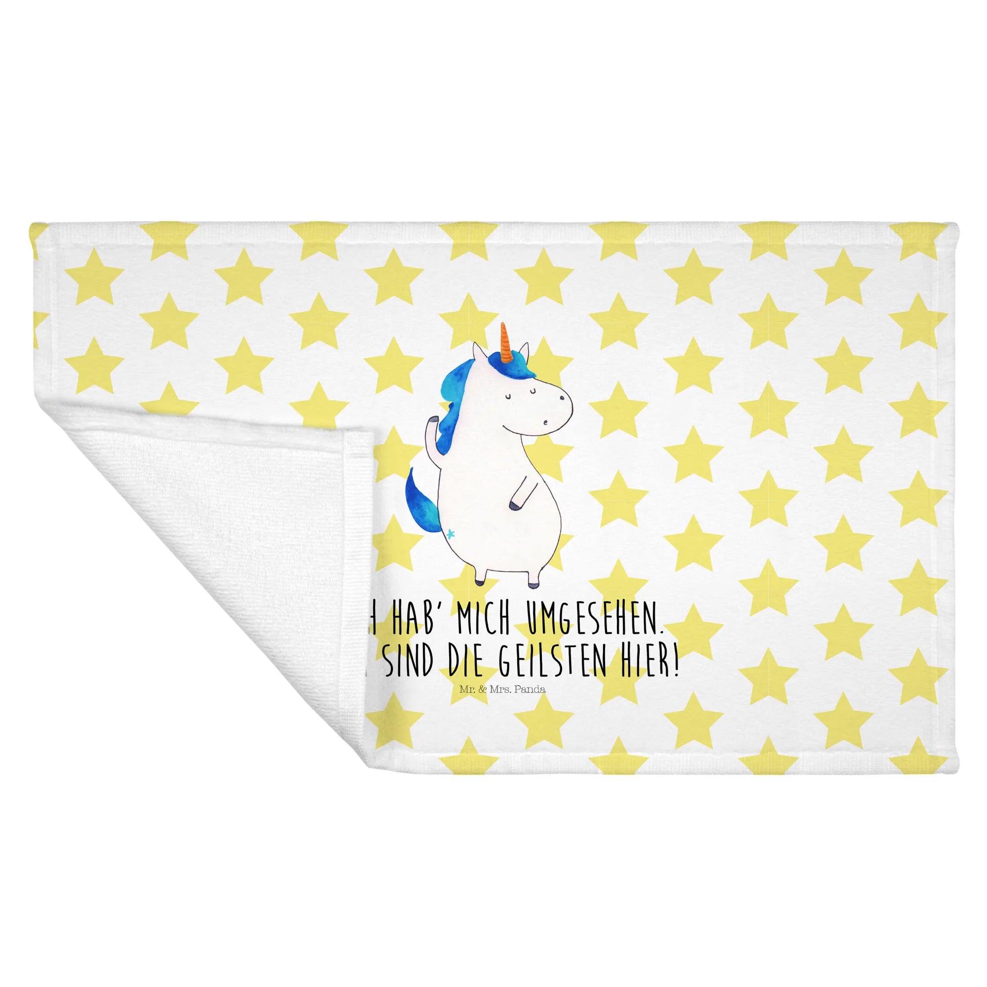 Das wunderschöne Gästehandtuch von Mr. & Mrs. Panda mit dem süßen Einhorn-Mann-Motiv ist das perfekte Geschenk für alle, die Einhörner lieben! Dieses flauschige Handtuch ist nicht nur praktisch, sondern verleiht jedem Badezimmer einen fröhlichen und bunten Akzent. Es misst 300 mm x 500 mm und besteht aus einer hochwertigen Baumwollmischung, die sich super weich anfühlt und angenehm auf der Haut ist. Mit einem tollen Spruch "Ich hab' mich umgesehen. Wir sind die Geilsten hier!"druckt es das Selbstbewusstsein und die Freude des Einhorns perfekt aus.