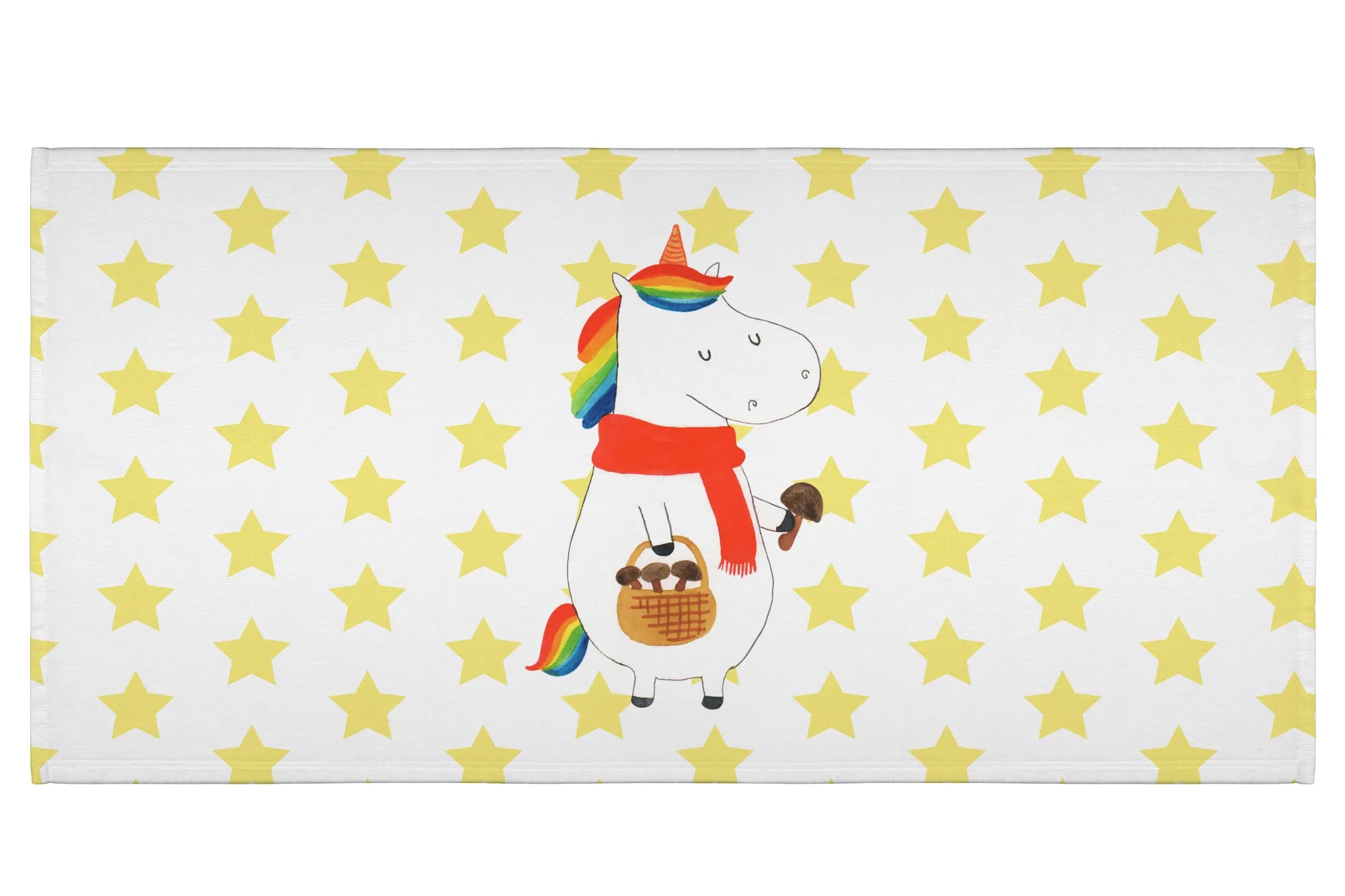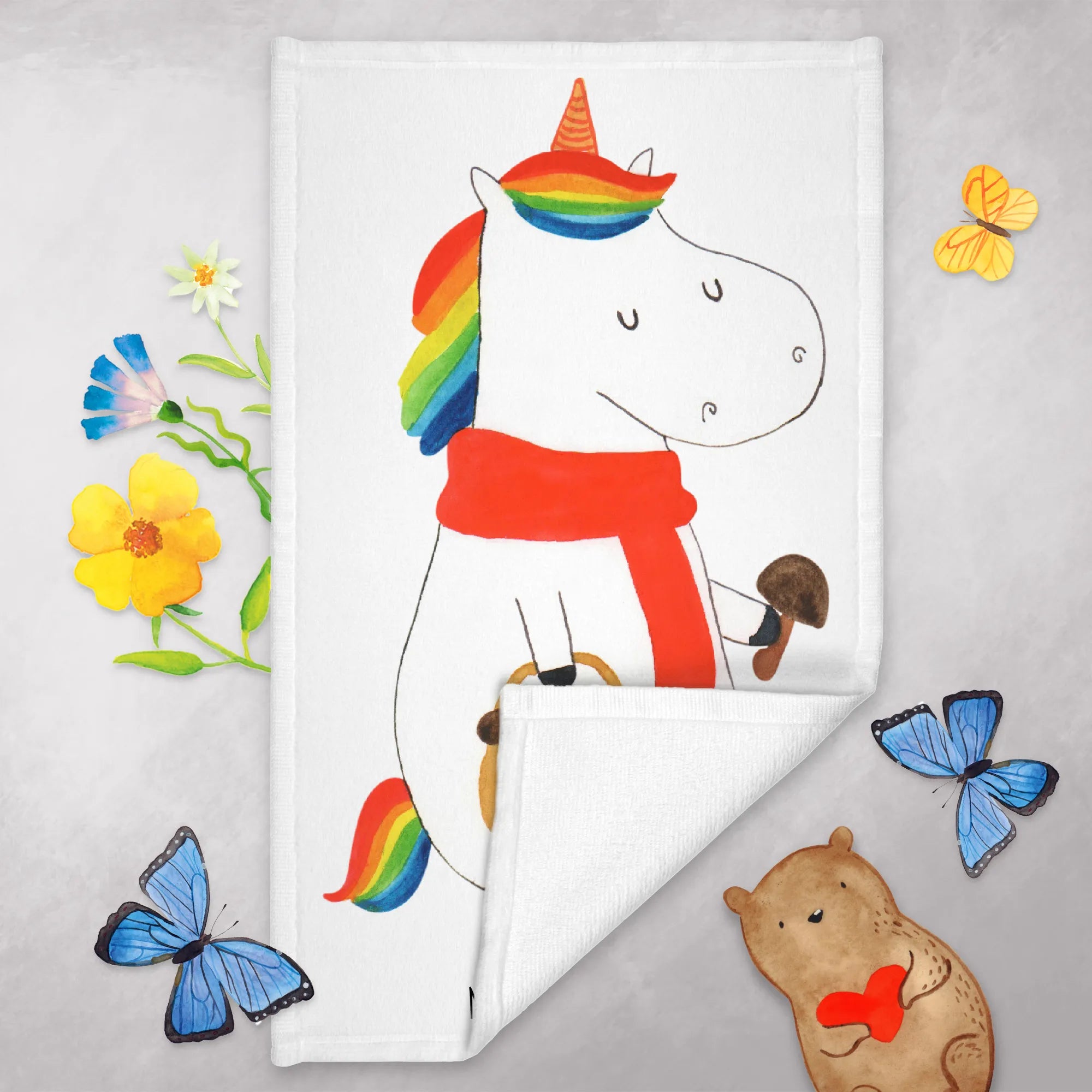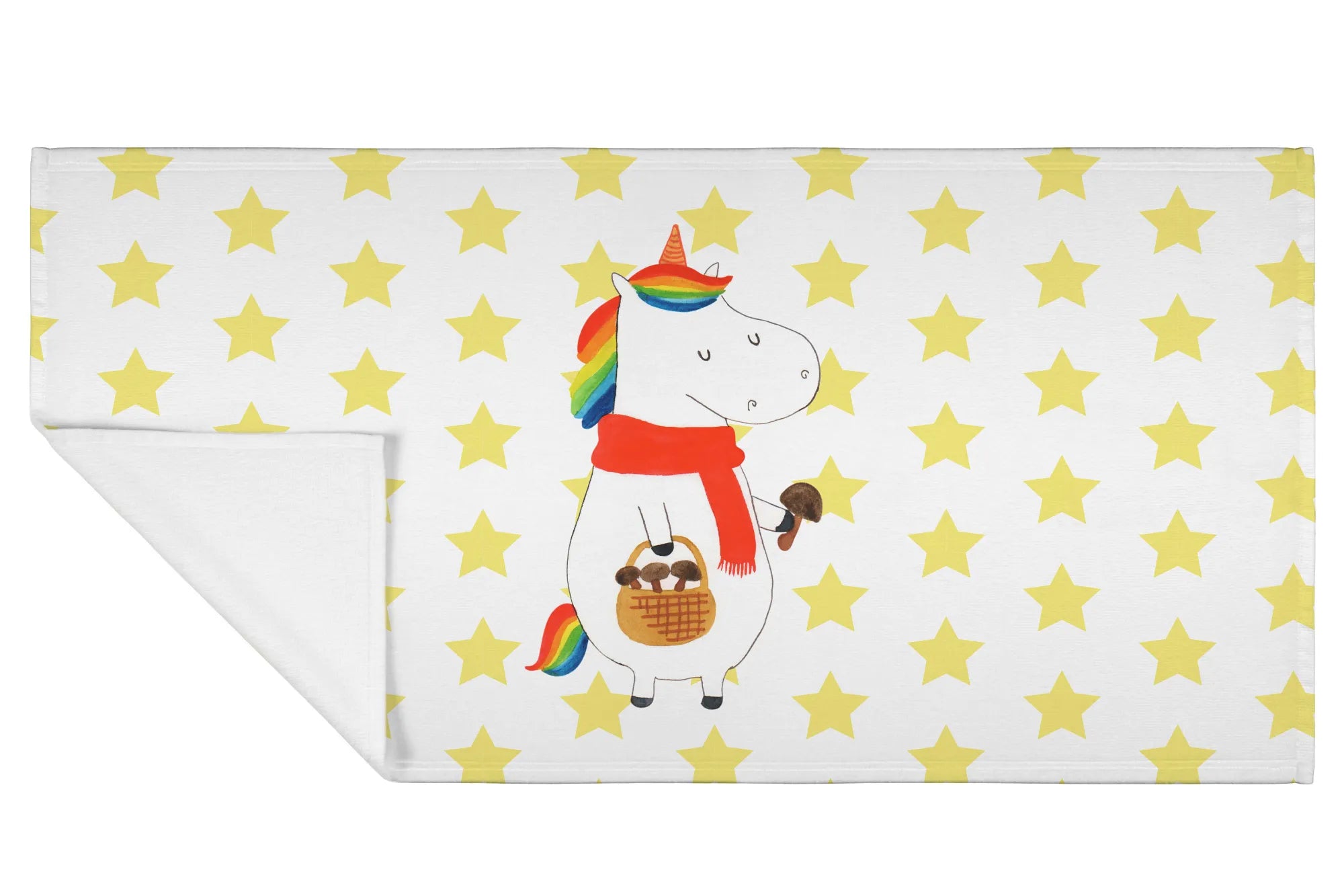 Jeder Zentimeter des Handtuchs ist mit einer bunten, liebevollen Illustration eines fröhlichen Einhorns verziert, das im Wald nach Pilzen sucht. Diese liebevoll handgezeichnete Grafik bringt die zauberhafte Welt der Einhörner direkt in dein Zuhause.