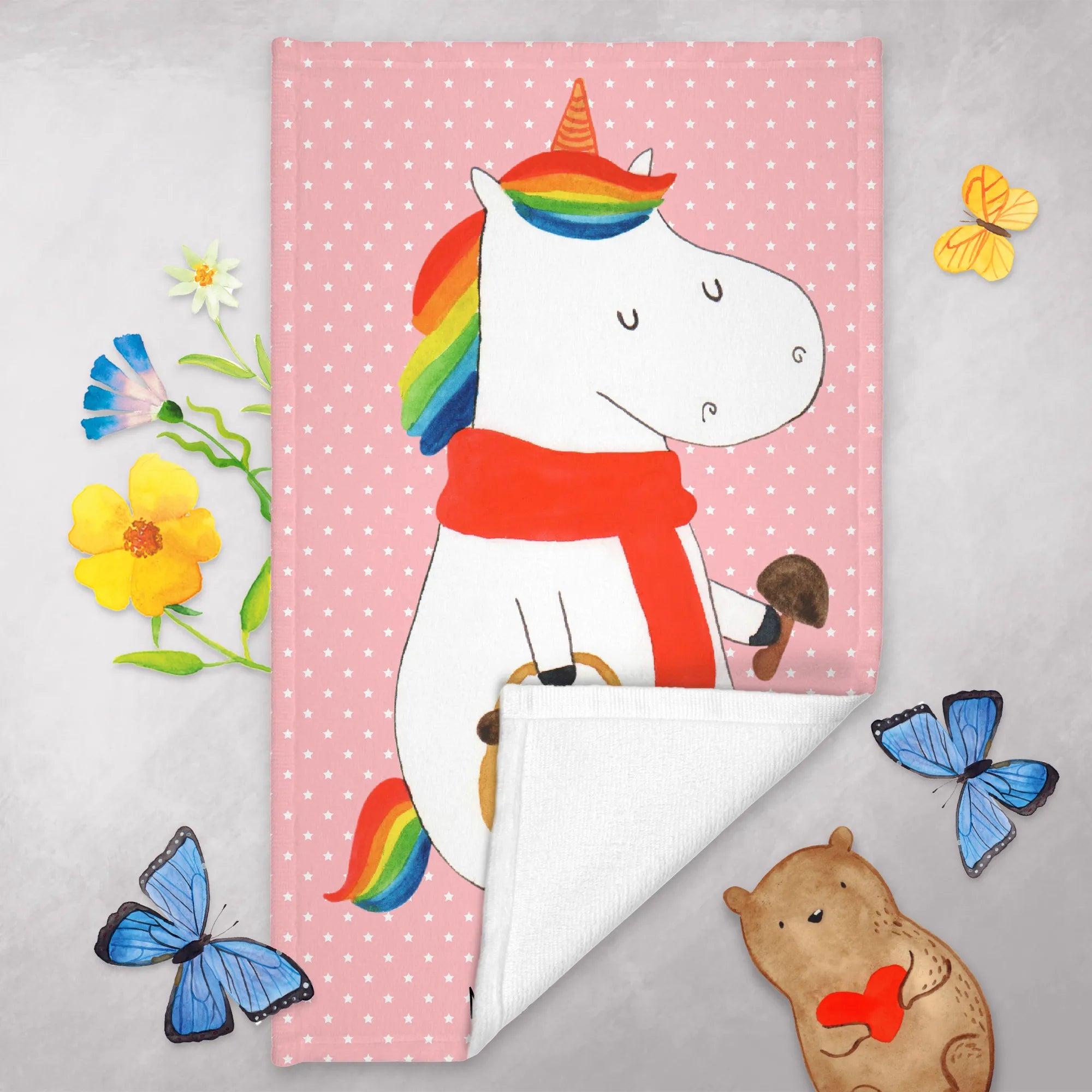 Entdecke das zauberhafte 50 x 100 Handtuch mit dem wunderschönen Einhorn Pilz Motiv aus der einzigartigen Einhorn - Kollektion von Mr. & Mrs. Panda!