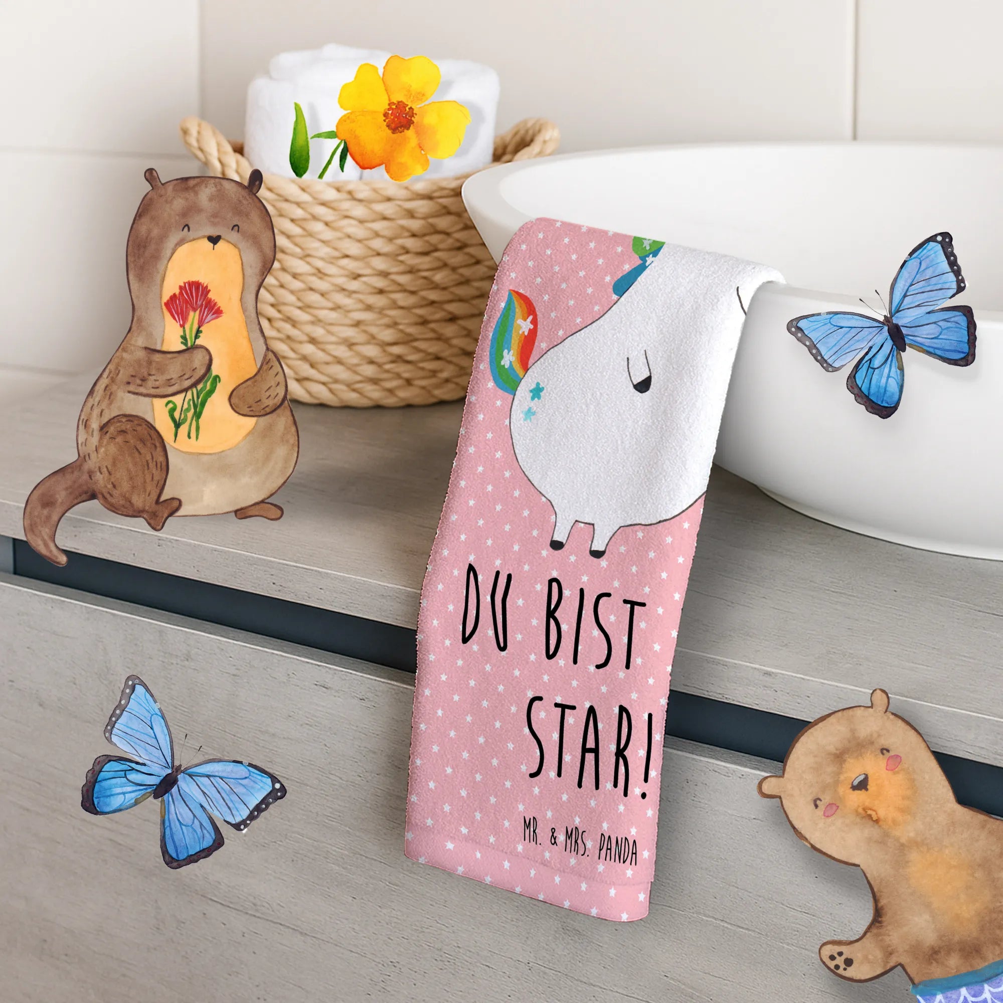 Die besondere Einhorn-Kollektion vereint flauschige Materialien mit liebevoll handgezeichneten Motiven, die sowohl Kinder als auch Erwachsene begeistern. Das Handtuch ist hochwertig aus einer weichen Baumwollmischung gefertigt und somit besonders sanft zur Haut. Mit den strahlenden Farben und dem süßen Spruch „Du bist ein Star!“ wird jede Anwendung zu einem kleinen Highlight im Alltag.