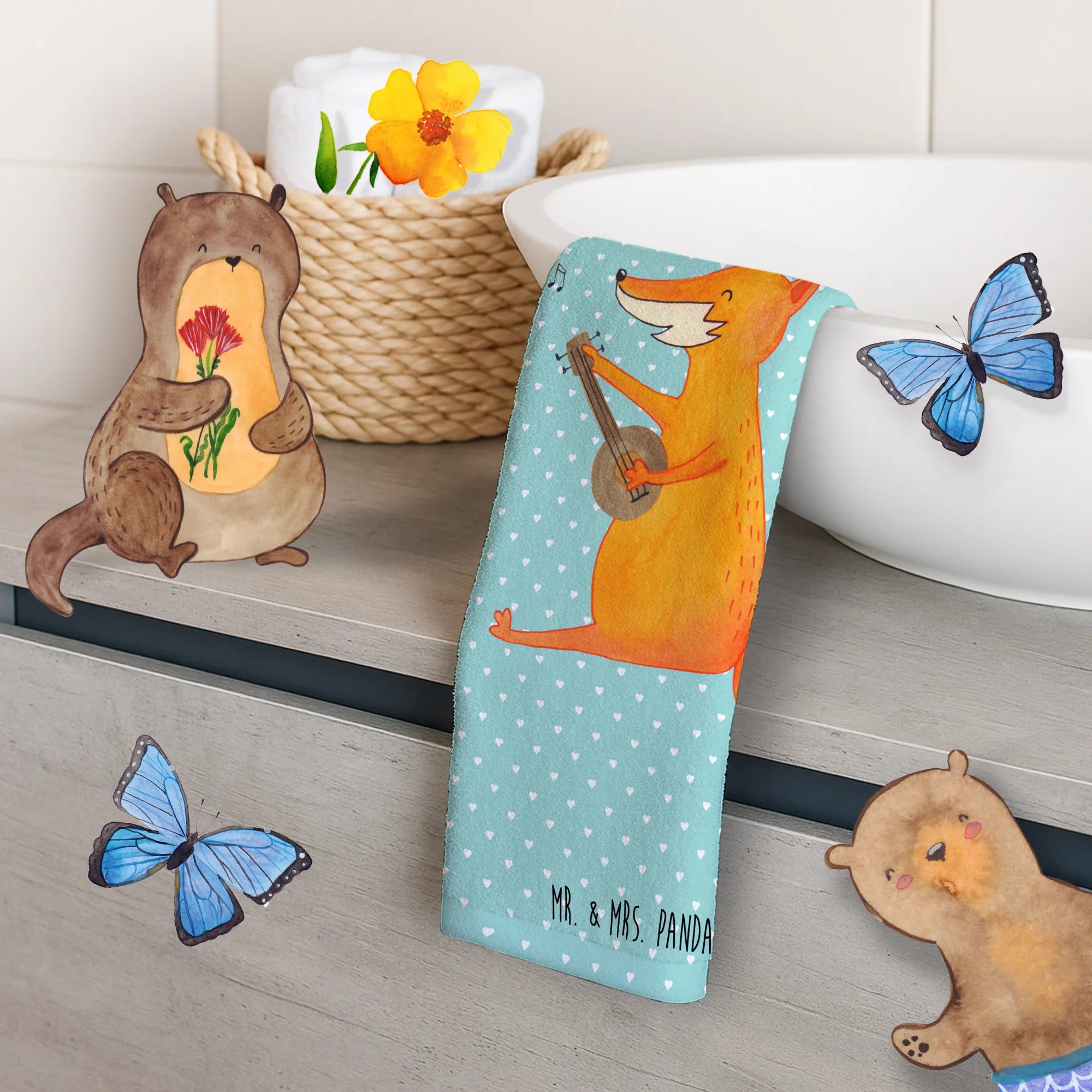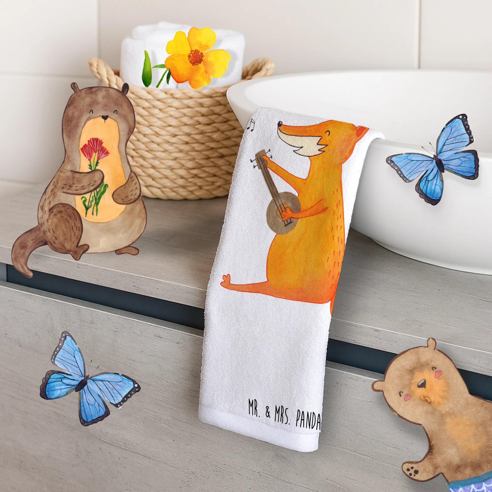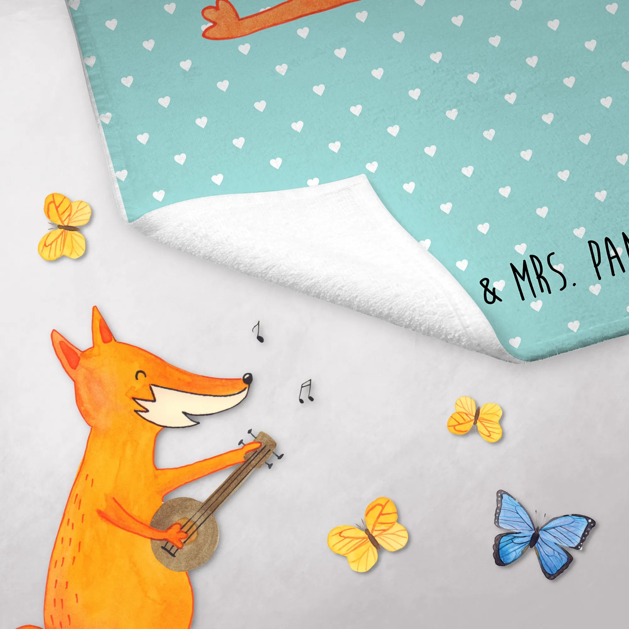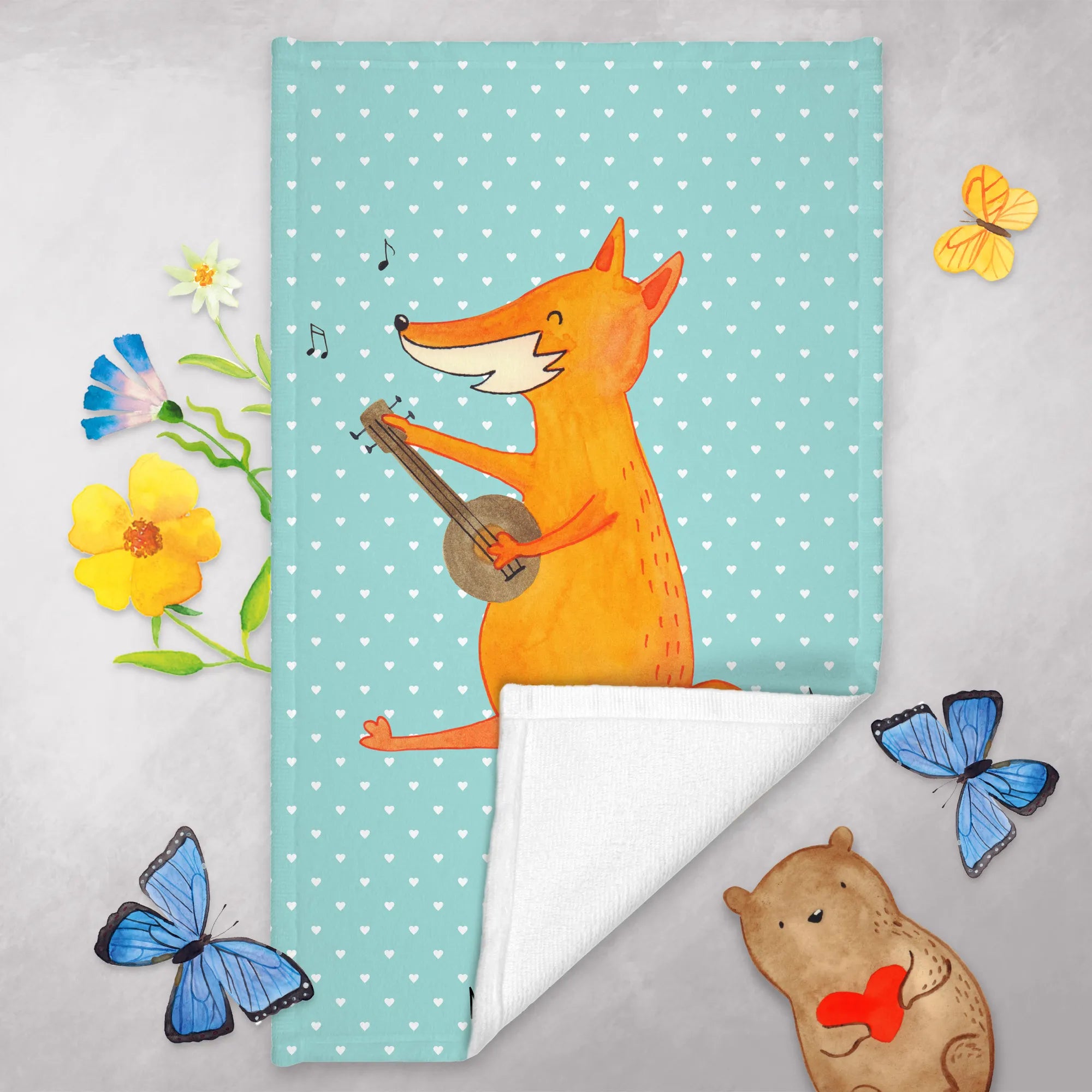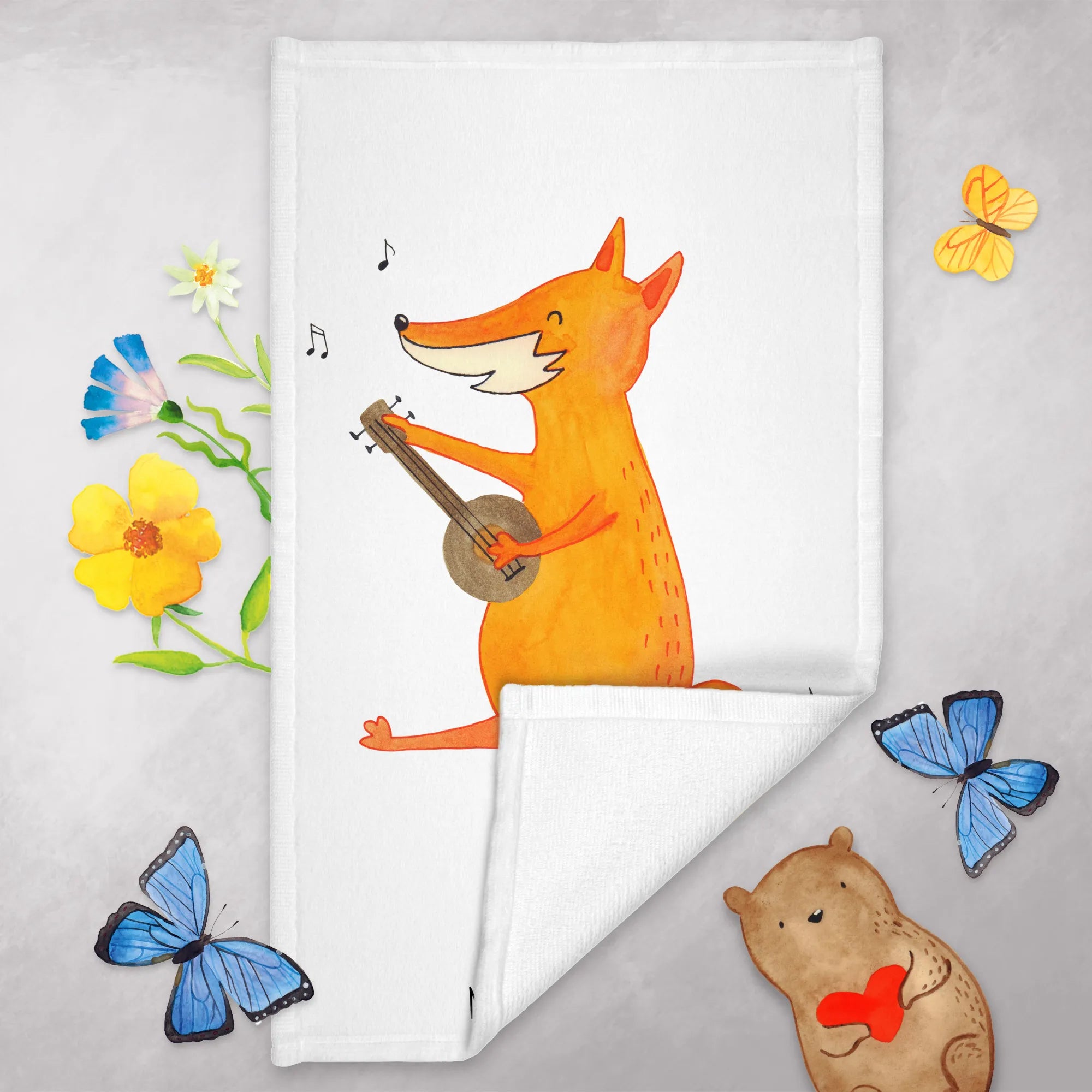 Das zwanzig mal dreißig Zentimeter große Handtuch von Mr. & Mrs. Panda bietet eine wunderbare Kombination aus Funktionalität und einem bezaubernden Design. Mit einem niedlichen Fuchs, der stolz seine Gitarre spielt, wird jedes Badezimmer zum Leben erweckt.