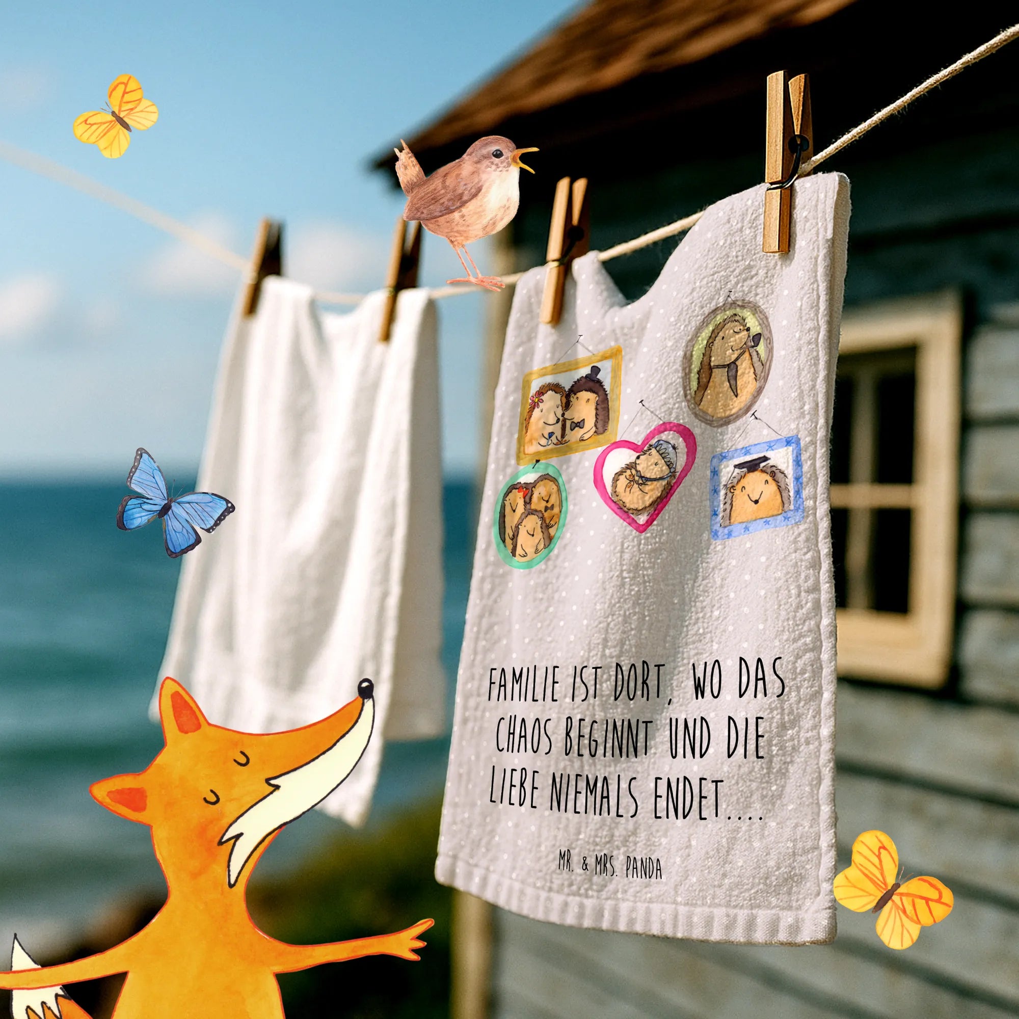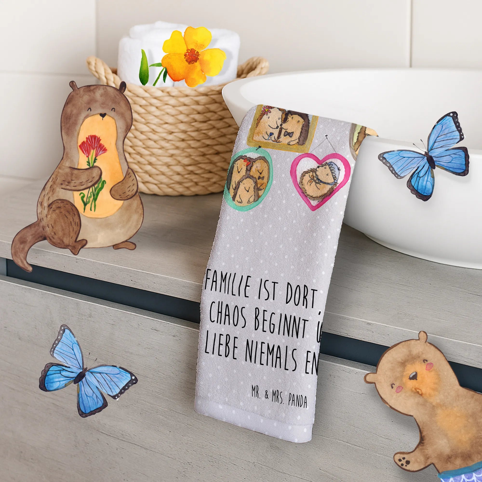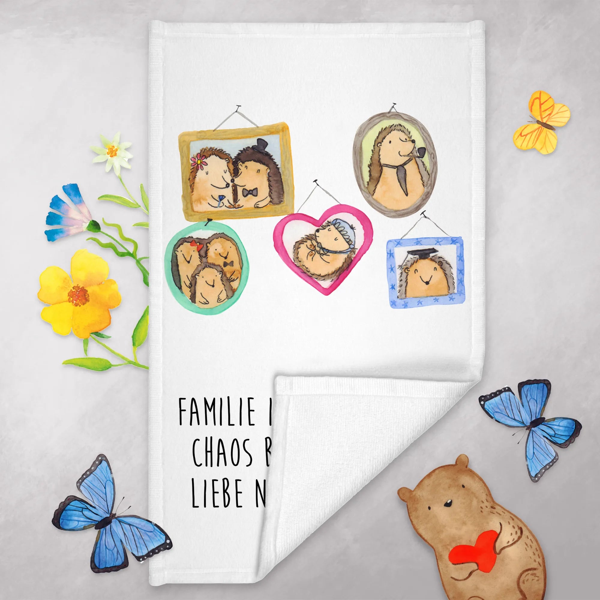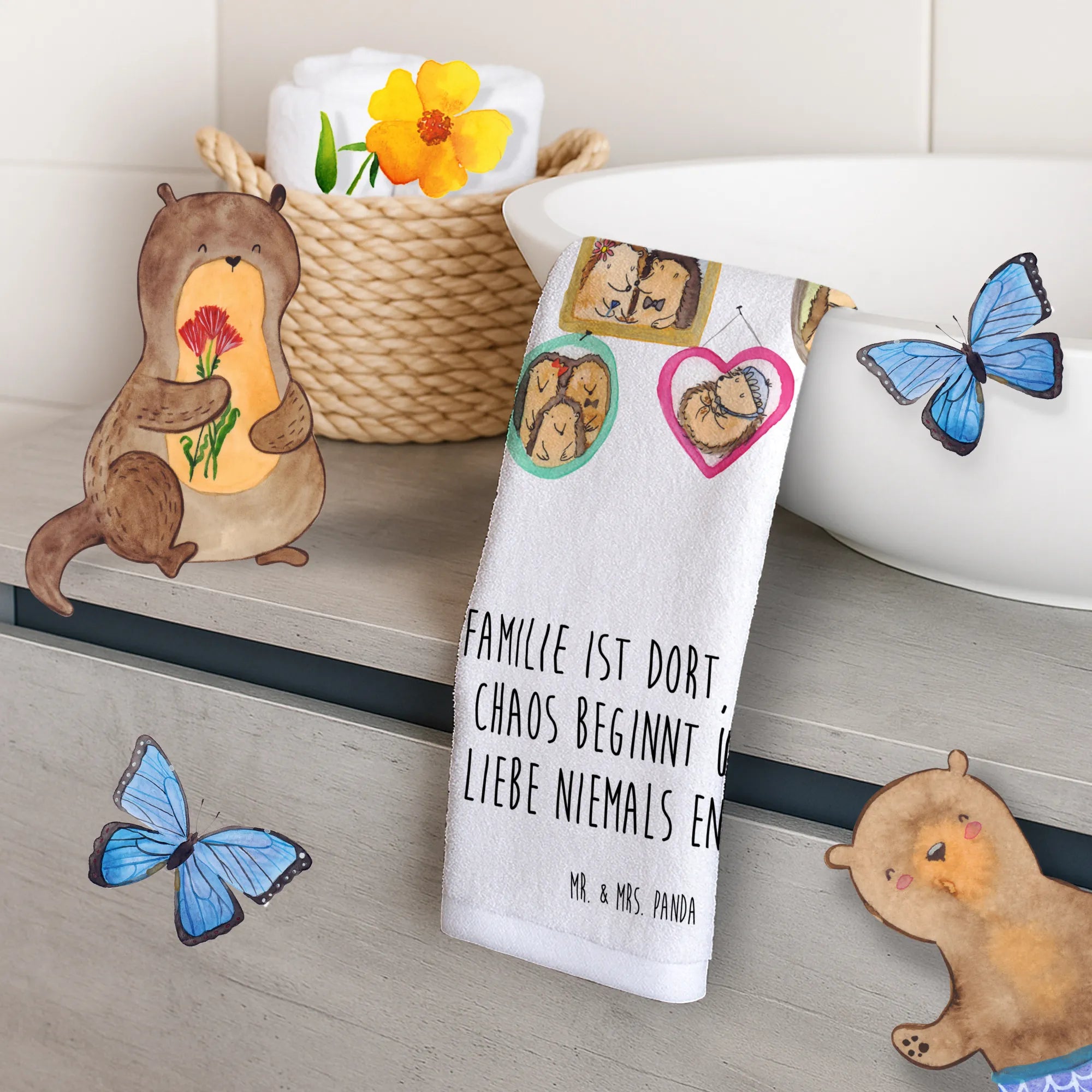 Ein Gästehandtuch, das von Herzen kommt: Das Mr. & Mrs. Panda Gästehandtuch „Igel Familie“ bringt fröhliche Farben und warmherzige Motive in dein Badezimmer. Die süße Collage aus Igelfiguren zeigt wichtige Familienmomente und erinnert daran, dass Chaos und Liebe oft nah beieinanderliegen. Ein echtes Wohlfühlstück für dein Gäste-WC.