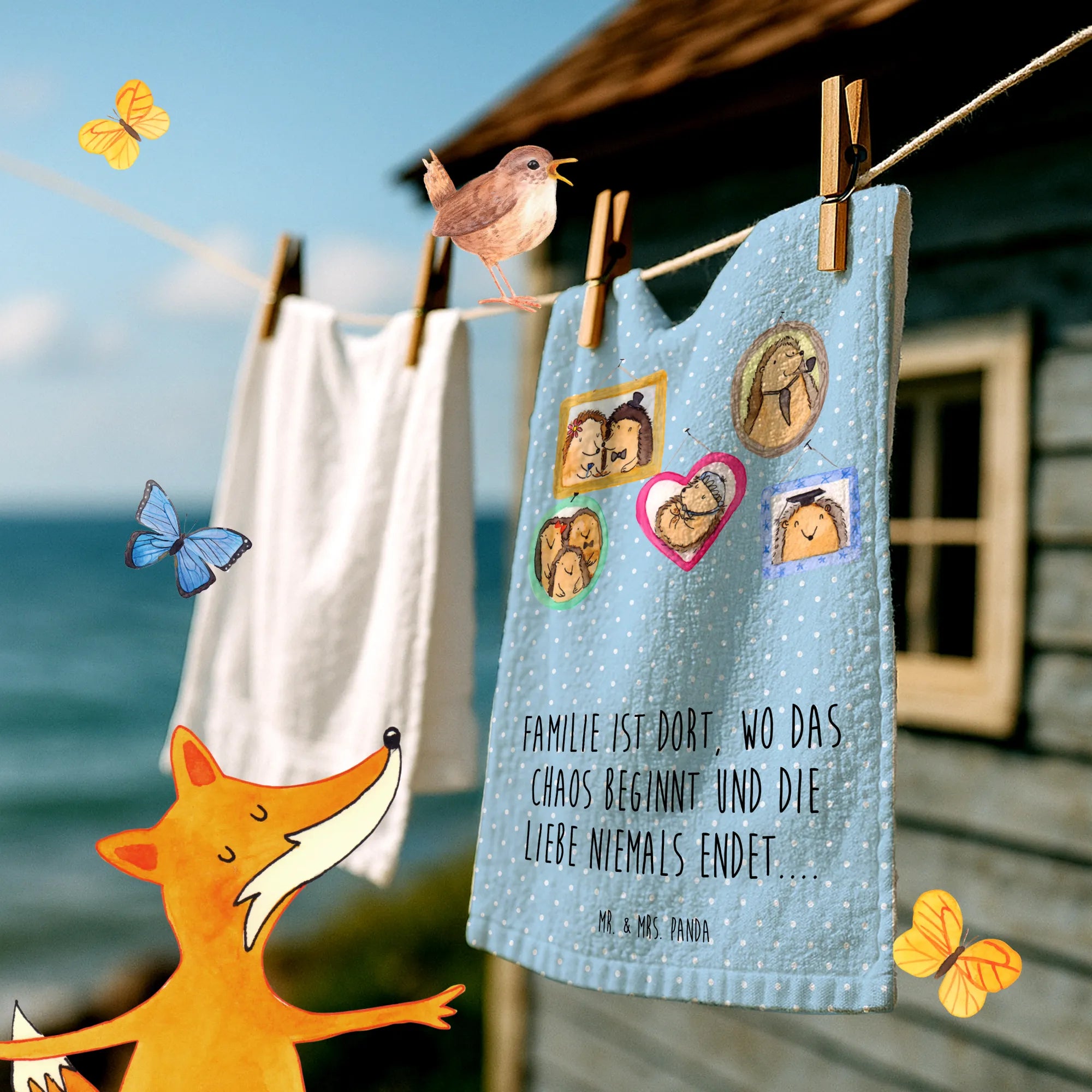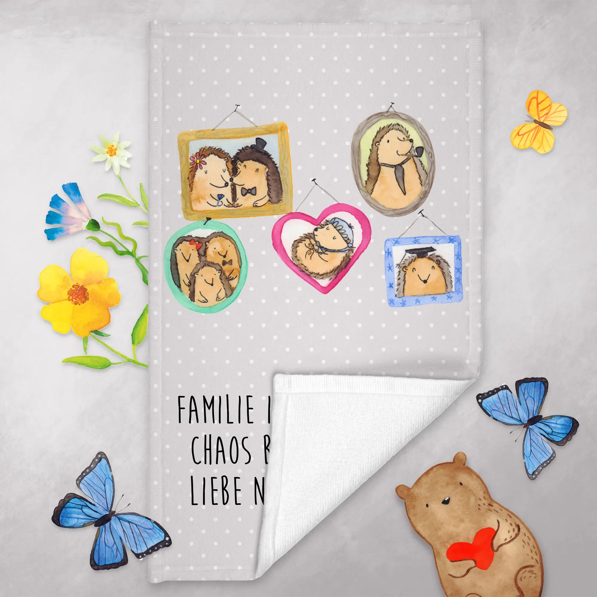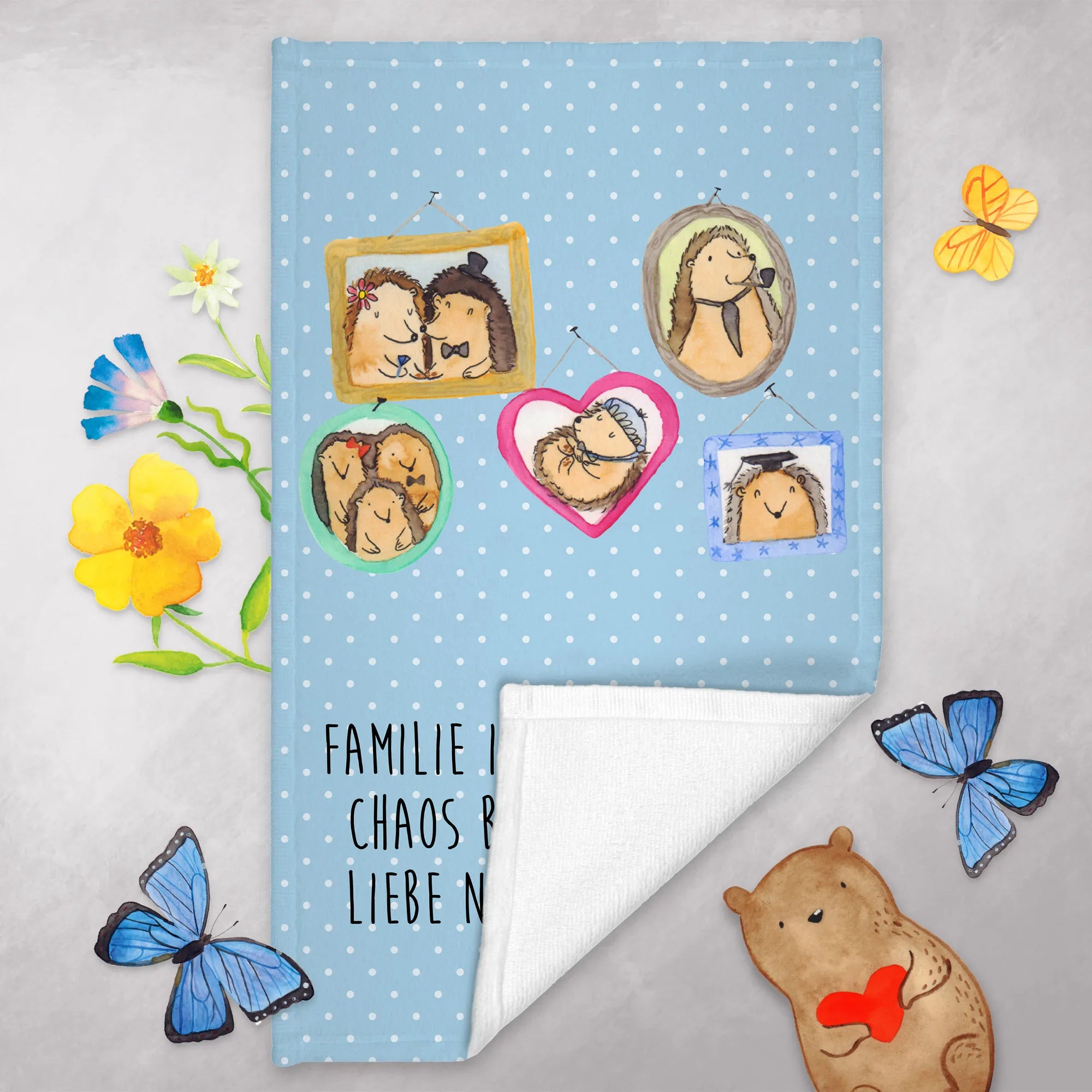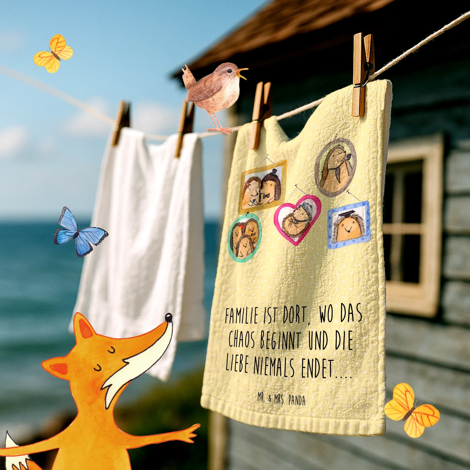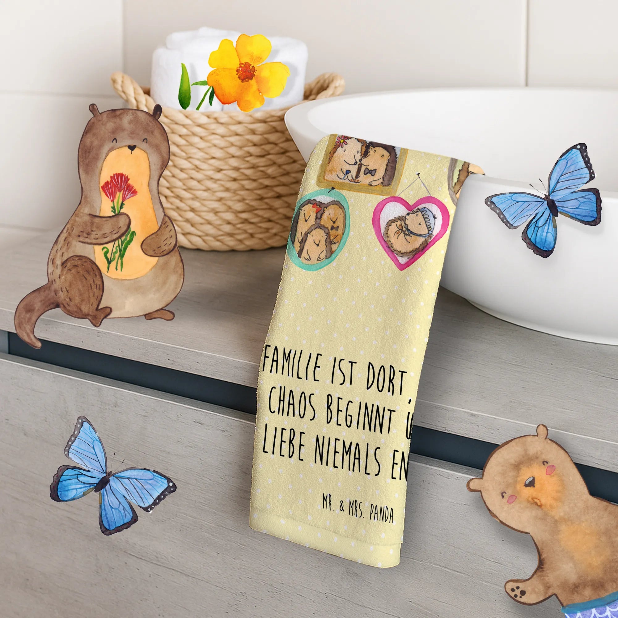 Ein Gästehandtuch, das von Herzen kommt: Das Mr. & Mrs. Panda Gästehandtuch „Igel Familie“ bringt fröhliche Farben und warmherzige Motive in dein Badezimmer. Die süße Collage aus Igelfiguren zeigt wichtige Familienmomente und erinnert daran, dass Chaos und Liebe oft nah beieinanderliegen. Ein echtes Wohlfühlstück für dein Gäste-WC.