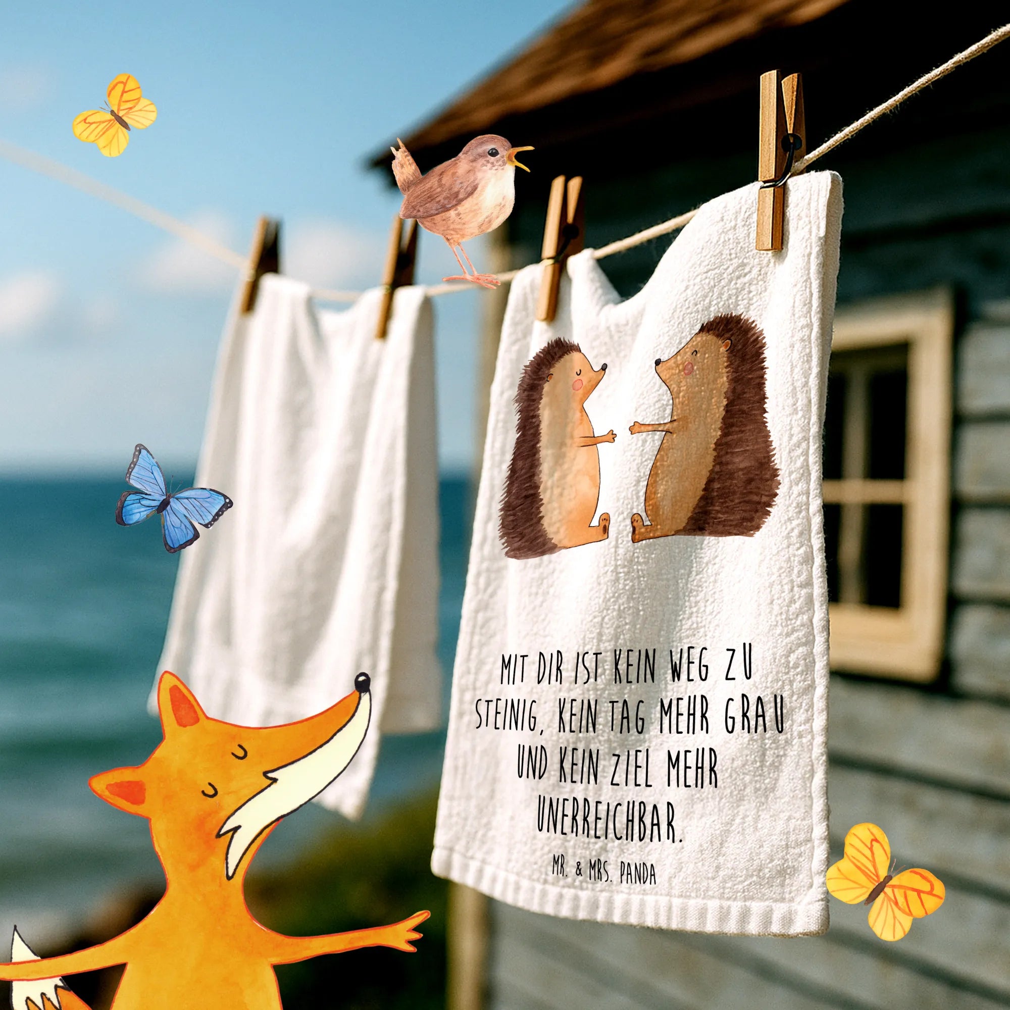 Das Gästehandtuch "Igel Liebe" aus der Mr. & Mrs. Panda Kollektion Liebe ist mehr als nur ein Handtuch – es ist ein liebevolles Geschenk für Verliebte und Gastgeber. Zwei knuffige Igelchen mit rosigen Wangen zueinander gerichtet bringen Wärme, Verbundenheit und gute Laune ins Gäste-WC, Badezimmer oder Gästezimmer. Der dazugehörige Spruch „Mit dir ist kein Weg zu steinig, kein Tag mehr grau und kein Ziel mehr unerreichbar.“ macht das Motiv zu einem wundervollen Liebesbeweis.
