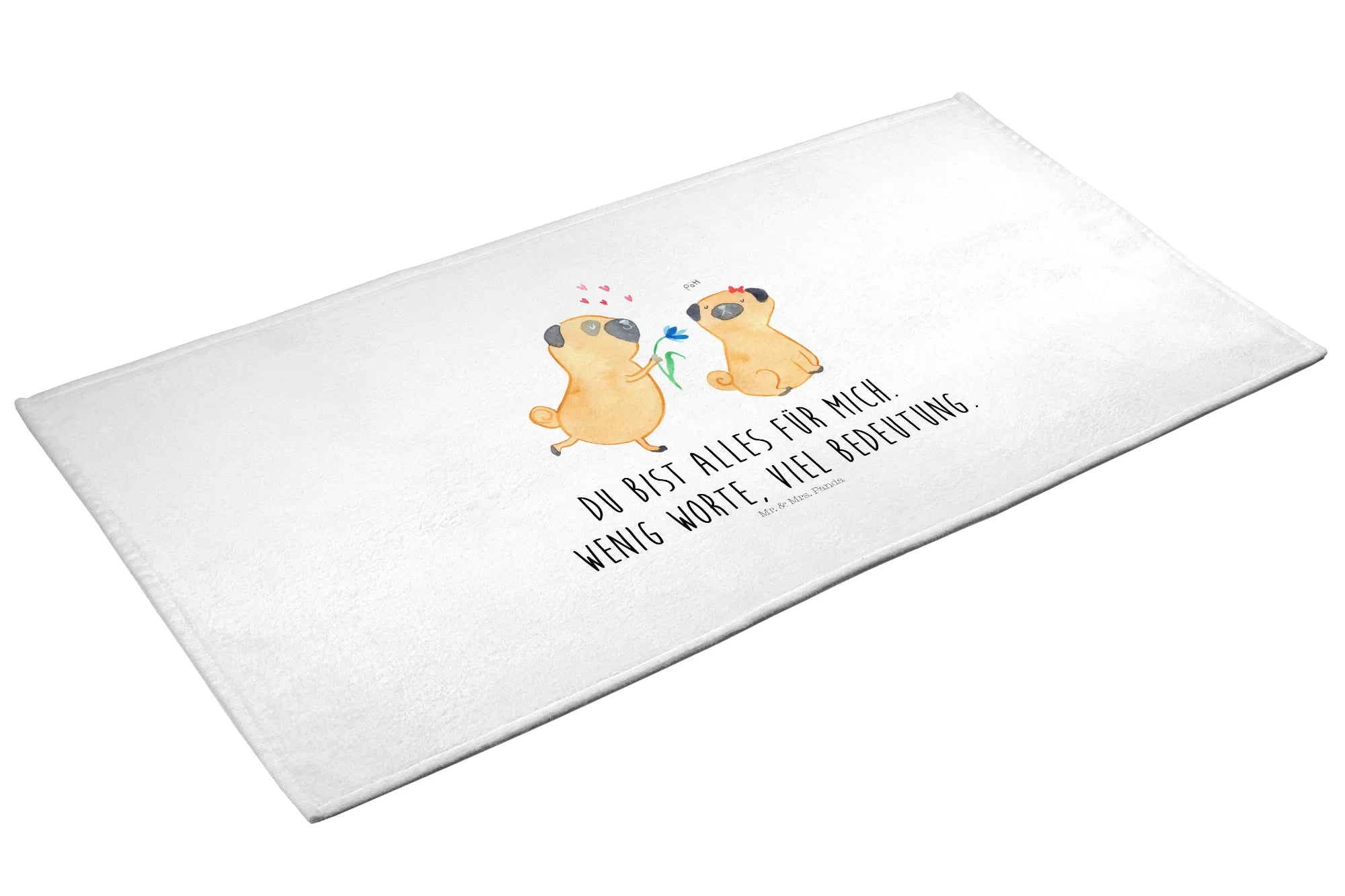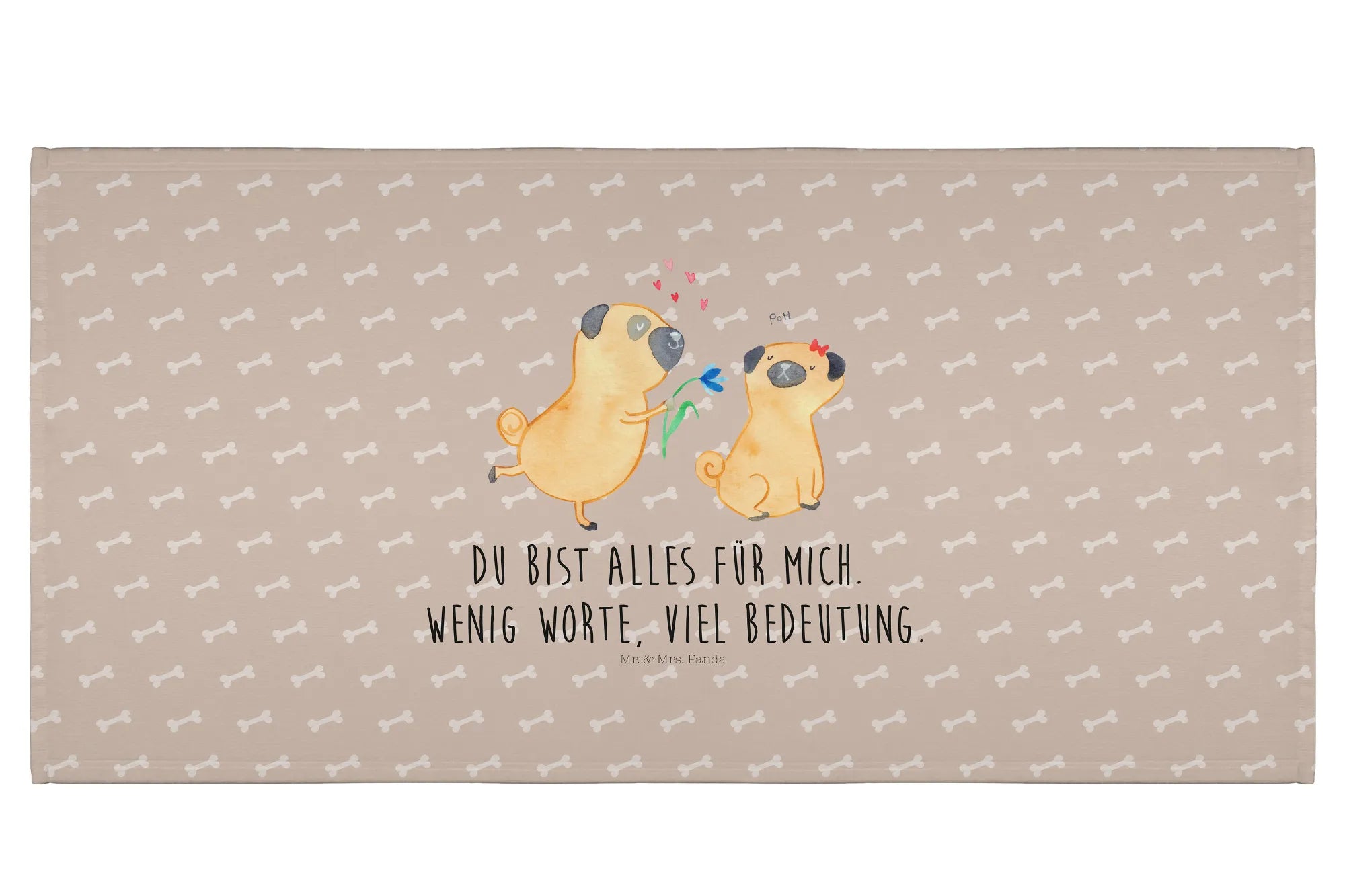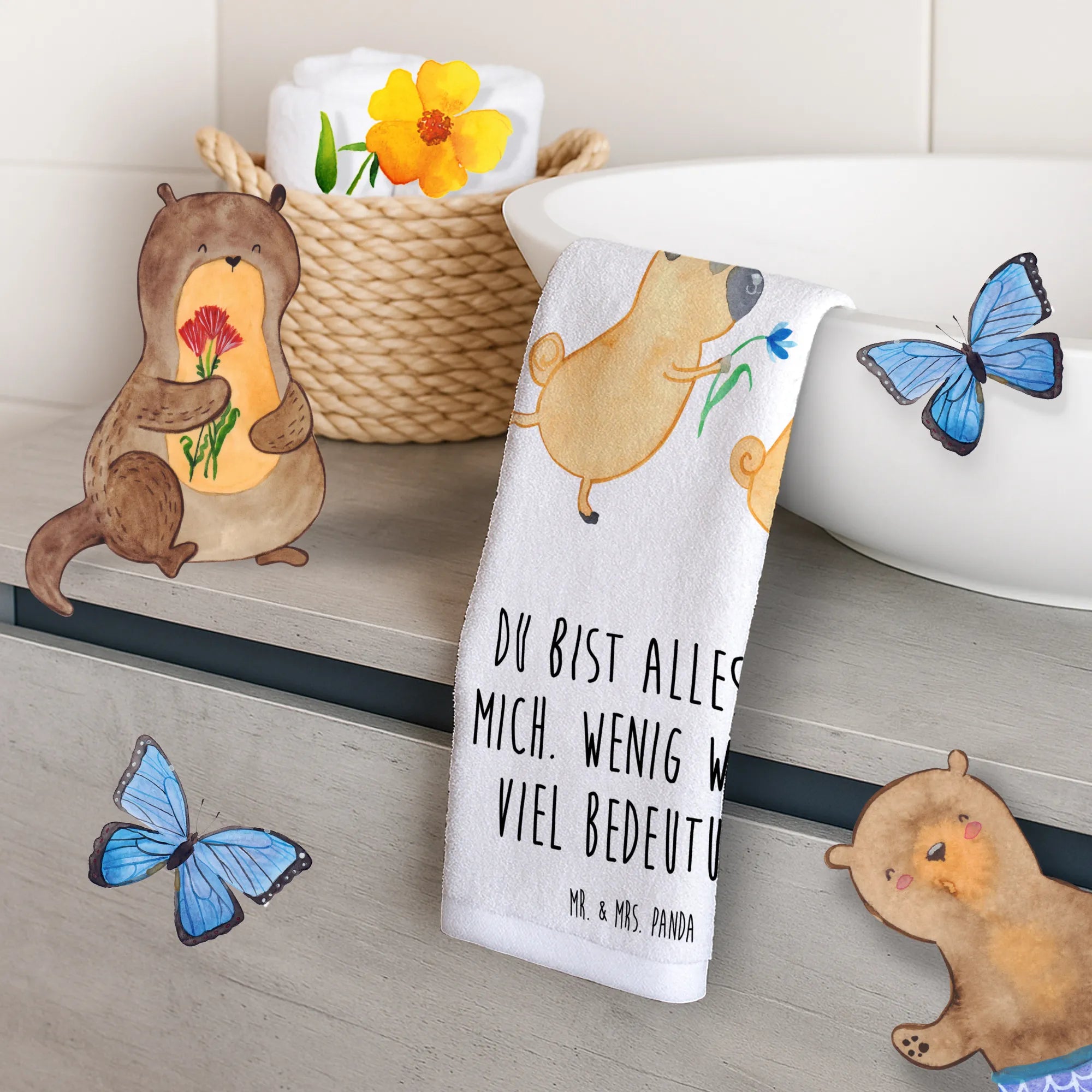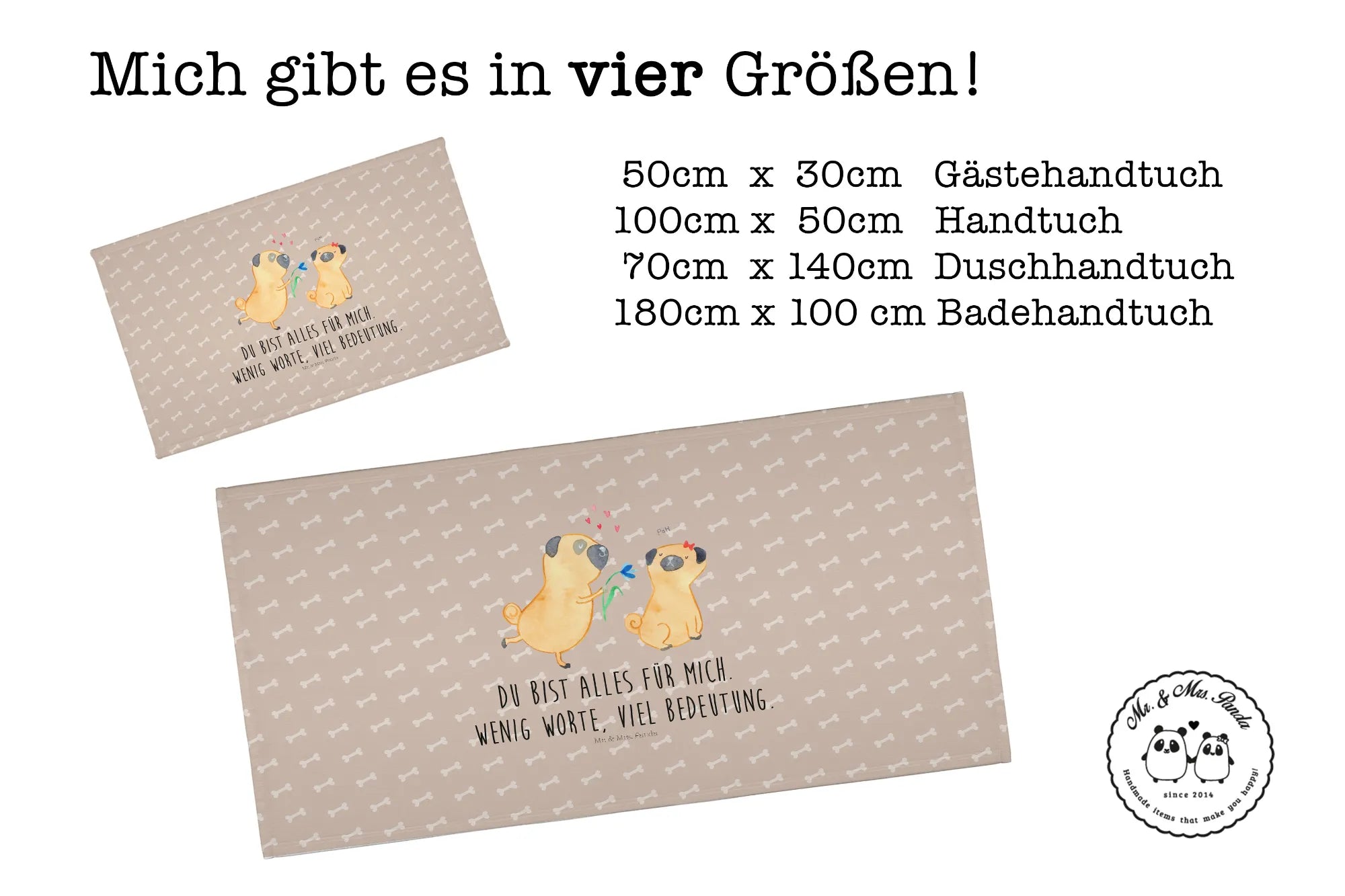 Das 50 x 100 Handtuch »Mops verliebt« von Mr. & Mrs. Panda ist der perfekte Begleiter für dein Badezimmer und ein wunderbares Geschenk für jeden Hundeliebhaber. Dieses süße Handtuch zeigt zwei niedliche Möpse, die verliebt dastehen und einem von ihnen reicht der andere eine Blume – ein Bild der Liebe und Zuneigung, das jeden Tag Freude bereitet. Mit dem Spruch "Du bist alles für mich. Wenig Worte, viel Bedeutung." wird das Handtuch zu einem besonders persönlichen Geschenk für deinen Partner oder einen lieben Freund. Egal ob zum Valentinstag, Geburtstag oder einfach nur als kleine Aufmerksamkeit, dieses Handtuch bringt Herz und Wärme in jedes Badezimmer.