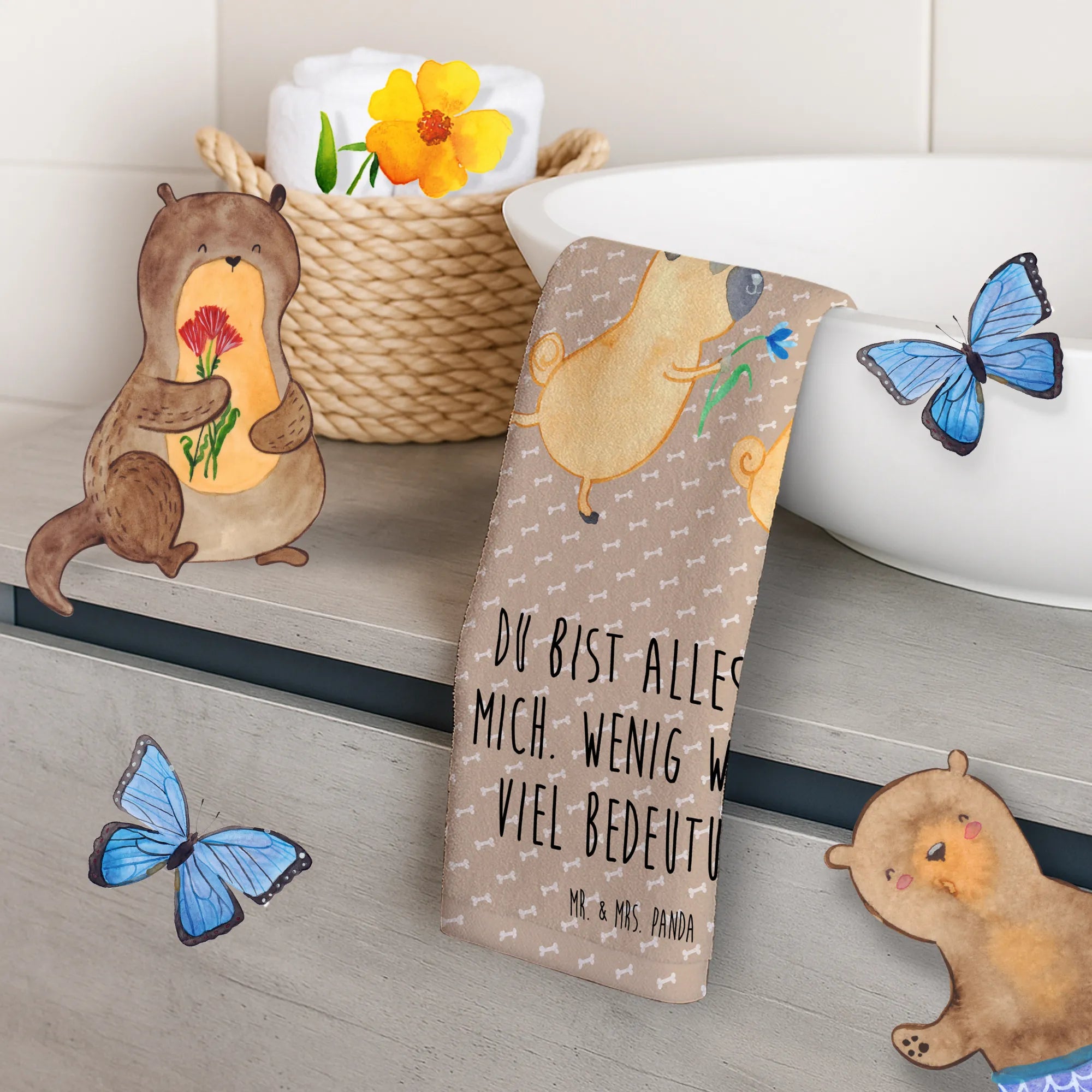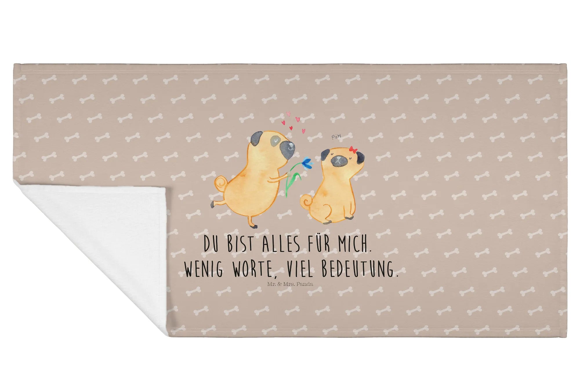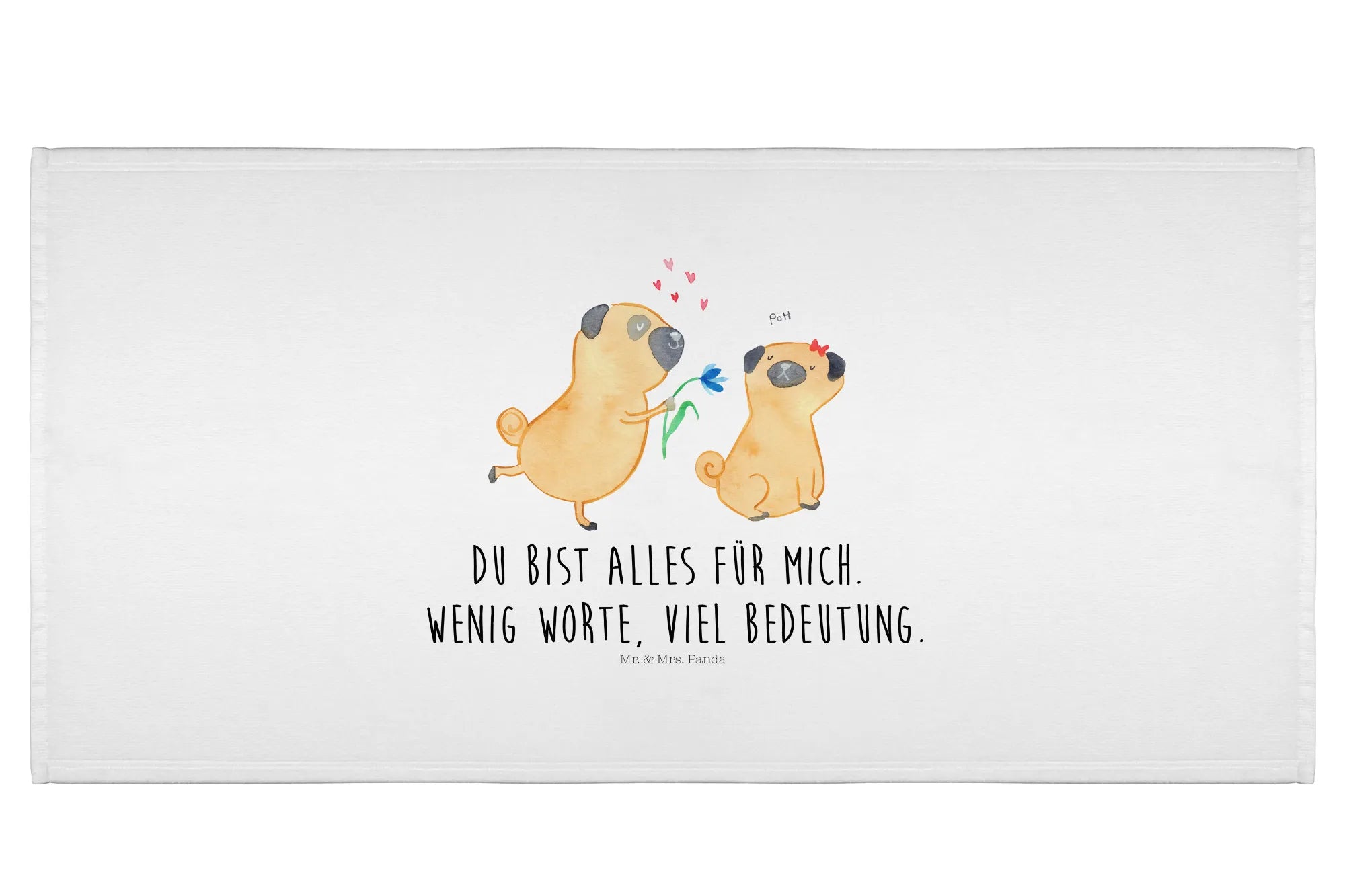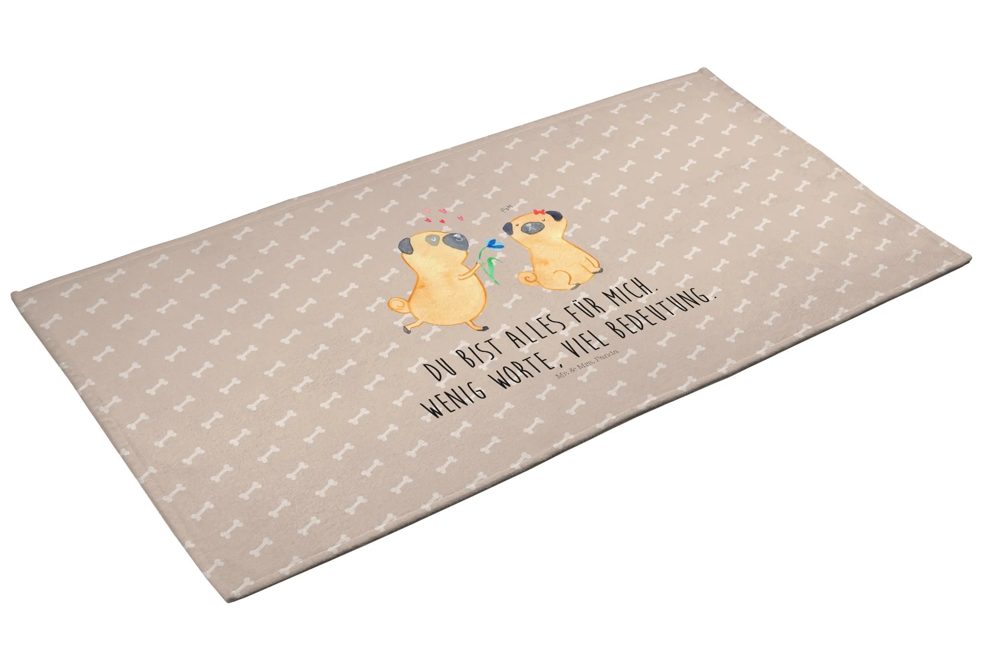 Das 50 x 100 Handtuch »Mops verliebt« von Mr. & Mrs. Panda ist der perfekte Begleiter für dein Badezimmer und ein wunderbares Geschenk für jeden Hundeliebhaber. Dieses süße Handtuch zeigt zwei niedliche Möpse, die verliebt dastehen und einem von ihnen reicht der andere eine Blume – ein Bild der Liebe und Zuneigung, das jeden Tag Freude bereitet. Mit dem Spruch "Du bist alles für mich. Wenig Worte, viel Bedeutung." wird das Handtuch zu einem besonders persönlichen Geschenk für deinen Partner oder einen lieben Freund. Egal ob zum Valentinstag, Geburtstag oder einfach nur als kleine Aufmerksamkeit, dieses Handtuch bringt Herz und Wärme in jedes Badezimmer.