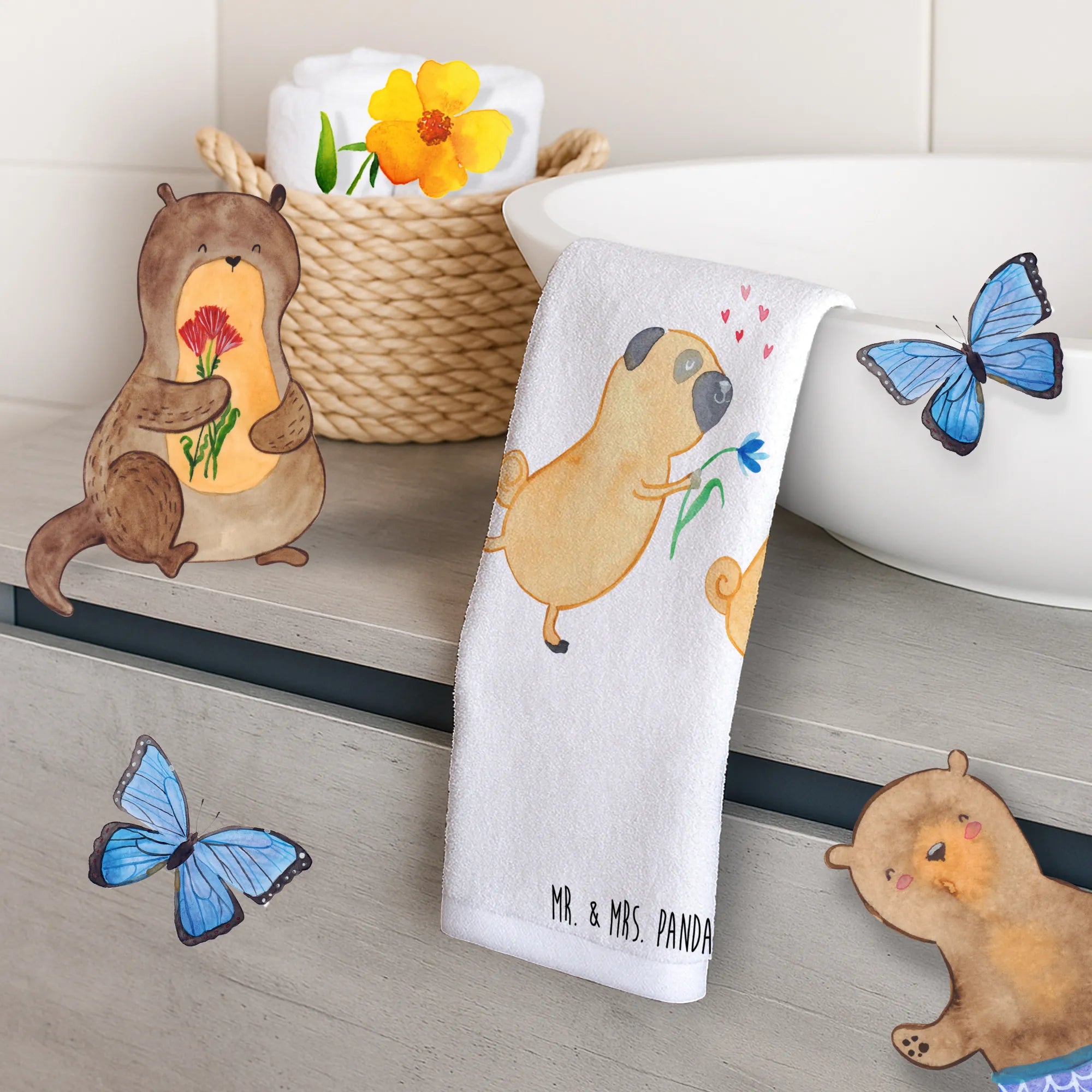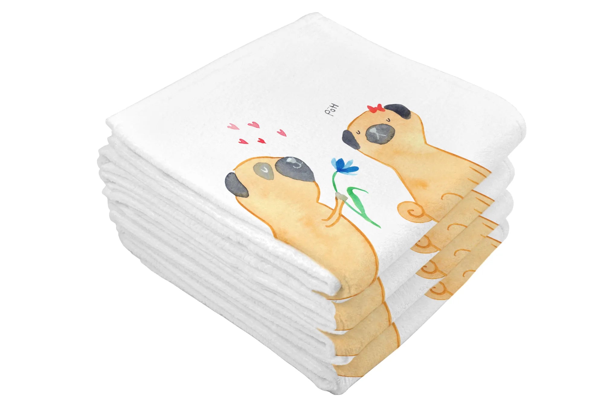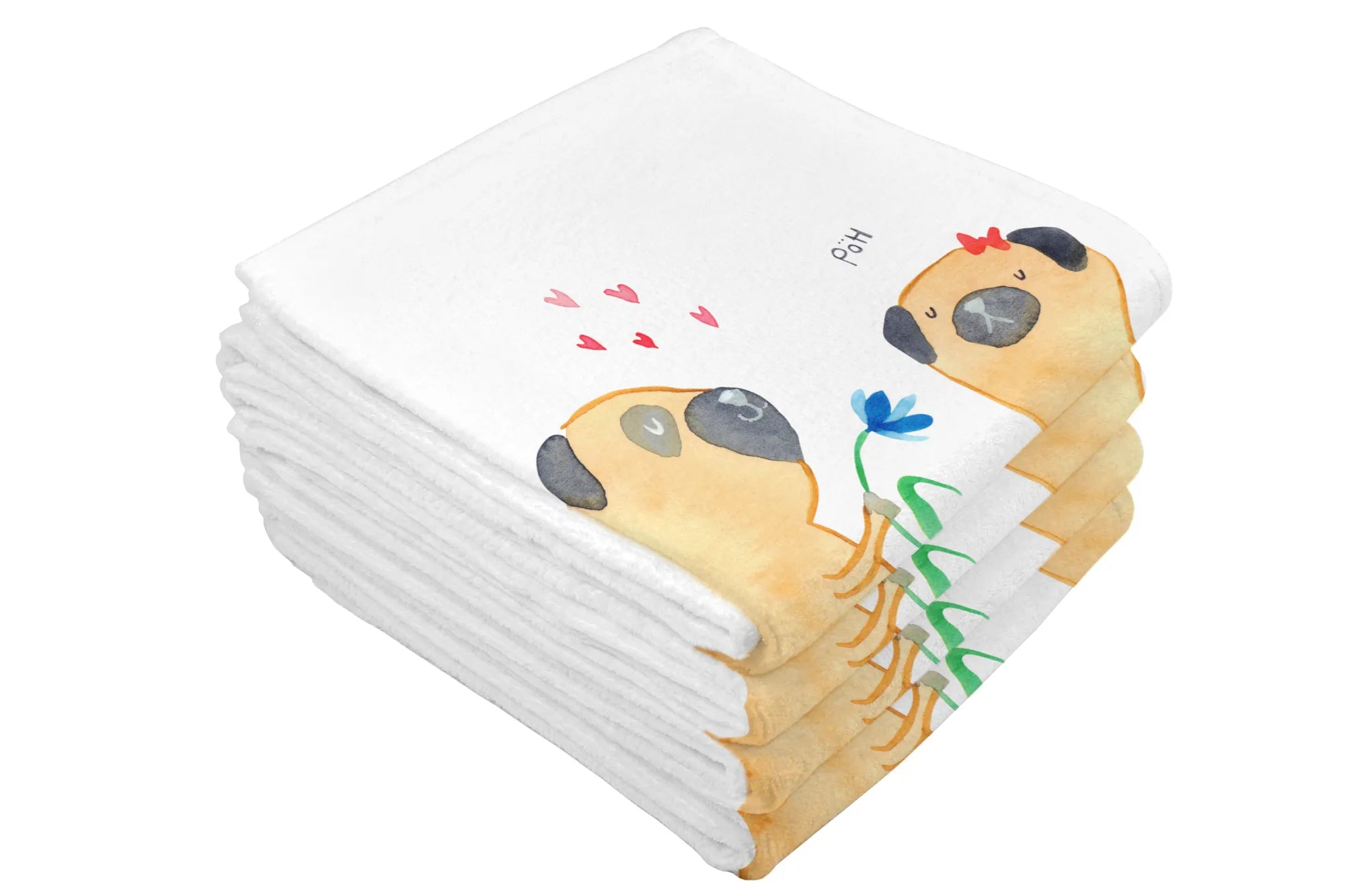 Das Gästetuch Mops verliebt von Mr. & Mrs. Panda ist das perfekte Geschenk für jeden Hundeliebhaber, der seinen Gästen ein Lächeln ins Gesicht zaubern möchte! Mit einem liebevollen Motiv von zwei niedlichen Möpsen, die verliebt dastehen und sich mit einer Blume beschenken, wird dieses Handtuch zum Highlight in jedem Gästebad.