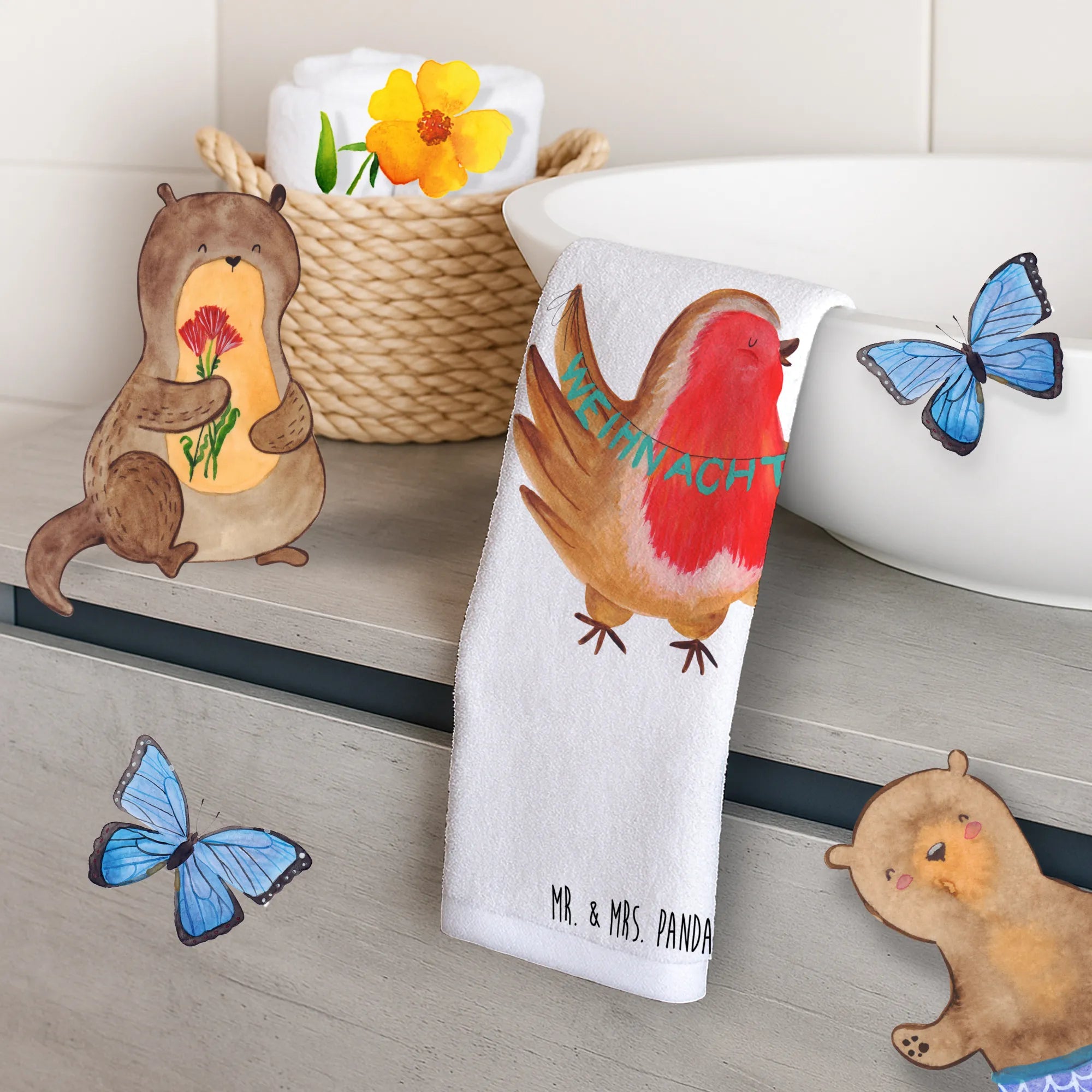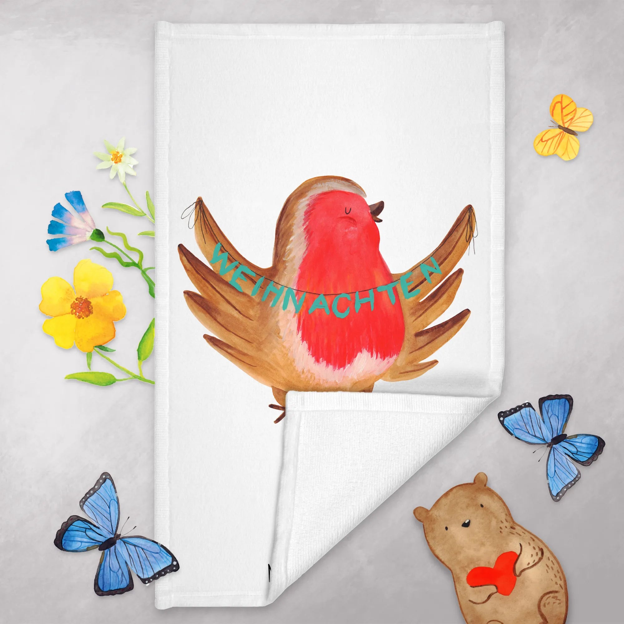 Weihnachten steht vor der Tür und was gibt es Schöneres, als seinen Gästen mit einem wundervollen Gästehandtuch ein Lächeln ins Gesicht zu zaubern? Das Gäste Handtuch mit dem süßen Rotkehlchen-Motiv von Mr. & Mrs. Panda ist das perfekte Geschenk für die Vorweihnachtszeit.
