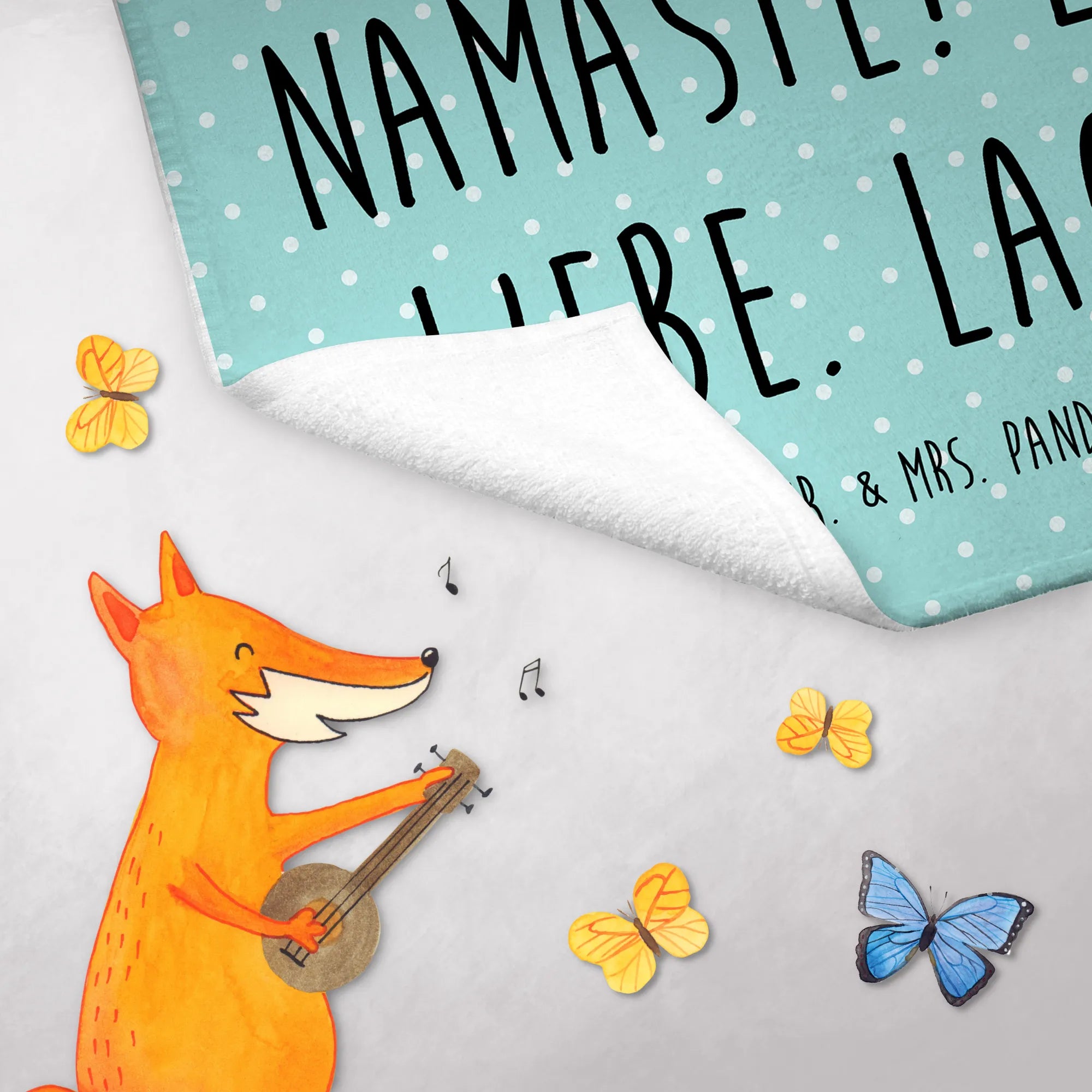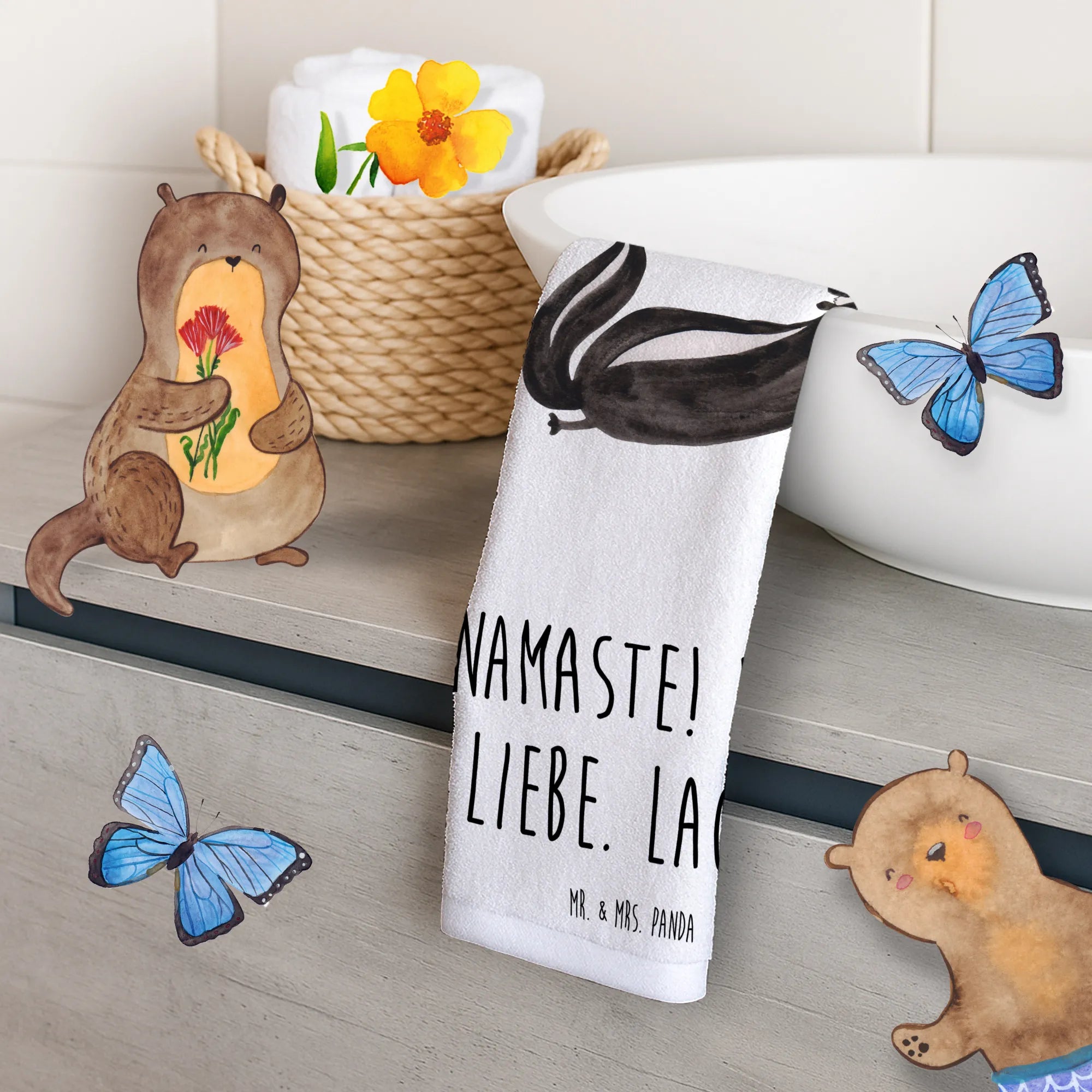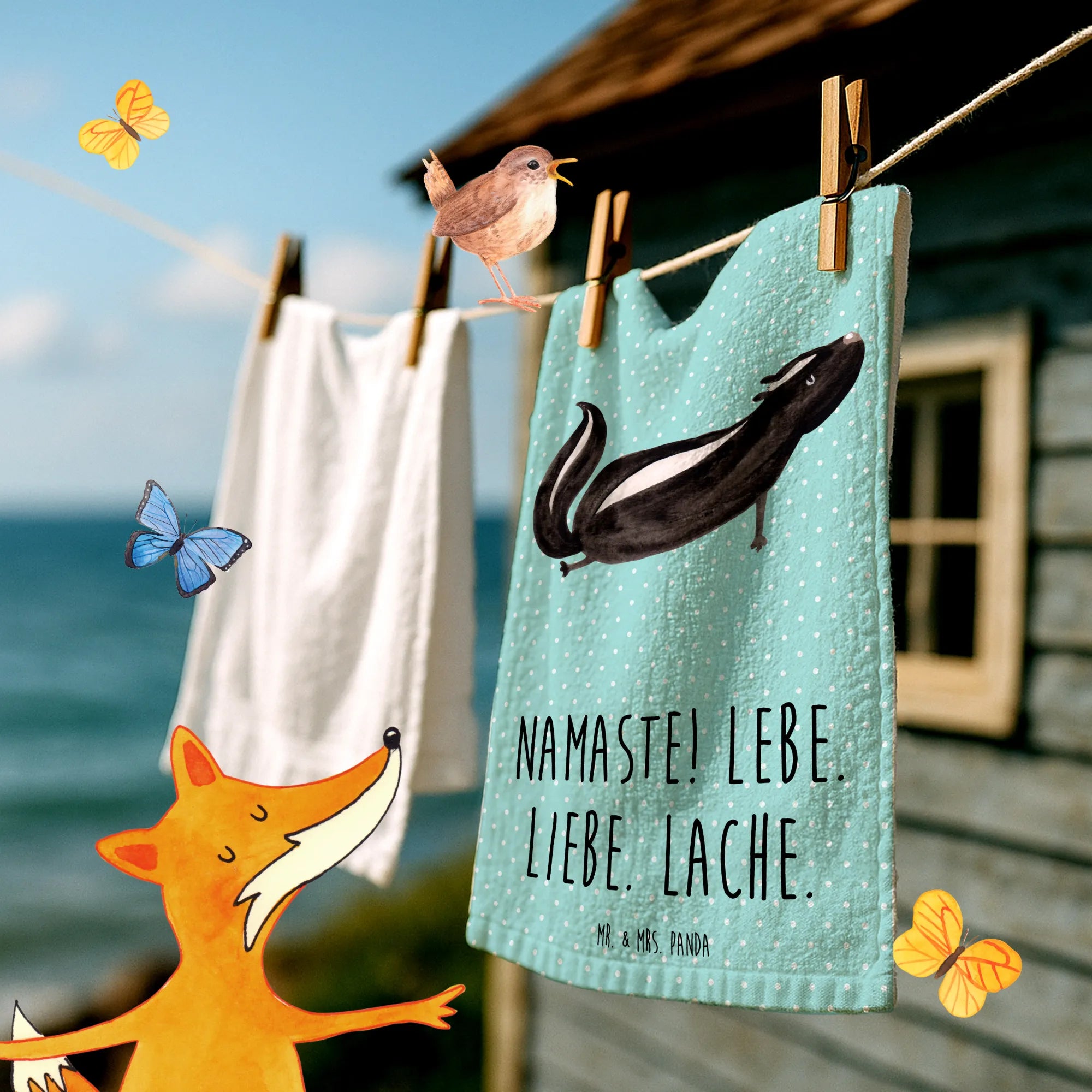 Das Motiv zeigt ein zuckersüßes Stinktier, das völlig tiefenentspannt seine Yoga-Übungen macht, gemalt im unverkennbaren Aquarellstil von Mrs. Panda. Begleitet wird die Illustration von der kraftvollen Botschaft Namaste! Lebe. Liebe. Lache. Damit wird das Händewaschen im Gäste-WC zu einem kleinen meditativen Moment im Alltag. ✨