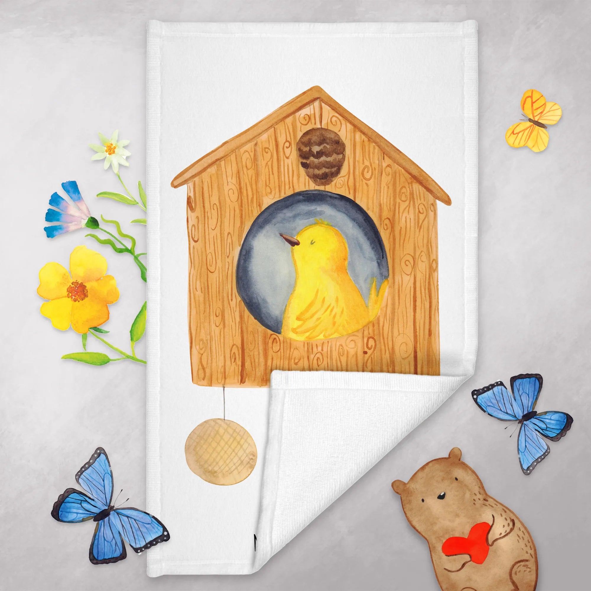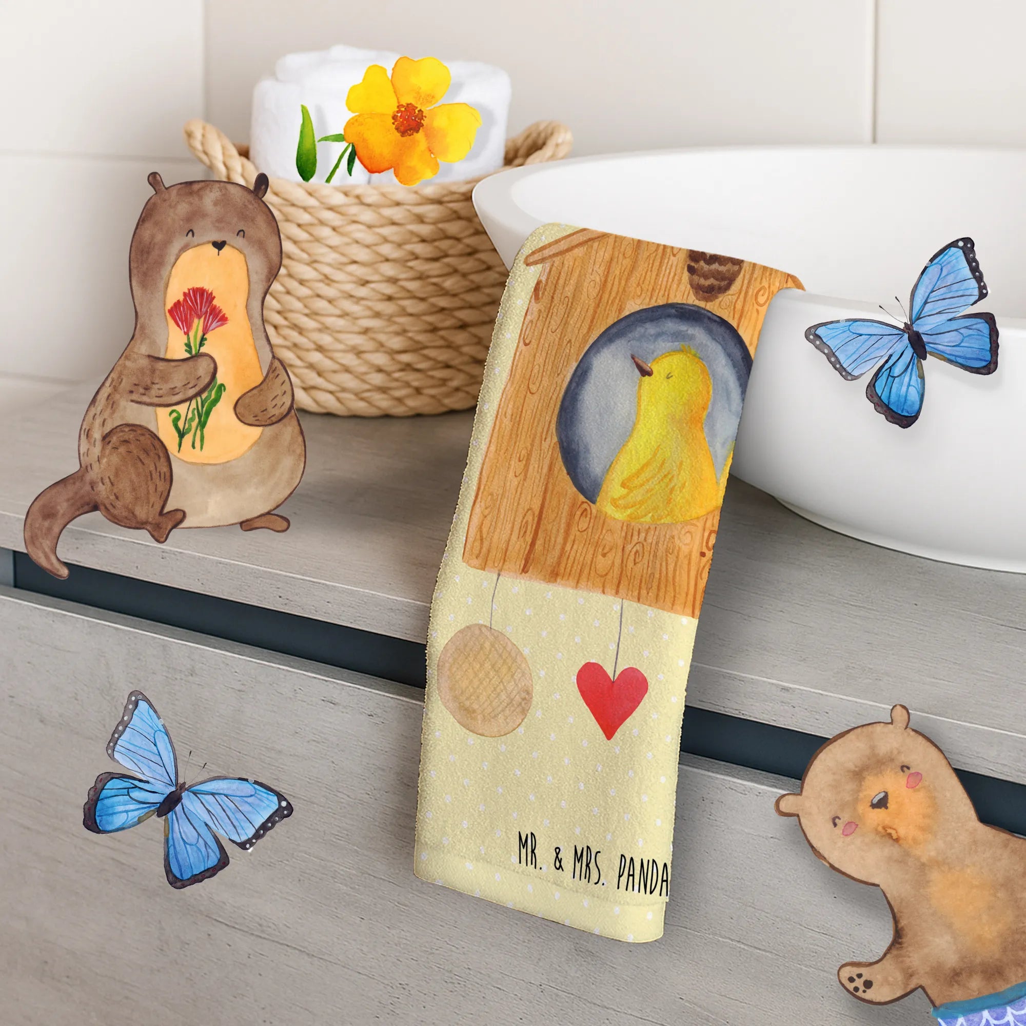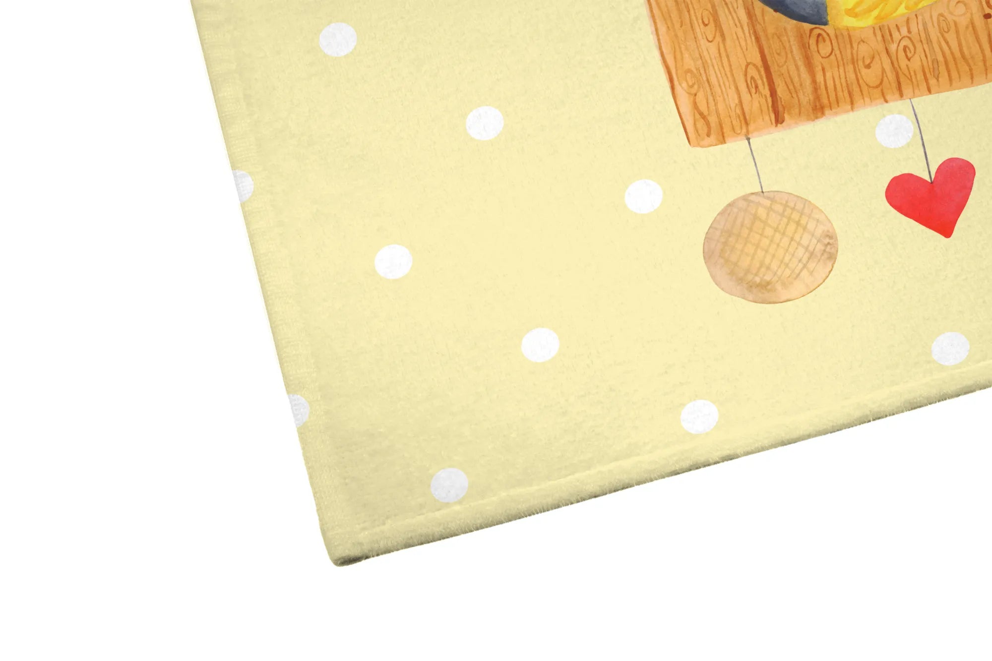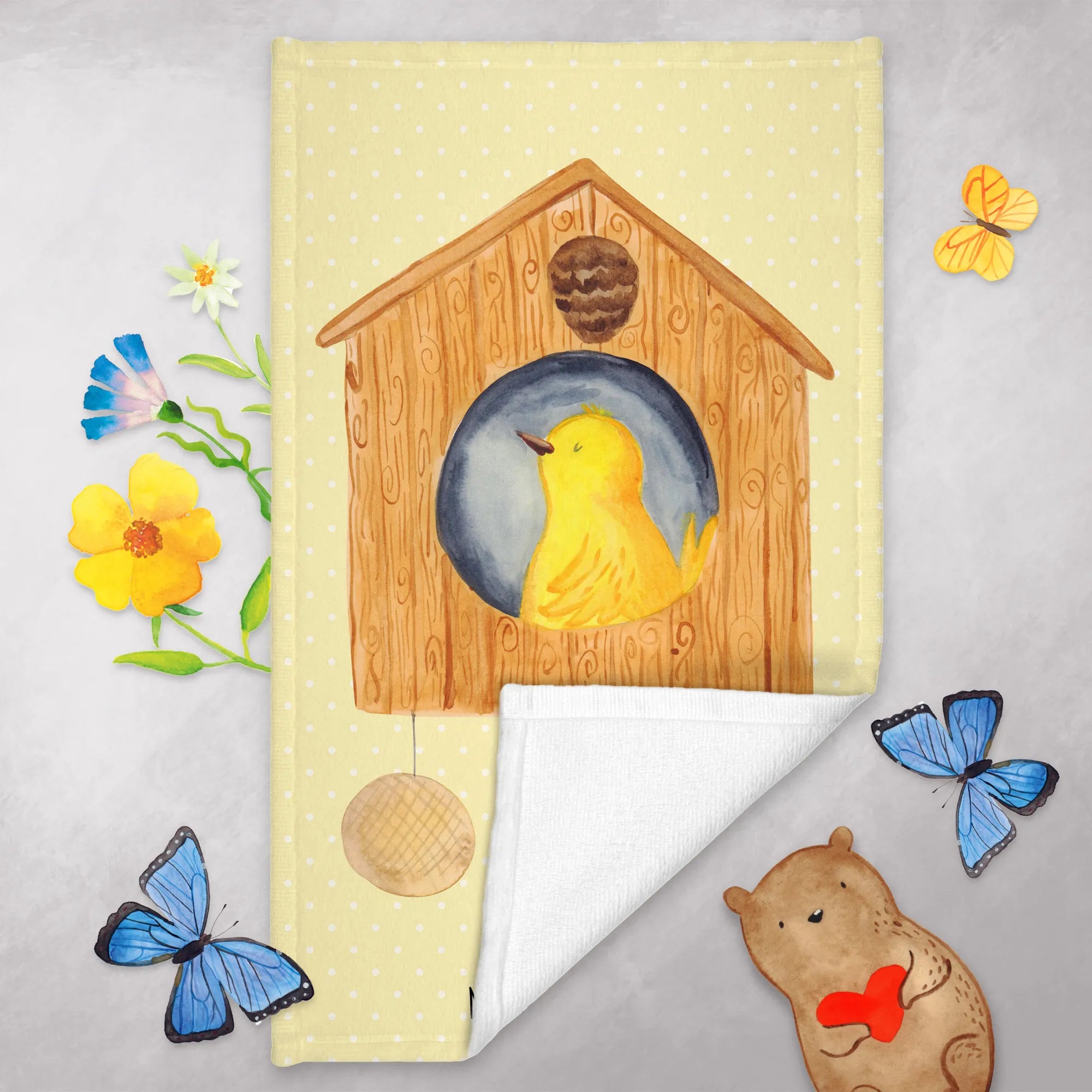 Das Gästehandtuch "Vogelhaus sweet Home" von Mr. & Mrs. Panda ist das perfekte Geschenk für jeden, der sein Zuhause lieben möchte! 🎁 Dieses flauschige Handtuch vereint Funktionalität mit einem charmanten Design, das dein Badezimmer aufheckt und deinen Gästen ein warmes Willkommen bietet. Das süße Vogelmotiv, das einen zufriedenen kleinen Vogel in seinem gelben Zuhause zeigt, strahlt Glück und Gemütlichkeit aus.