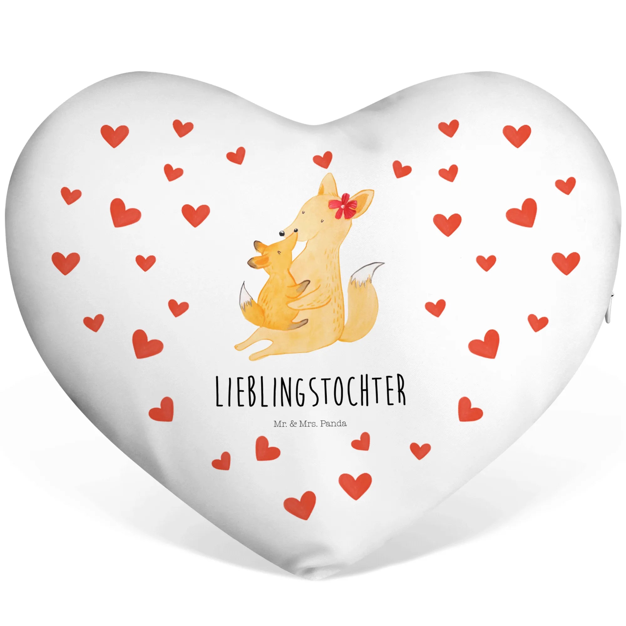 Das süße Herzkissen Fuchs Mama & Kind von Mr. & Mrs. Panda ist das perfekte Geschenk für Deine Lieblingstochter! Diese liebevolle Darstellung zweier Füchse zeigt eine Mutter, die ihr junges Tier zärtlich umarmt. Mit warmen, gelb-orangenen Farben und einer roten Blume hinter dem Ohr der Mutter strahlt das Motiv Geborgenheit und Familiensinn aus.