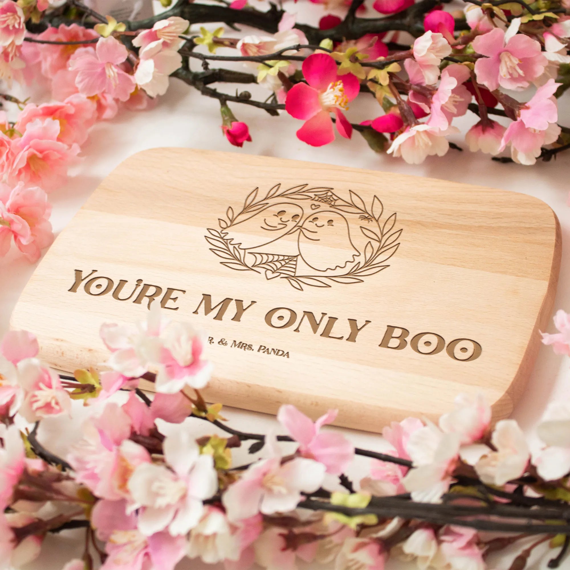 Ein gespenstisches Paar schwebt liebevoll durch die Nacht, umgeben von einer sanften pflanzlichen Dekoration. Die niedlichen Gespenster, die sich aneinander kuscheln, zeigen uns, dass Liebe keine Grenzen kennt – nicht einmal die der Welt der Geister. Ihr kleines Herz zwischen ihnen drückt ihre tiefe Verbundenheit aus, während die feinen Blaubtöne harmonisch in den Hintergrund fließen. Inmitten dieser zarten Szenerie schimmert der Spruch: 'You're my only boo'. Diese Kombination macht das Motiv zu einer perfekten Wahl für all jene, die Liebe in jeder Form feiern möchten, selbst in der magischen Halloween-Zeit.