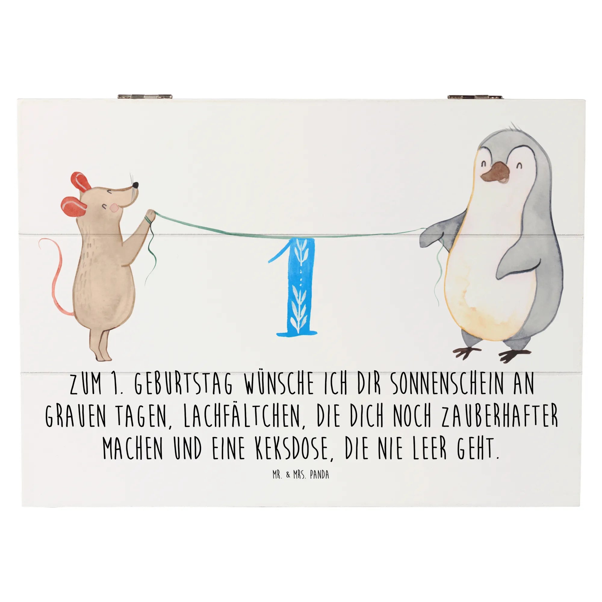 Der erste Geburtstag ist ein ganz besonderer Meilenstein im Leben eines Kindes und seiner Eltern. Ein ganzes Jahr voller erster Male liegt hinter euch – das erste Lächeln, das erste Krabbeln und vielleicht sogar die ersten wackeligen Schritte. Um all diese kostbaren Augenblicke festzuhalten, haben wir von Mr. & Mrs. Panda diese wunderschöne Holzkiste mit dem zauberhaften Motiv Maus und Pinguin entworfen. 🐭🐧