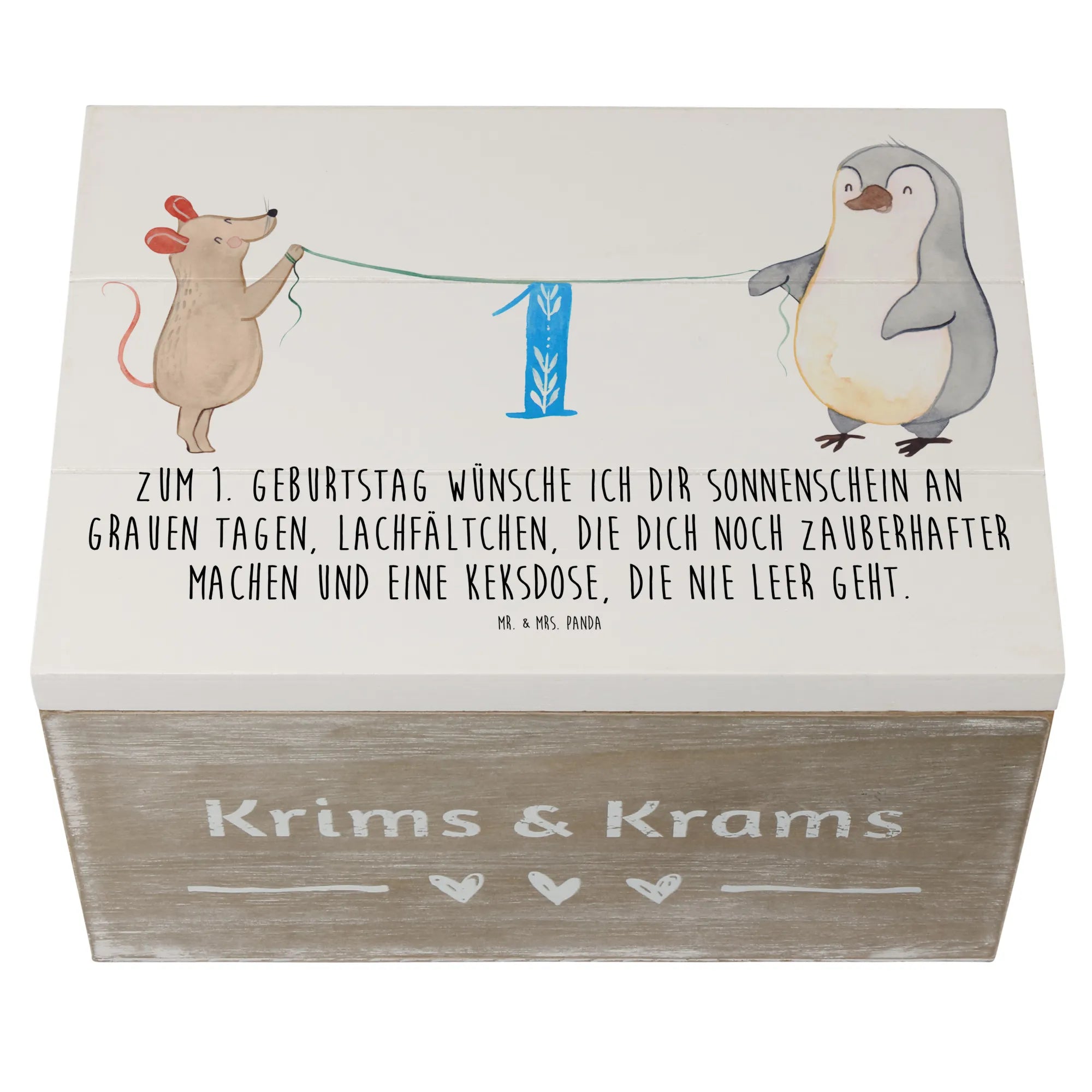 Die wunderschöne Holzkiste von Mr. & Mrs. Panda ist das perfekte Geschenk zum 1. Geburtstag! Diese zauberhafte Kiste mit dem Motiv '1. Geburtstag Maus Pinguin' feiert diesen ganz besonderen Tag, an dem kleine Herzen höher schlagen.