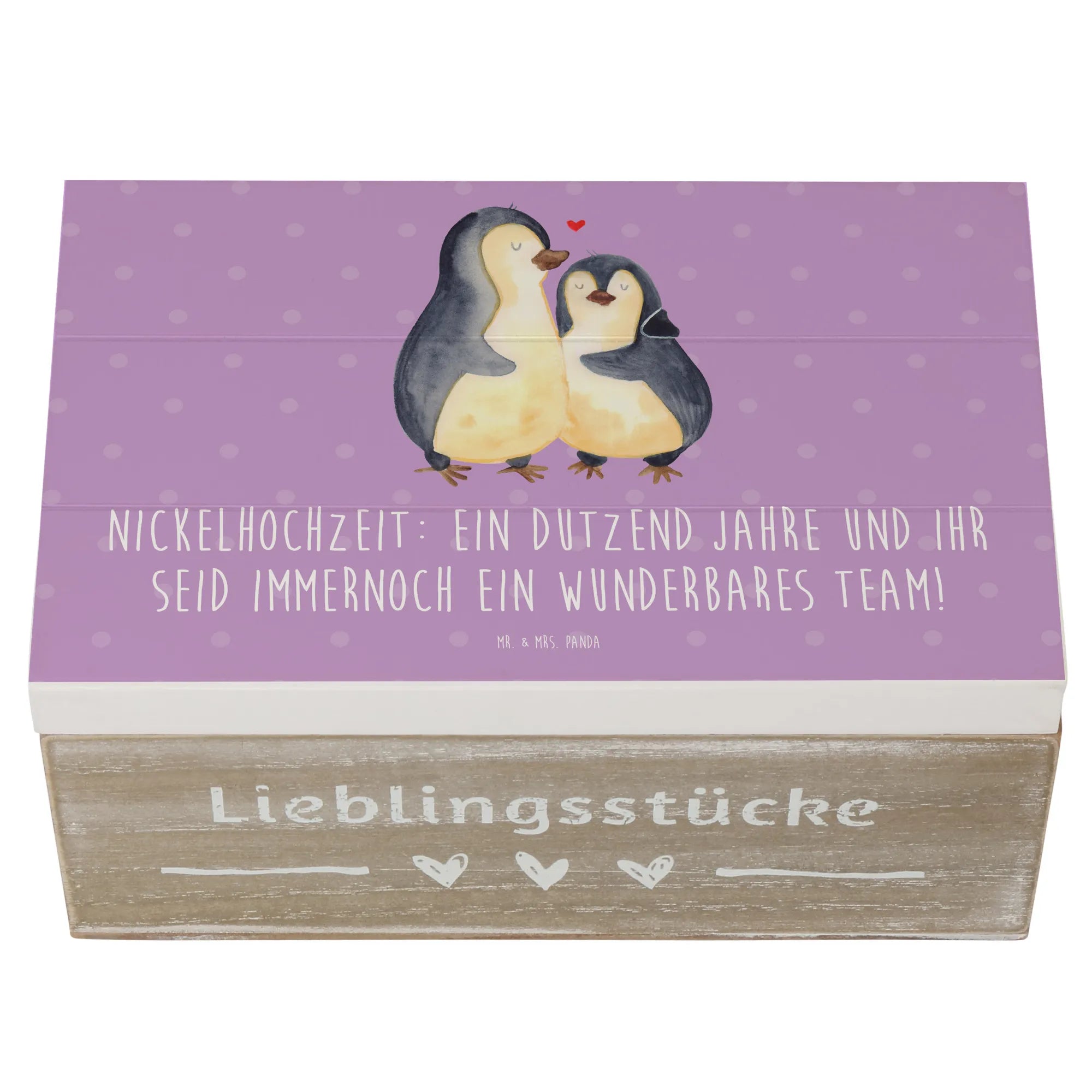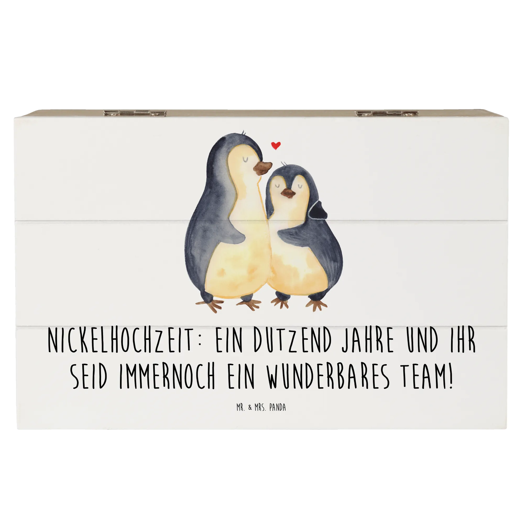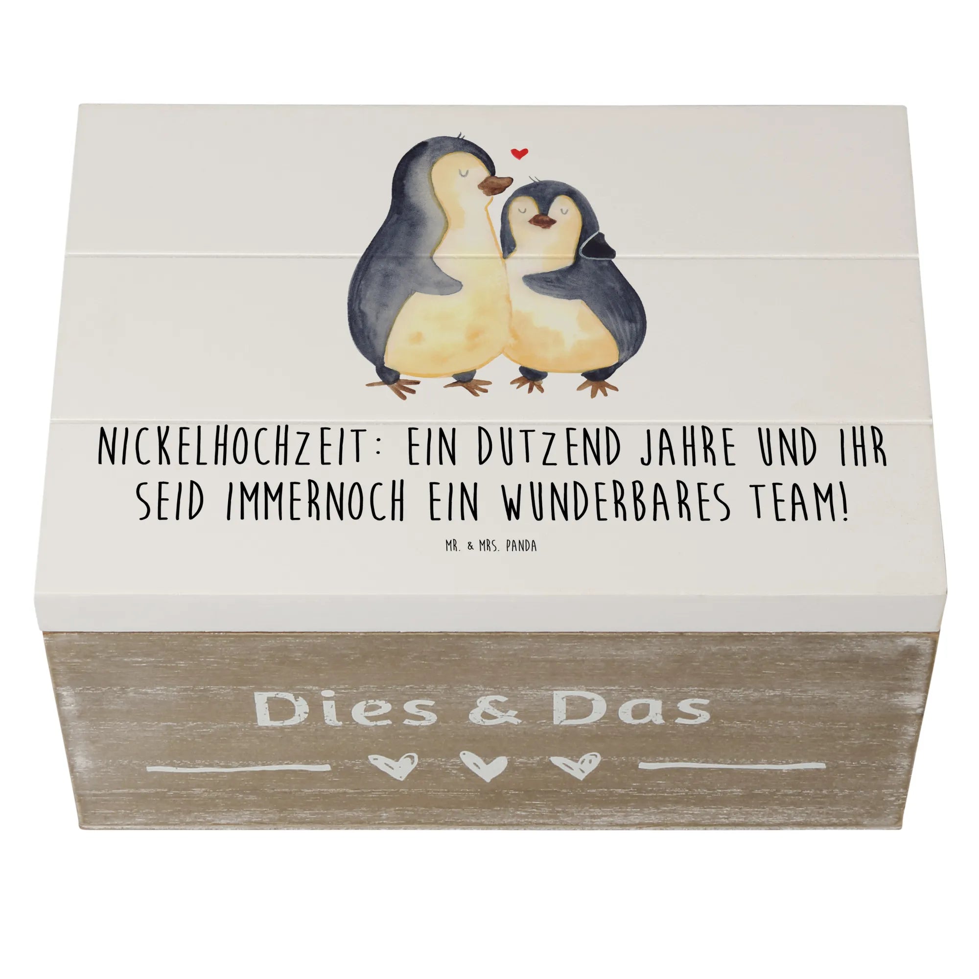 Du suchst nach dem perfekten Geschenk zum 12. Hochzeitstag? Unsere Holzkiste mit dem liebevollen Motiv "Nickelhochzeit: Ein Dutzend Jahre und ihr seid immernoch ein wunderbares Team!" von Mr. & Mrs. Panda ist genau das richtige für dich! Diese wunderschöne Holzkiste ist nicht nur ein idealer Aufbewahrungsort für all eure gemeinsamen Erinnerungen, sondern auch eine ganz besondere Dekokiste für jeden festlichen Anlass.