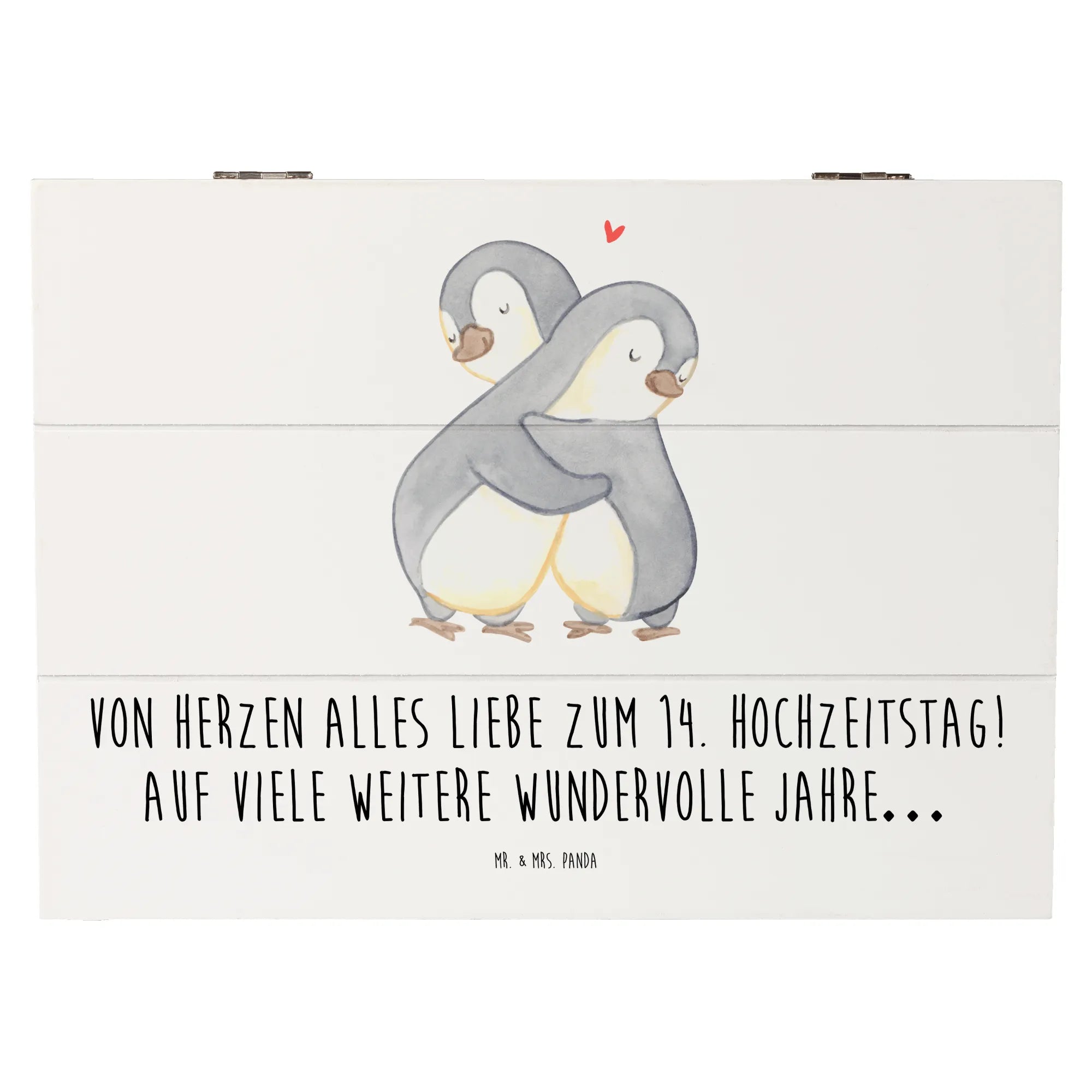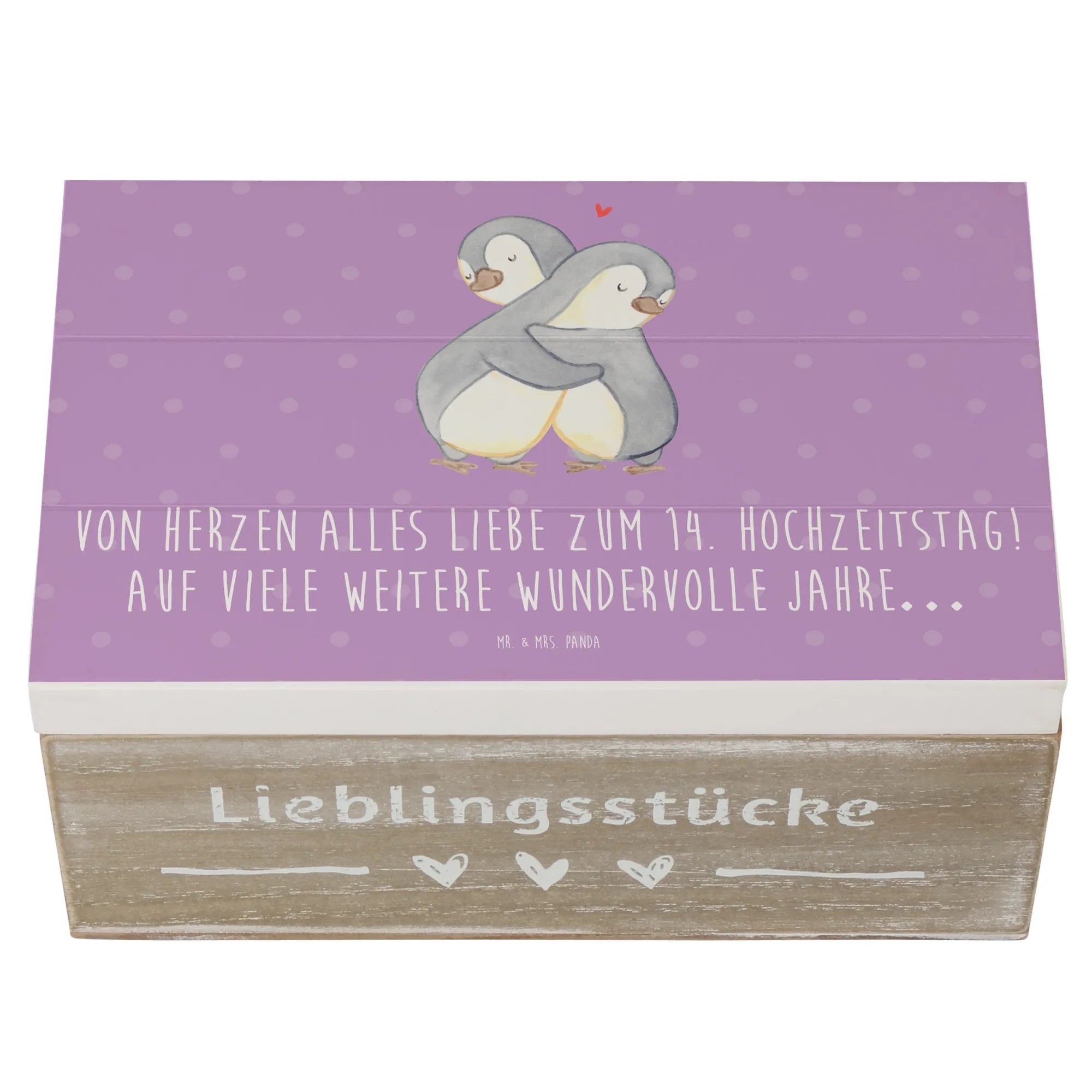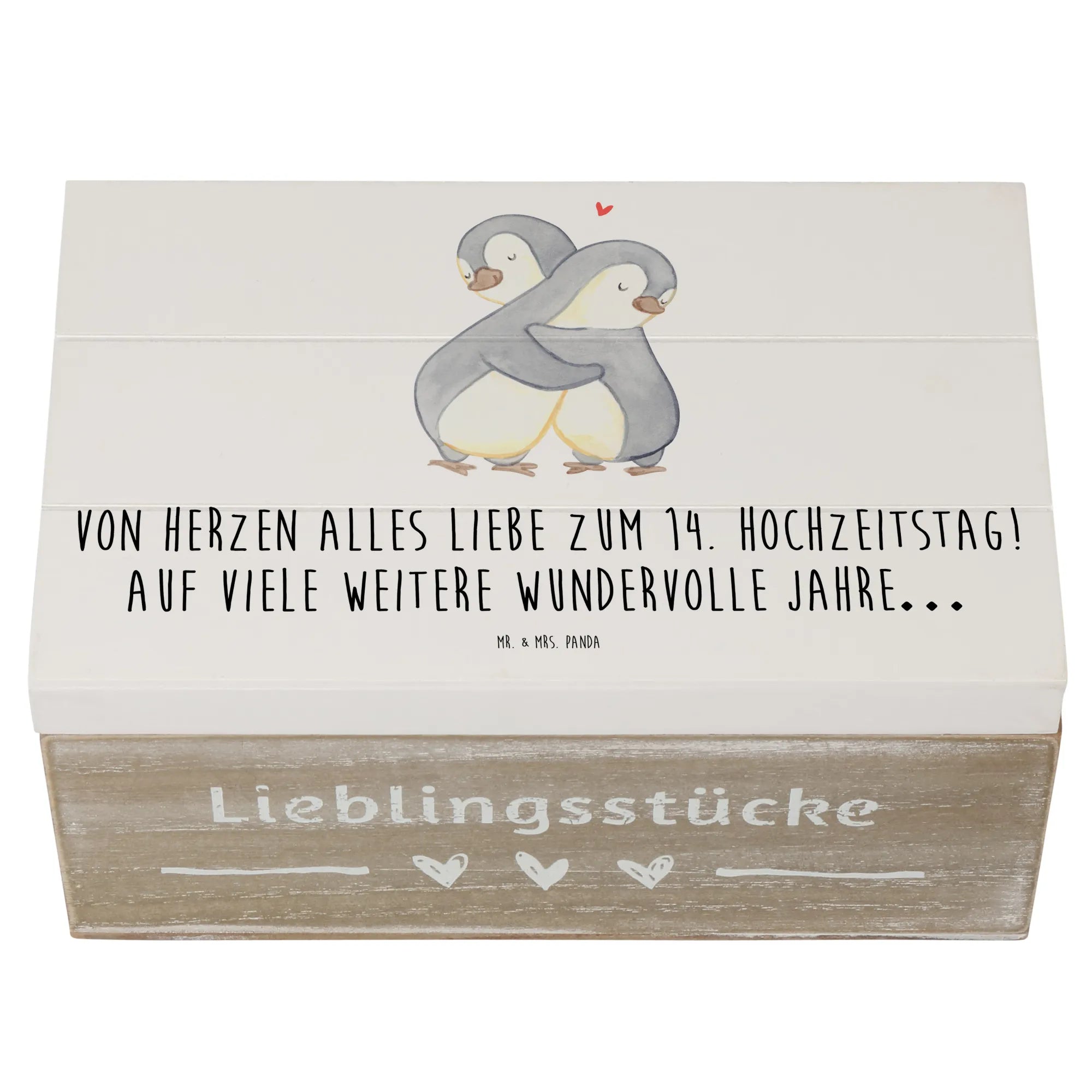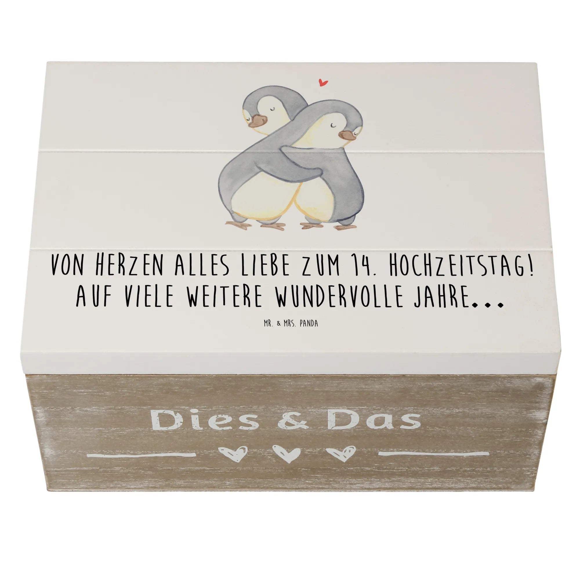 Entdecke die zauberhafte Holzkiste von Mr. & Mrs. Panda, die perfekt zum 14. Hochzeitstag, auch bekannt als Elfenbeinhochzeit, ist! Diese wunderschöne Kiste ist nicht nur ein besonderer Aufbewahrungsort für all deine Erinnerungen, sondern auch ein liebevolles Geschenk für dein Ehepaar oder deine Liebsten. Bedruckt mit dem zauberhaften Spruch "Von Herzen alles Liebe zum 14. Hochzeitstag! Auf viele weitere wundervolle Jahre…", bringt sie Freude und eine persönliche Note in jeden Anlass.