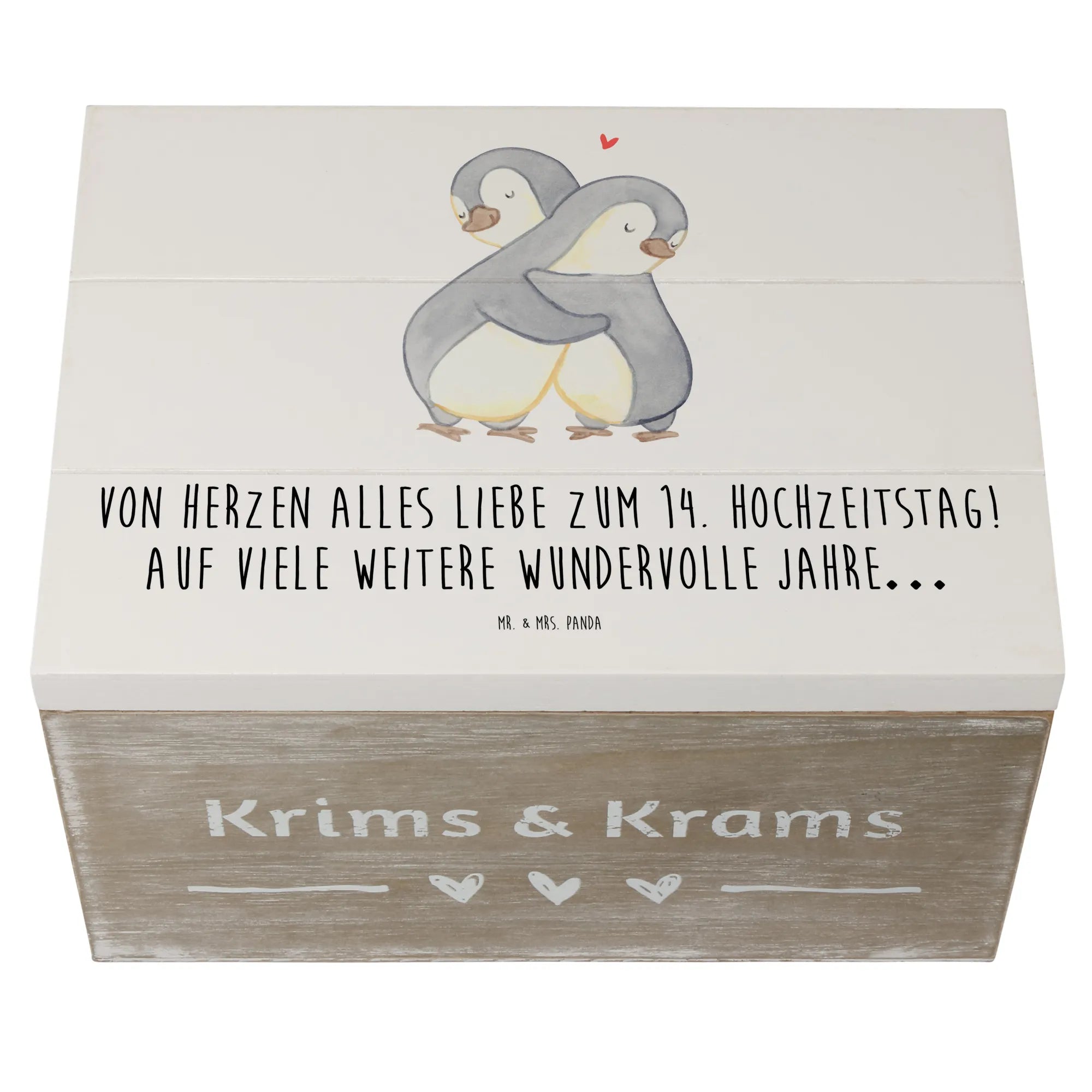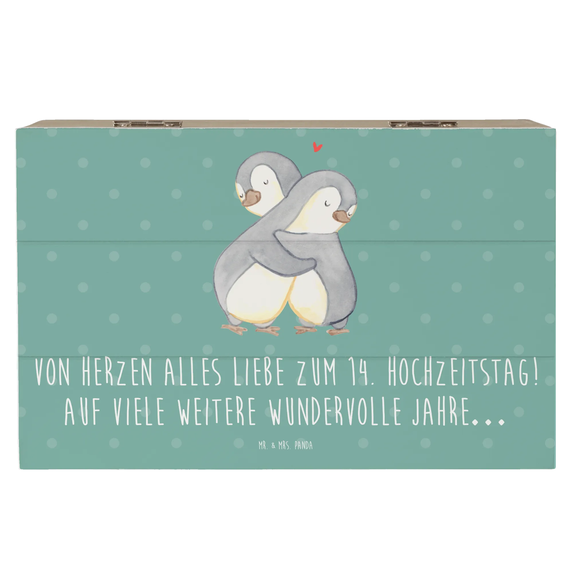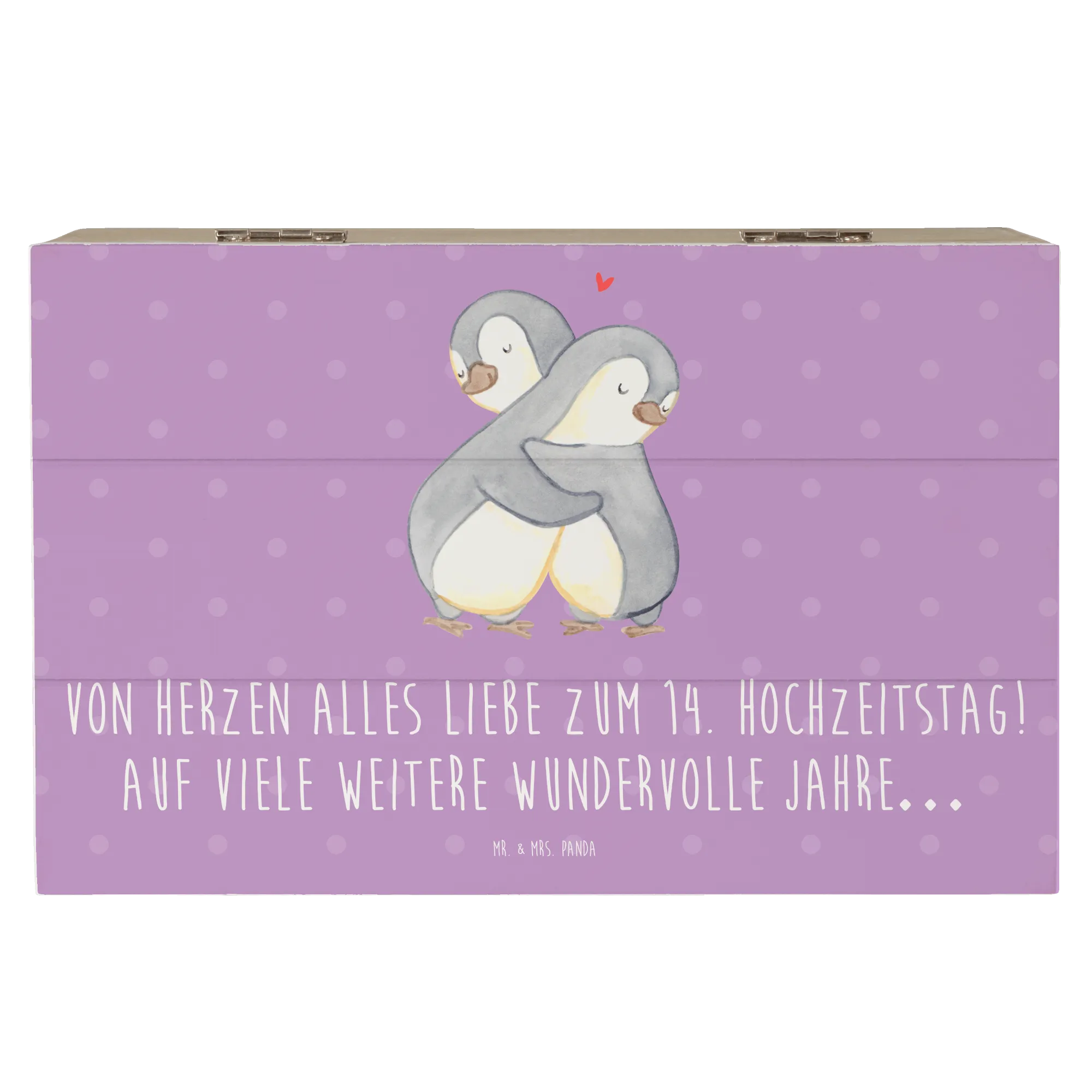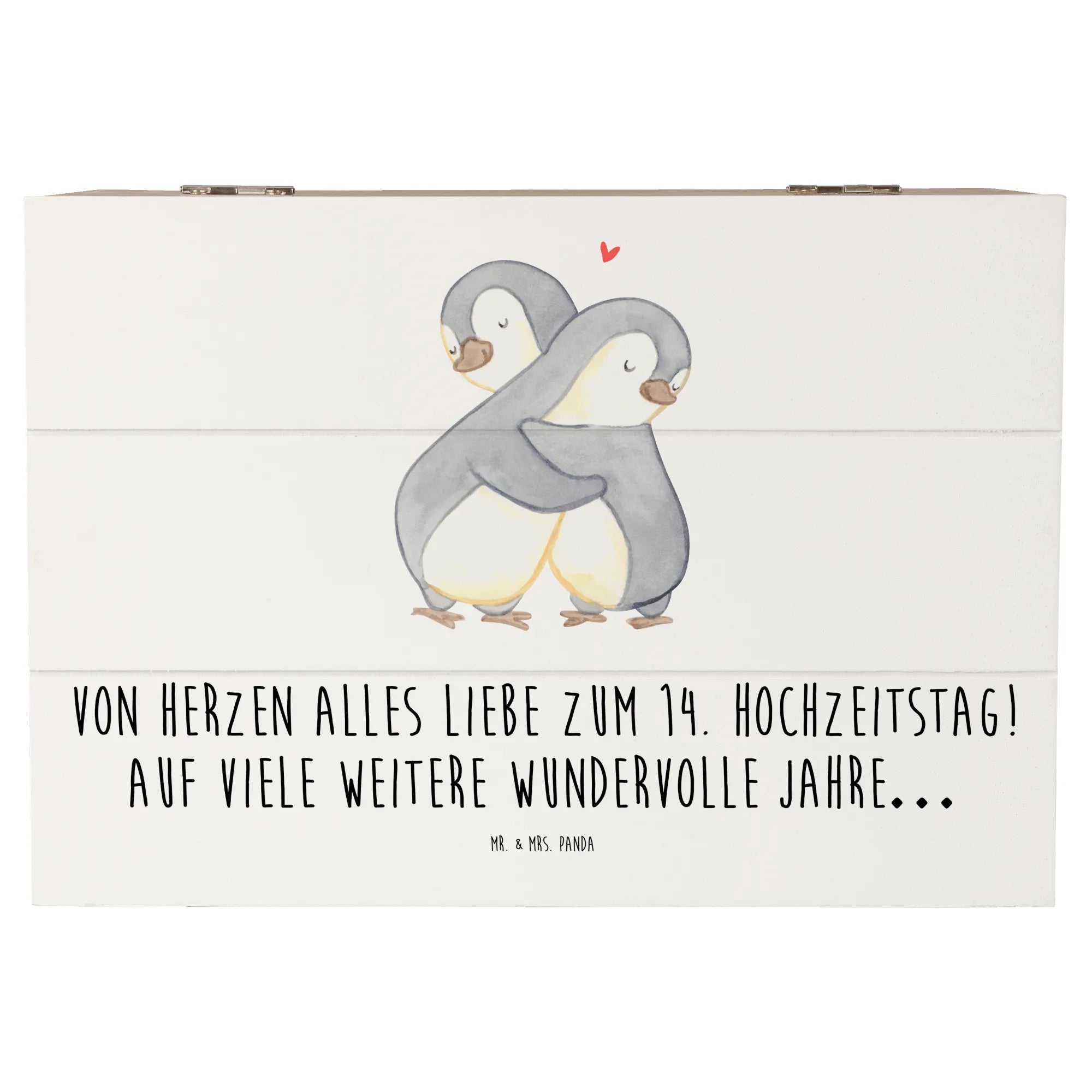 Entdecke die zauberhafte Holzkiste von Mr. & Mrs. Panda, die perfekt zum 14. Hochzeitstag, auch bekannt als Elfenbeinhochzeit, ist! Diese wunderschöne Kiste ist nicht nur ein besonderer Aufbewahrungsort für all deine Erinnerungen, sondern auch ein liebevolles Geschenk für dein Ehepaar oder deine Liebsten. Bedruckt mit dem zauberhaften Spruch "Von Herzen alles Liebe zum 14. Hochzeitstag! Auf viele weitere wundervolle Jahre…", bringt sie Freude und eine persönliche Note in jeden Anlass.