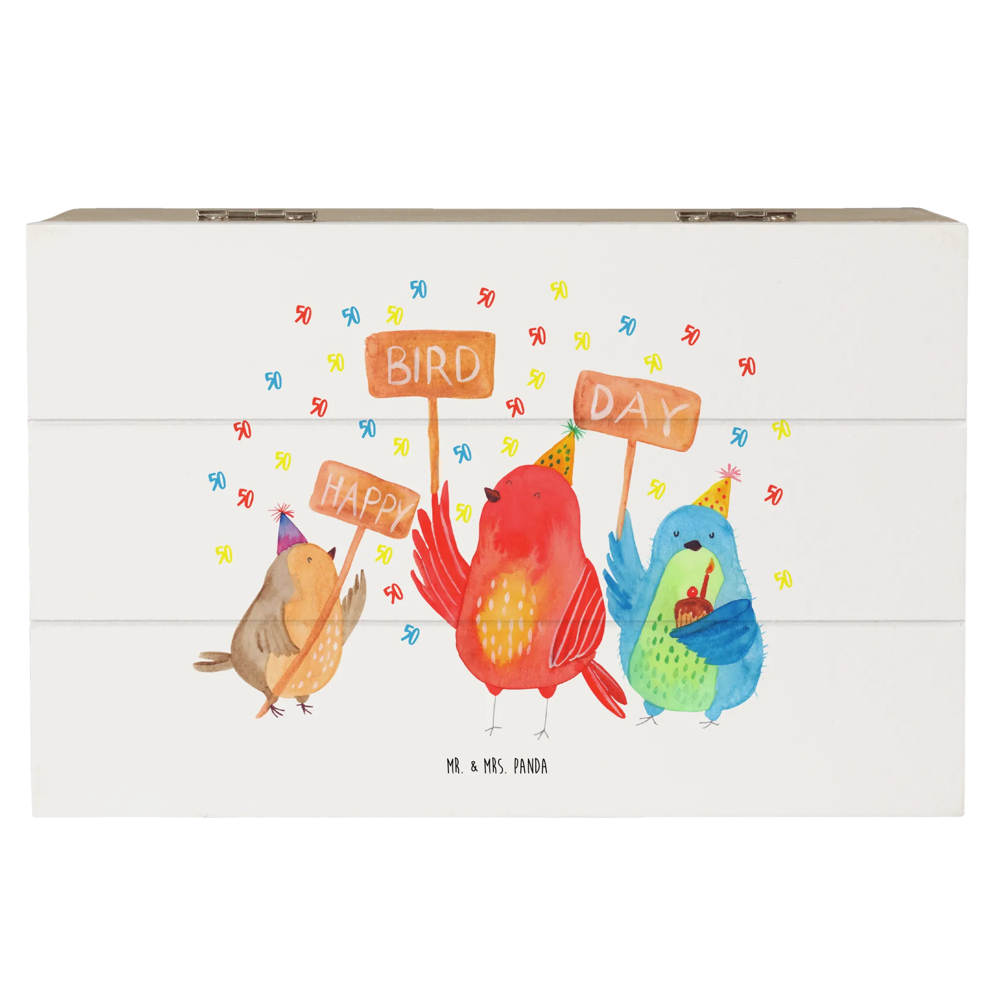 Entdecke die perfekte Holzkiste von Mr. & Mrs. Panda für den 50. Geburtstag! Diese wunderschöne Schatzkiste mit dem fröhlichen Motiv "Happy Bird Day" ist ein ganz besonderes Geschenk für jeden, der seinen Ehrentag feiert.