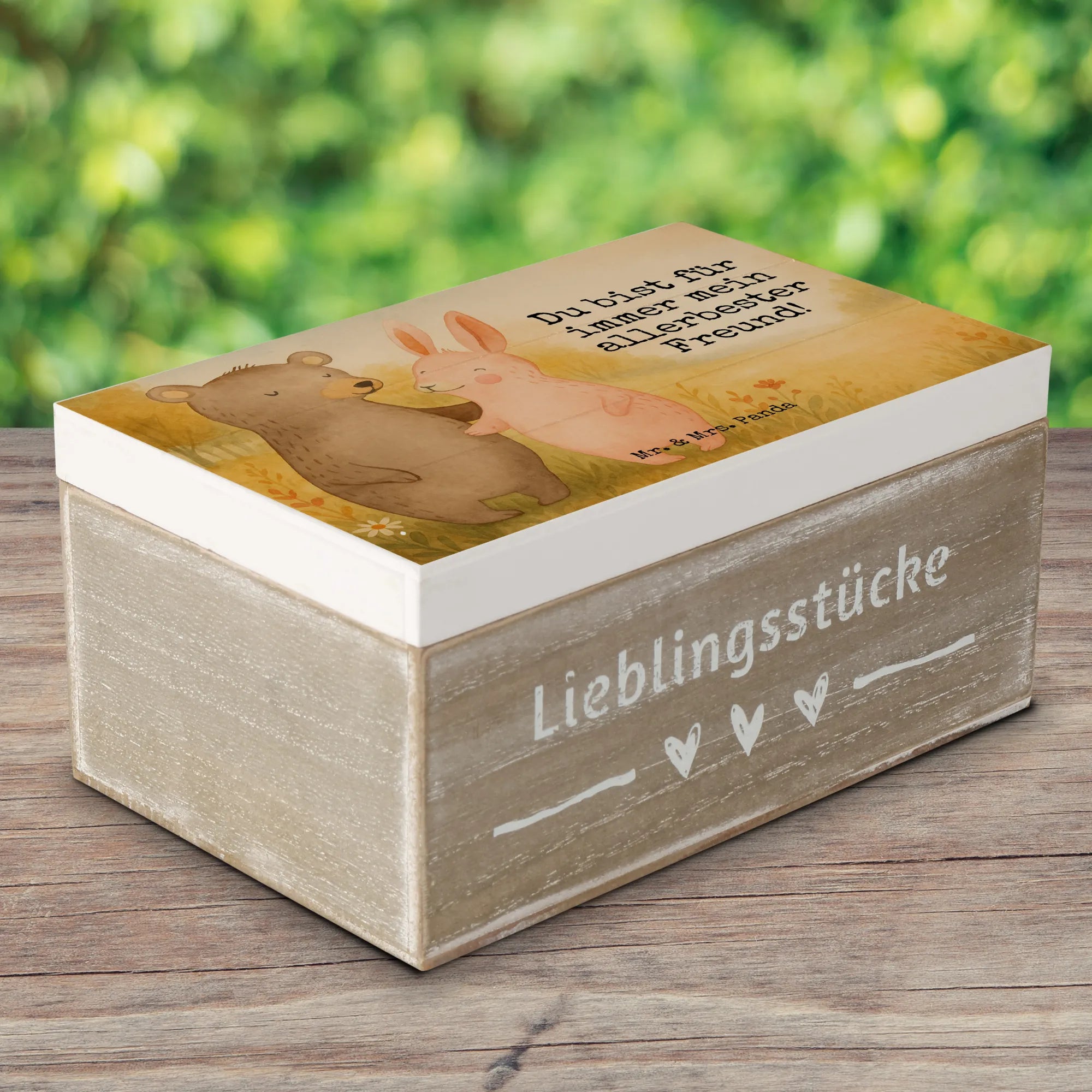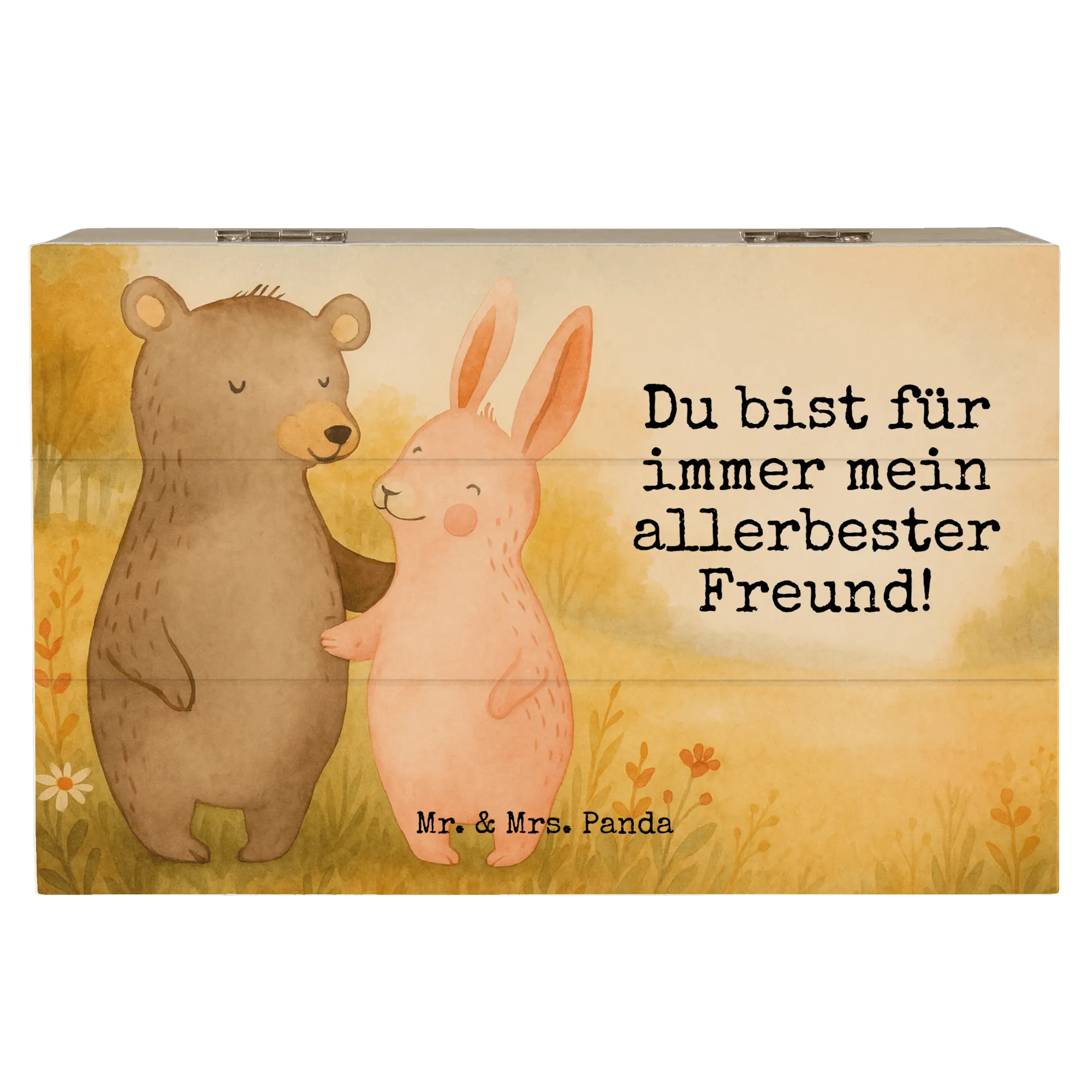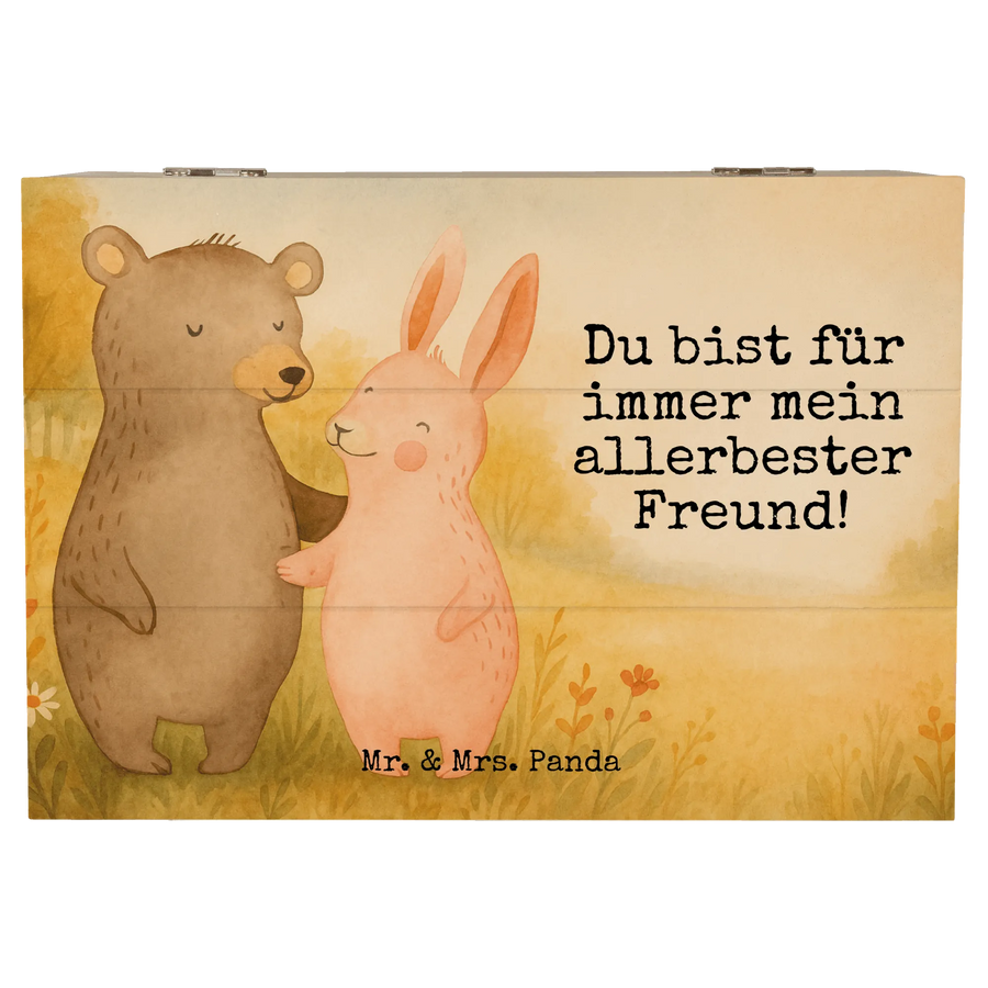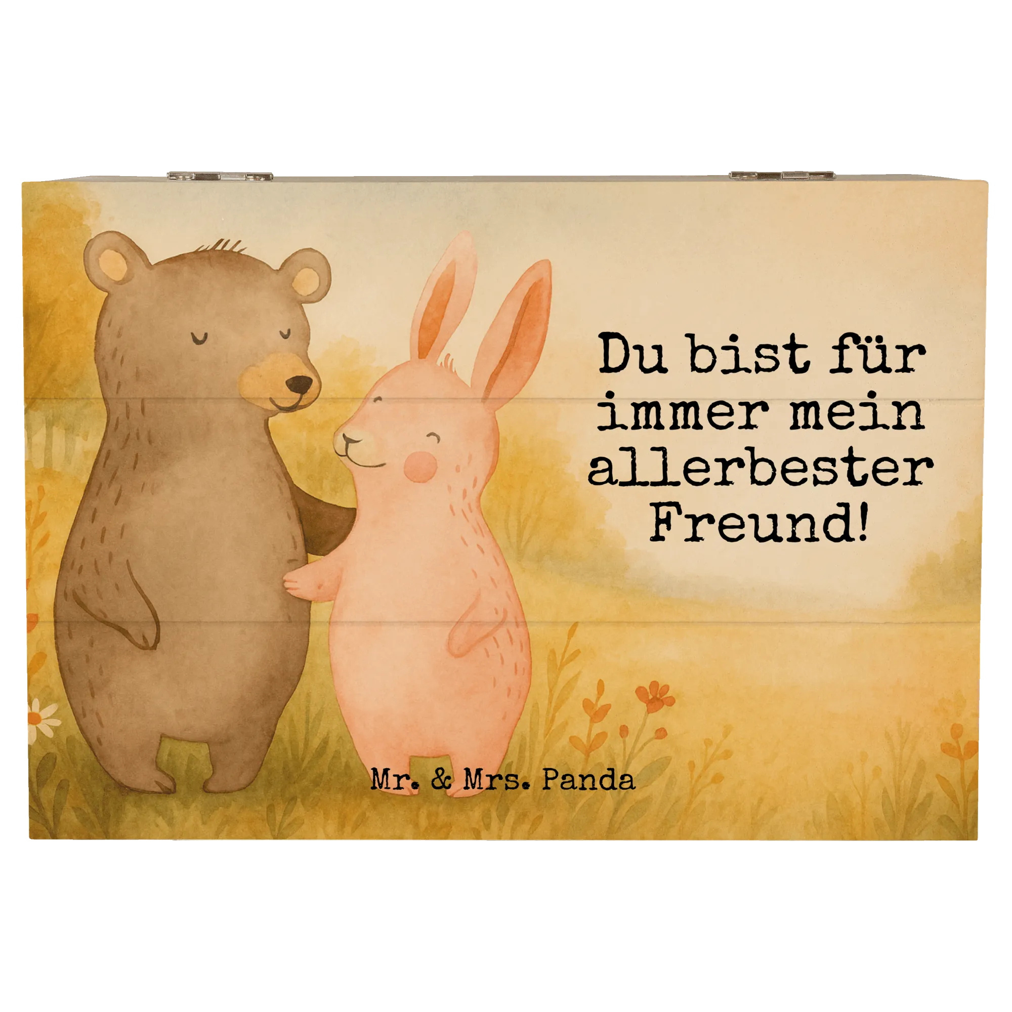 Unsere Holzkiste "Bär Hase Umarmen" aus der Liebe-Kollektion von Mr. & Mrs. Panda zeigt eine zarte Aquarellszene: Ein Bär und ein Hase umarmen sich, begleitet vom Spruch „Du bist für immer mein allerbester Freund!“. Dieses Motiv macht die Kiste zur perfekten Geschenkbox für alle Momente, in denen Gefühle sichtbar werden sollen.