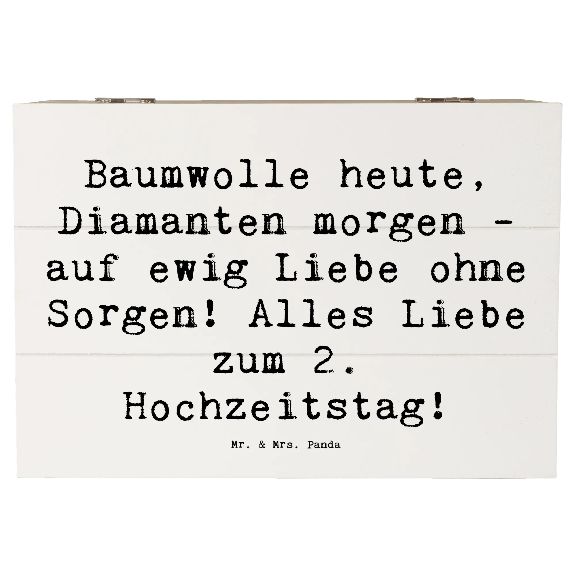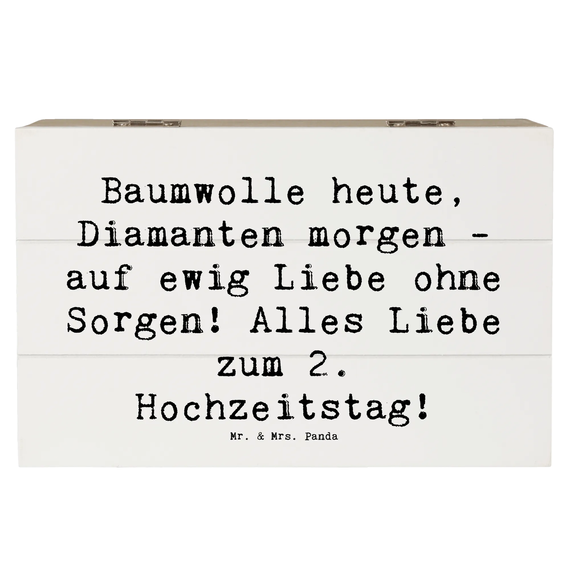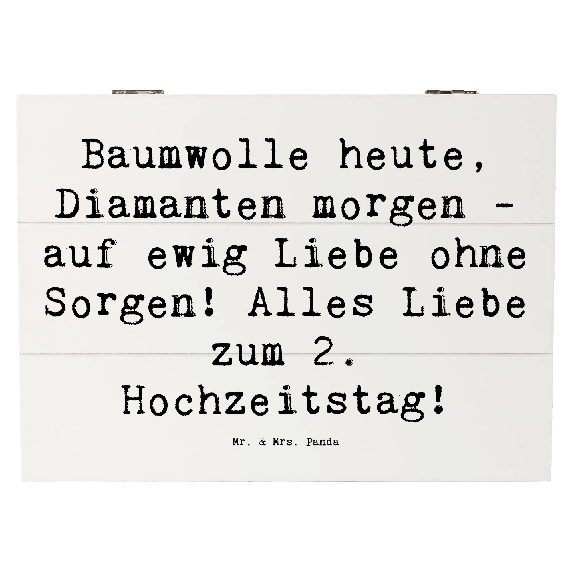 Unsere Mr. & Mrs. Panda Holzkiste zum 2. Hochzeitstag ist mehr als nur eine Kiste – sie ist eine Schatztruhe für Erinnerungen, ein liebevolles Hochzeitsgeschenk und ein dekoratives Highlight für jedes Zuhause. Mit dem süßen Spruch „Baumwolle heute, Diamanten morgen - auf ewig Liebe ohne Sorgen! Alles Liebe zum 2. Hochzeitstag!“ wird die Kiste zu einem persönlichen Gruß, der Herzen wärmt. 💕