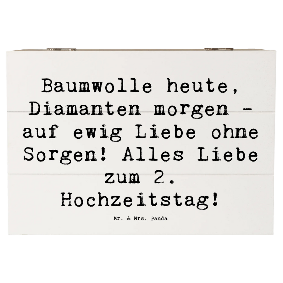 Entdecke die perfekte Holzkiste für euren 2. Hochzeitstag, die Baumwollhochzeit! Diese wunderschöne Holzkiste von Mr. & Mrs. Panda ist nicht nur ein toller Blickfang, sondern auch ein echter Schatz für all eure Erinnerungen! Mit einem liebevollen Spruch wie "Baumwolle heute, Diamanten morgen - auf ewig Liebe ohne Sorgen! Alles Liebe zum 2. Hochzeitstag!" wird sie zum idealen Geschenk für frisch verheiratete Paare oder für Paare, die dieses besondere Jubiläum feiern.
