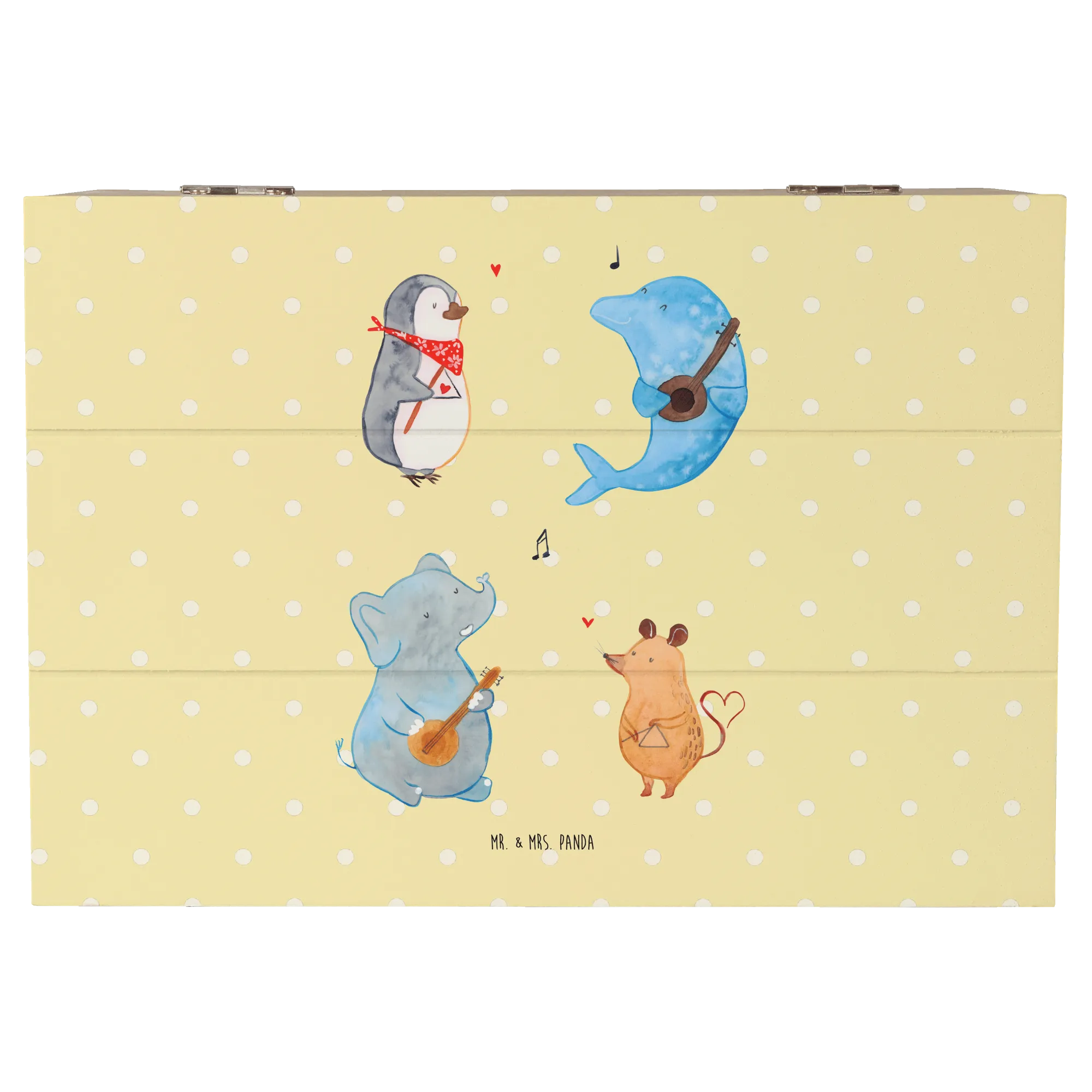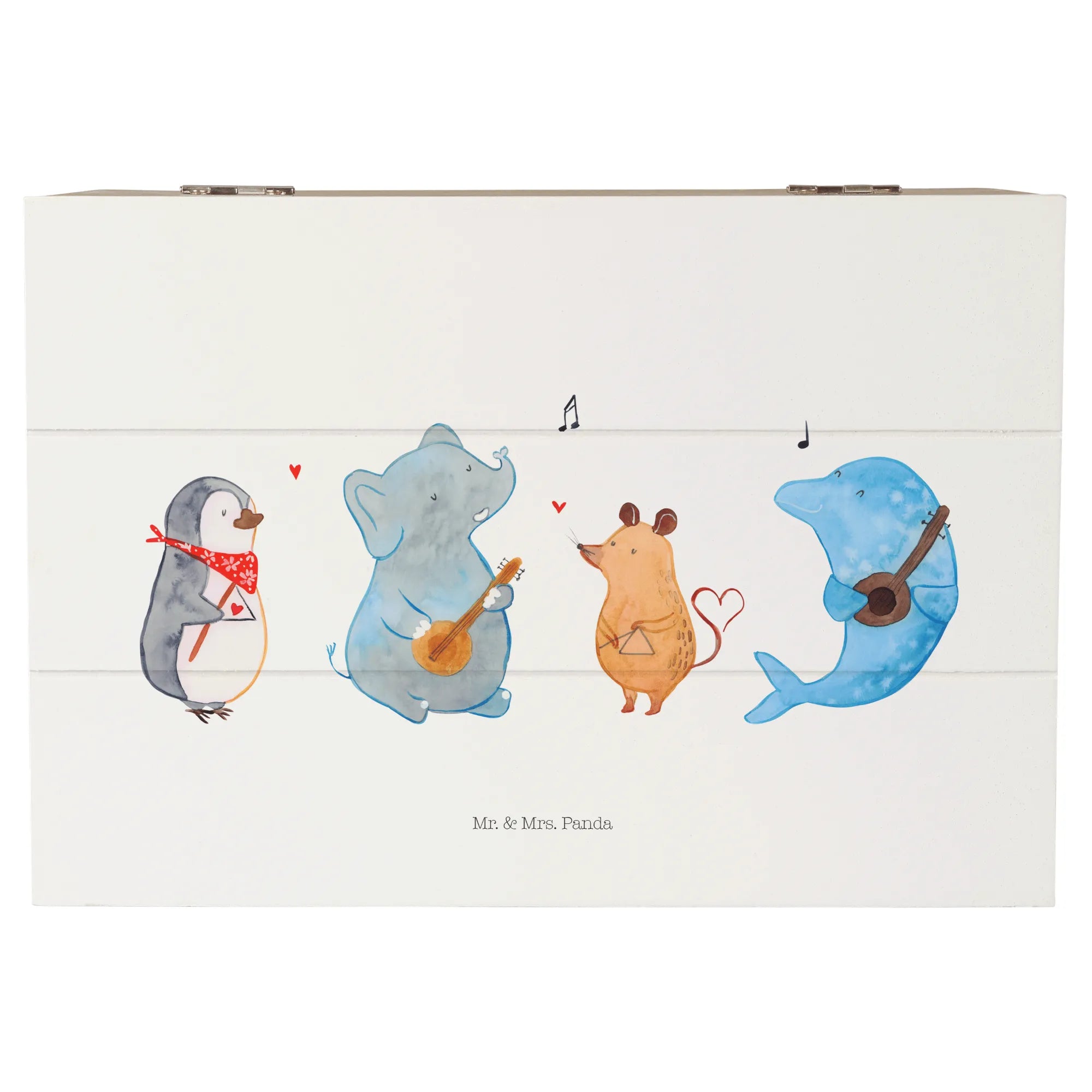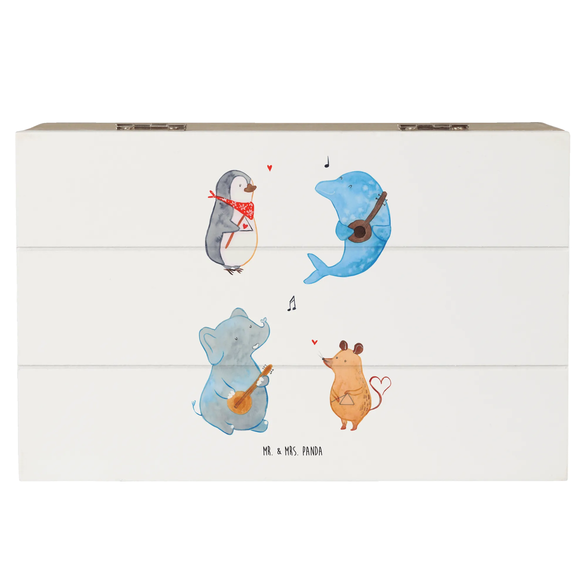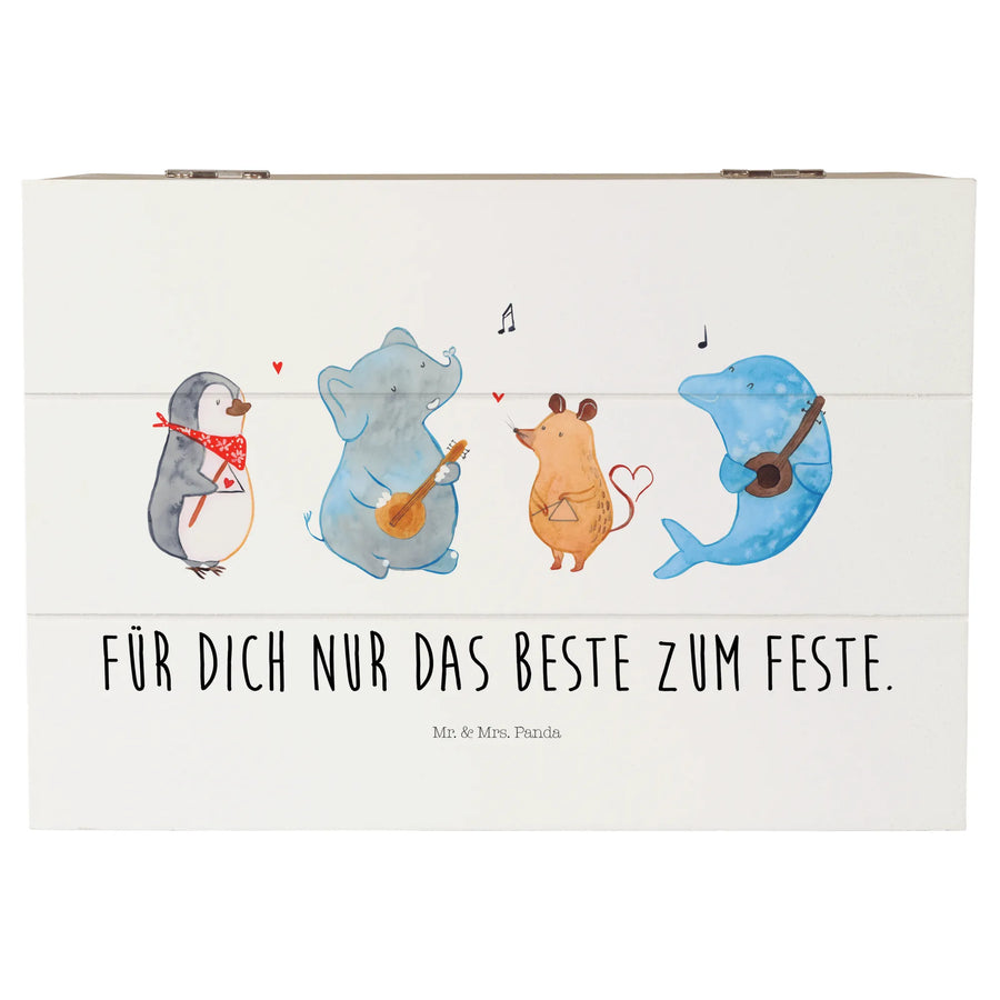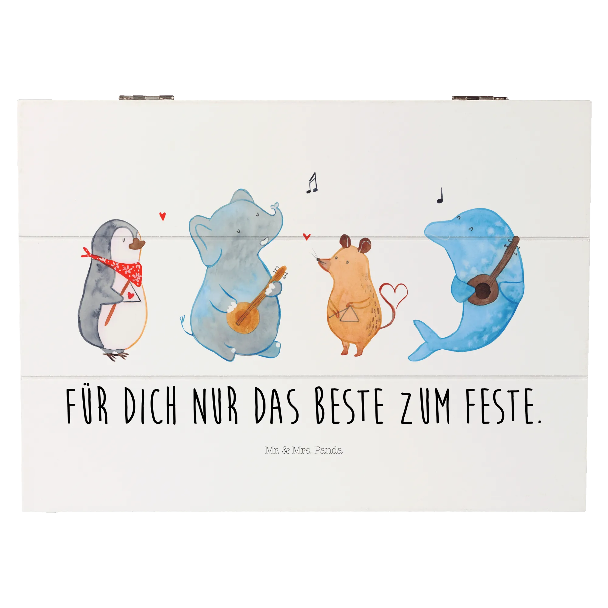 Die wunderschöne Holzkiste von Mr. & Mrs. Panda mit dem lustigen Big Band-Motiv ist das perfekte Geschenk für alle Musikliebhaber und Tierfreunde! 🎶 Mit einem Pinguin, einer Maus, einem Delfin und einem Elefanten, die gemeinsam die schönsten Melodien zaubern, bringt diese Erinnerungskiste Freude in jedes Zuhause.