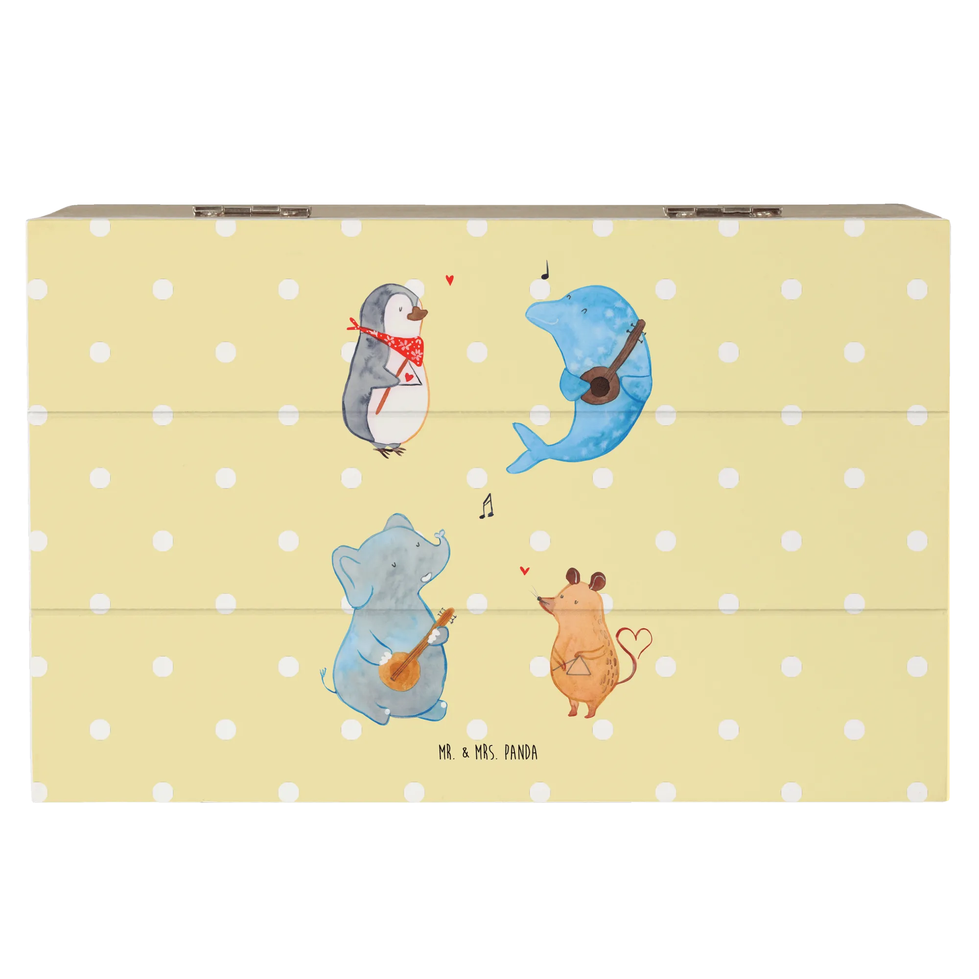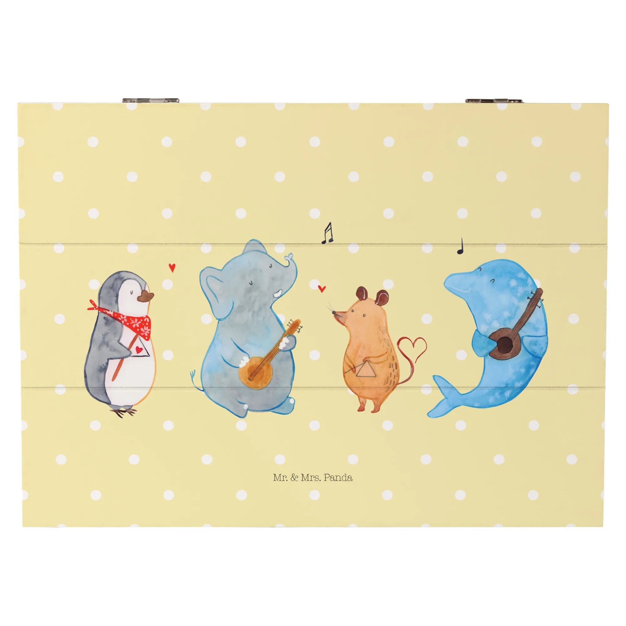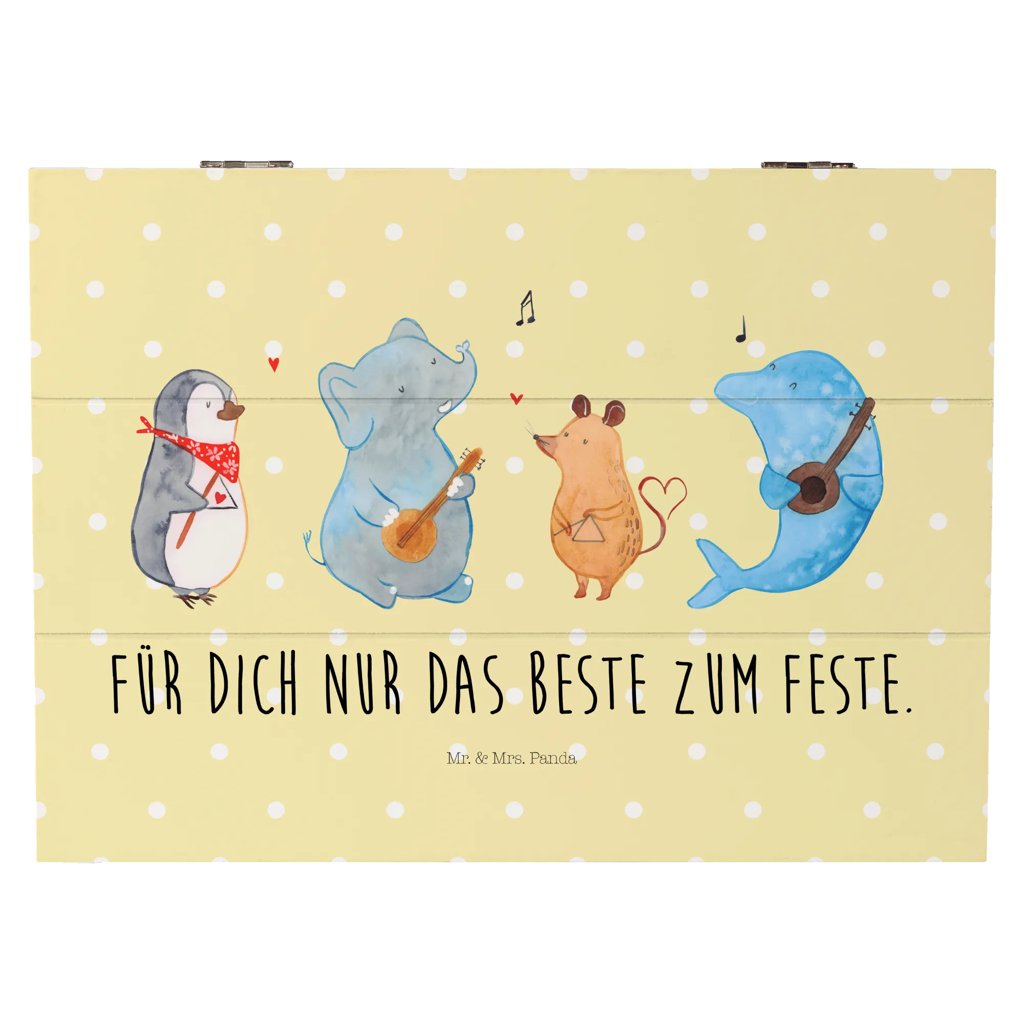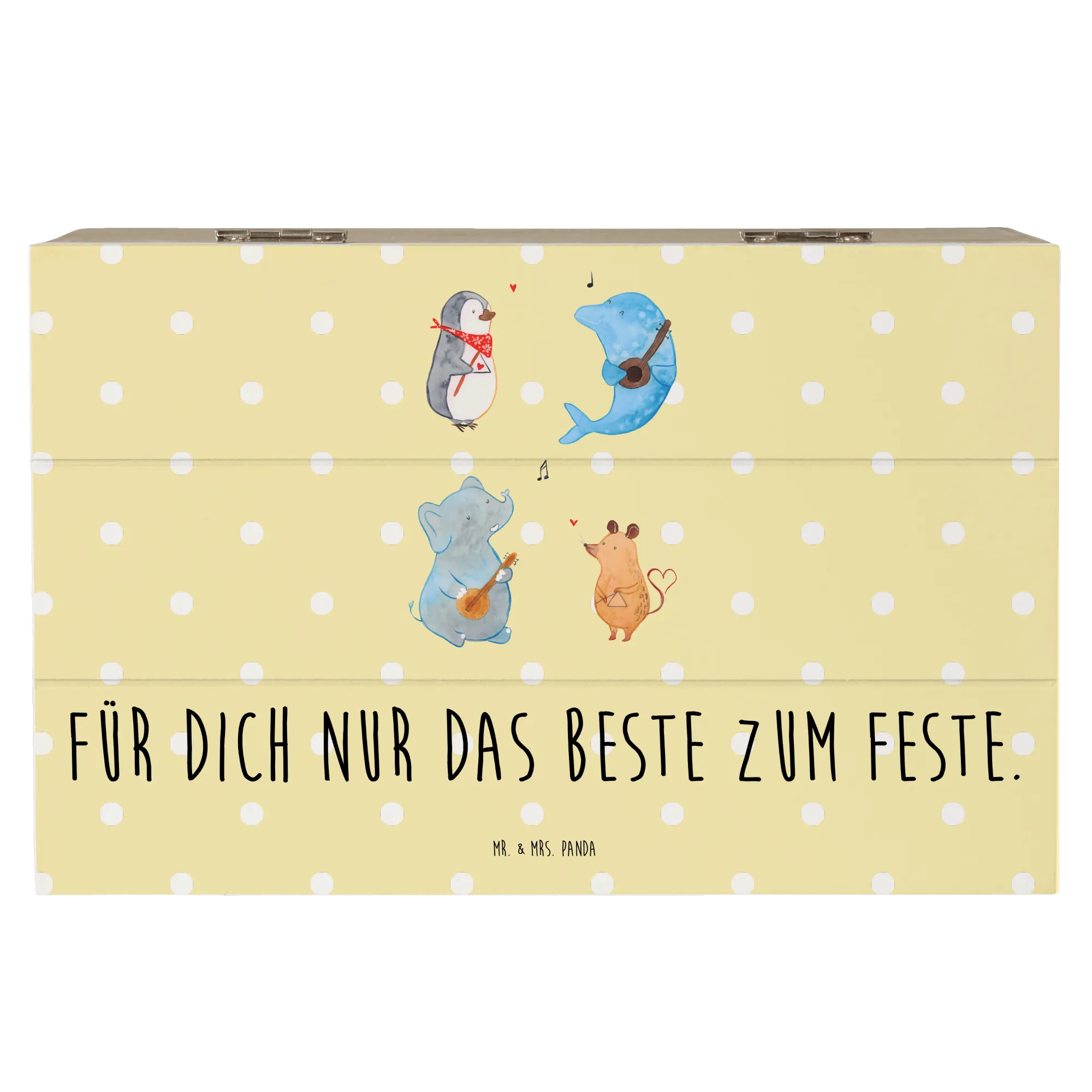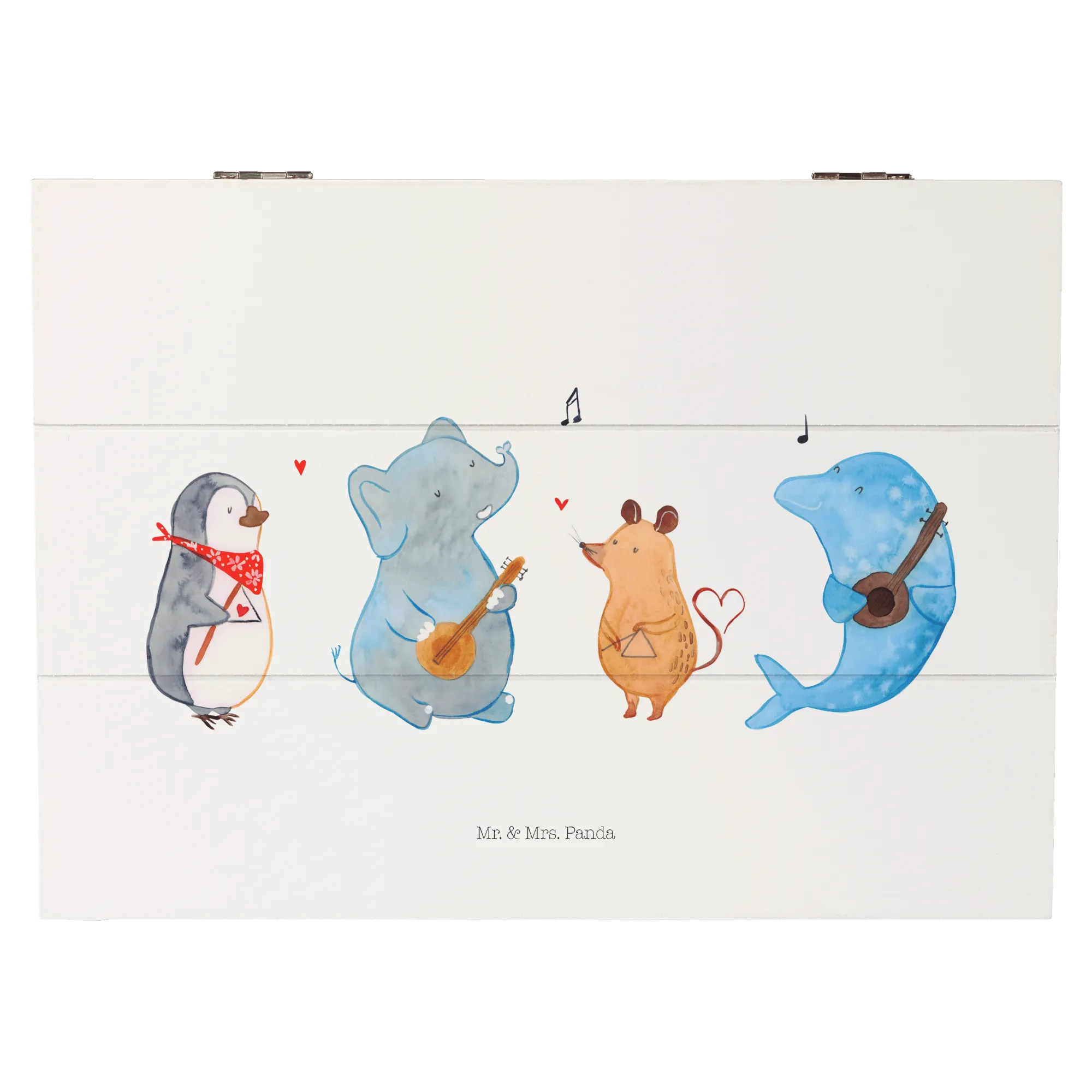 Die wunderschöne Holzkiste von Mr. & Mrs. Panda mit dem lustigen Big Band-Motiv ist das perfekte Geschenk für alle Musikliebhaber und Tierfreunde! 🎶 Mit einem Pinguin, einer Maus, einem Delfin und einem Elefanten, die gemeinsam die schönsten Melodien zaubern, bringt diese Erinnerungskiste Freude in jedes Zuhause.