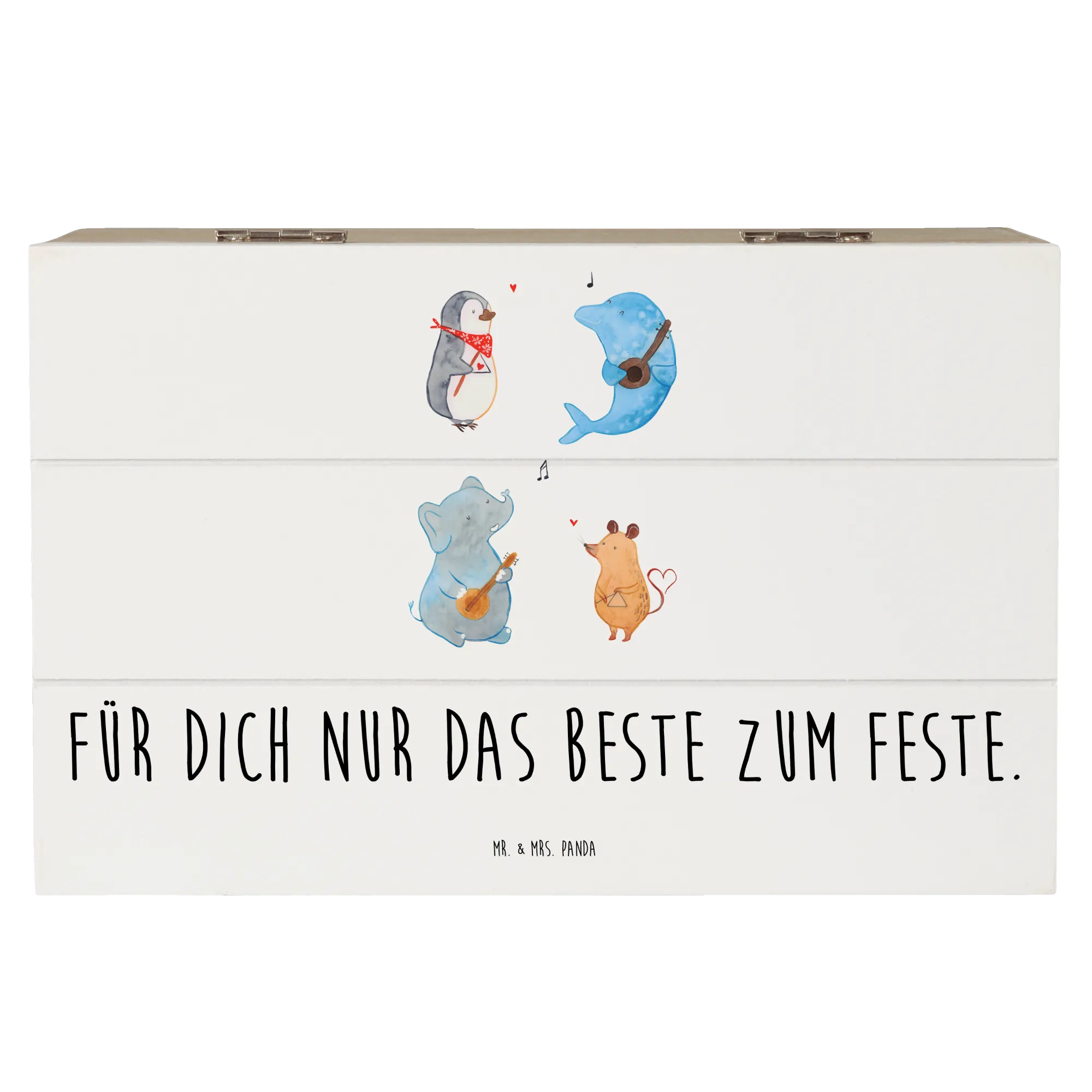 Die Holzkiste "Big Band" von Mr. & Mrs. Panda ist das perfekte Geschenk für Musikliebhaber und Tierfreunde! 🎶 Diese liebevoll gestaltete Erinnerungskiste aus robuster Premium Hartfaser verzaubert nicht nur durch ihr charmantes Design mit einem Pinguin, einer Maus, einem Delfin und einem Elefanten, die alle zusammen musizieren, sondern auch durch ihre Funktionalität.