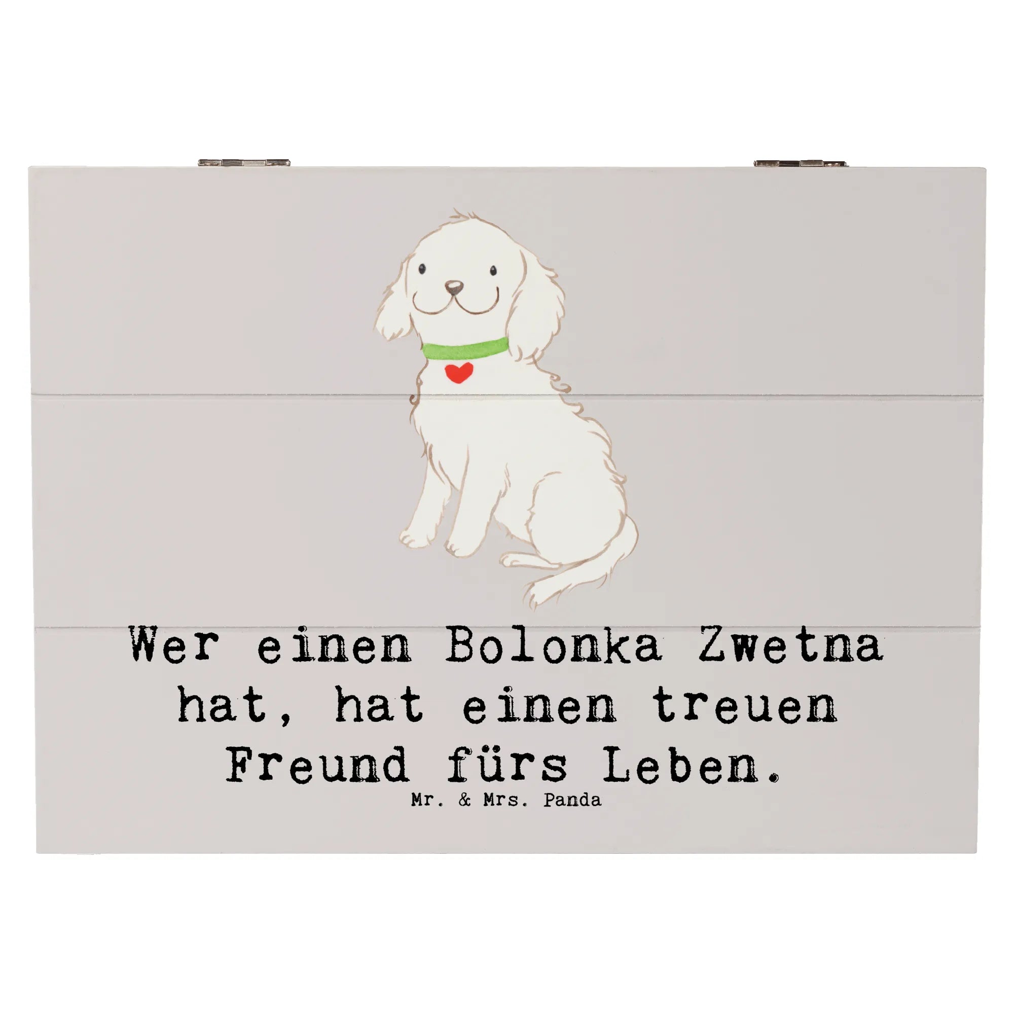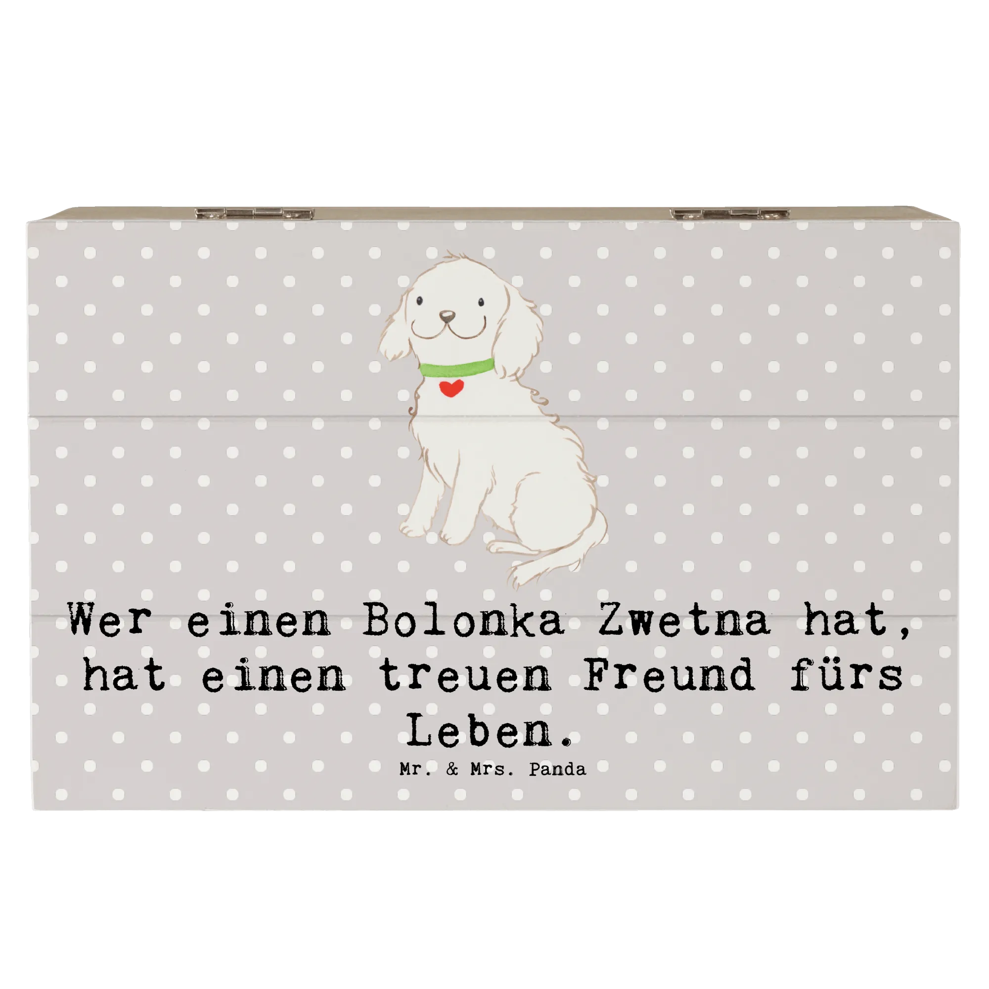 Unsere Holzkiste Bolonka Zwetna aus der Hunderassen Kollektion vereint praktischen Nutzen mit warmem Design. Auf dem Deckel steht der liebevolle Spruch „Wer einen Bolonka Zwetna hat, hat einen treuen Freund fürs Leben.“, begleitet von einer zarten, handgezeichneten Aquarell-Illustration von Mrs. Panda. Die dezente Grau-Pastell-Beschichtung macht die Box zu einem eleganten Blickfang in jedem Zuhause.