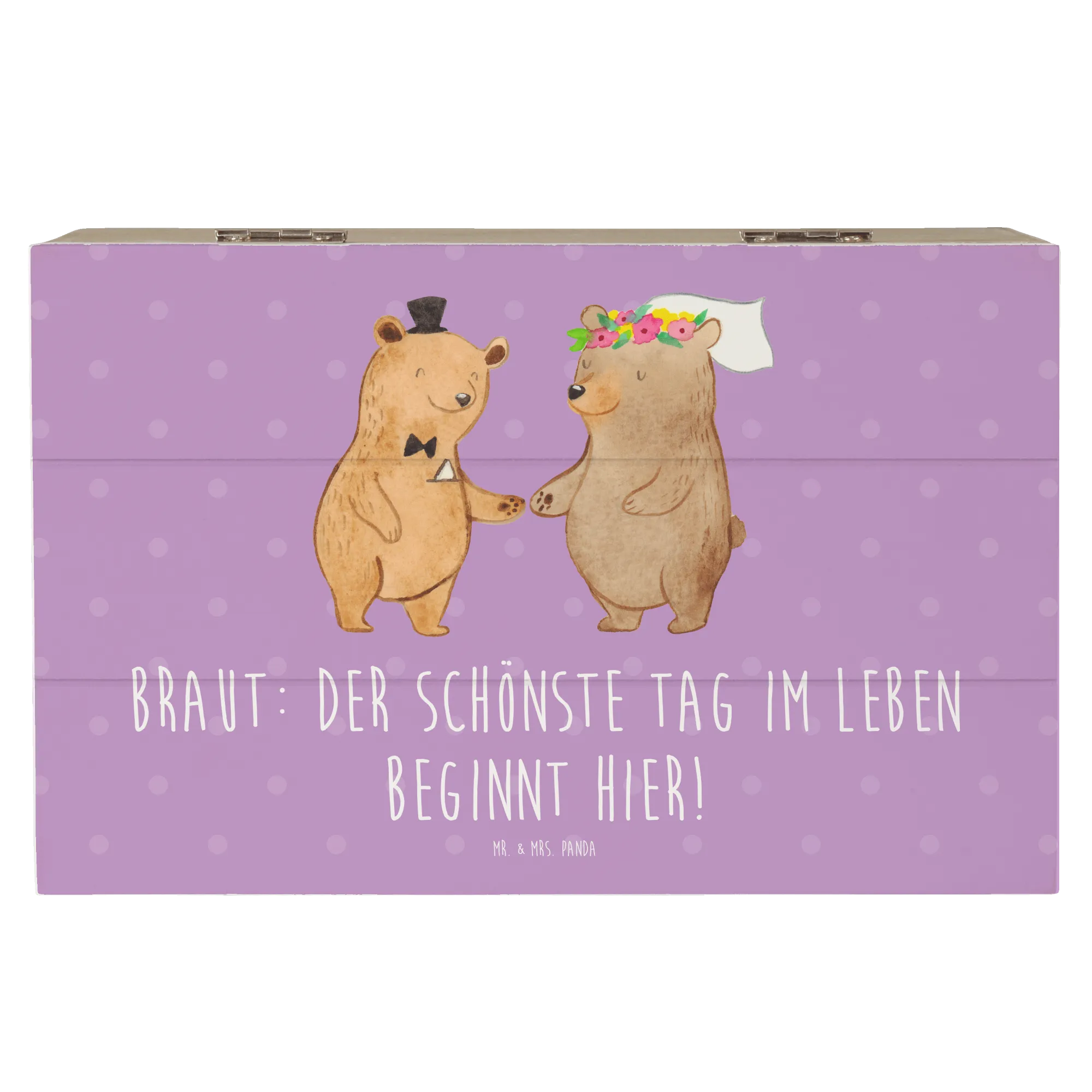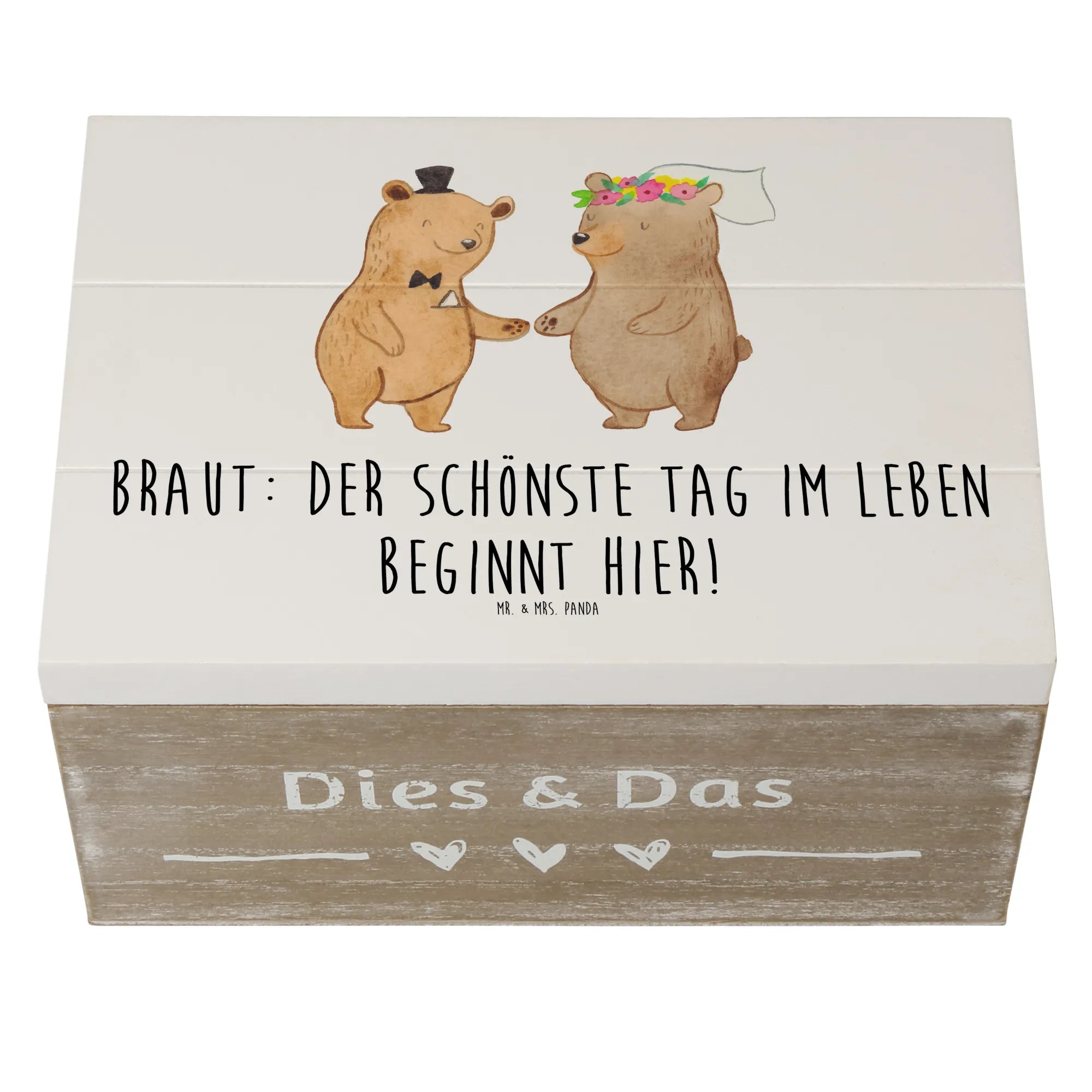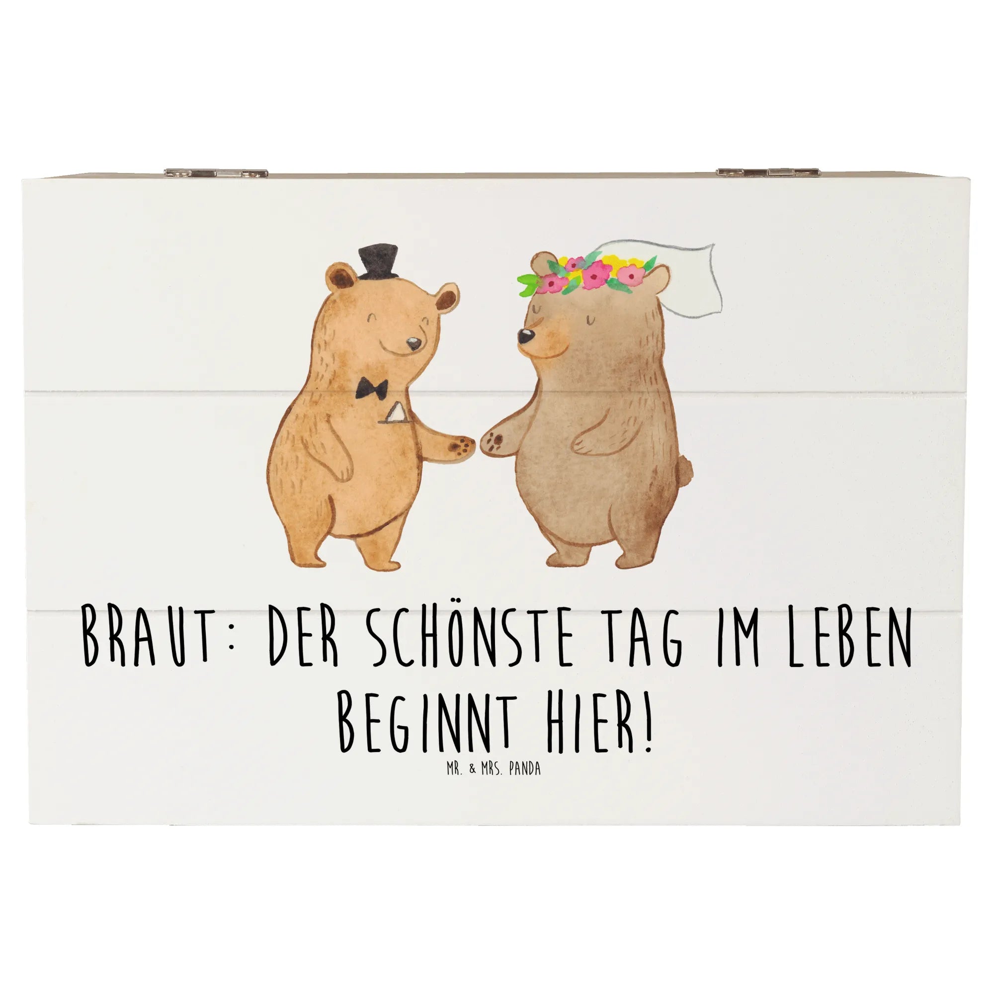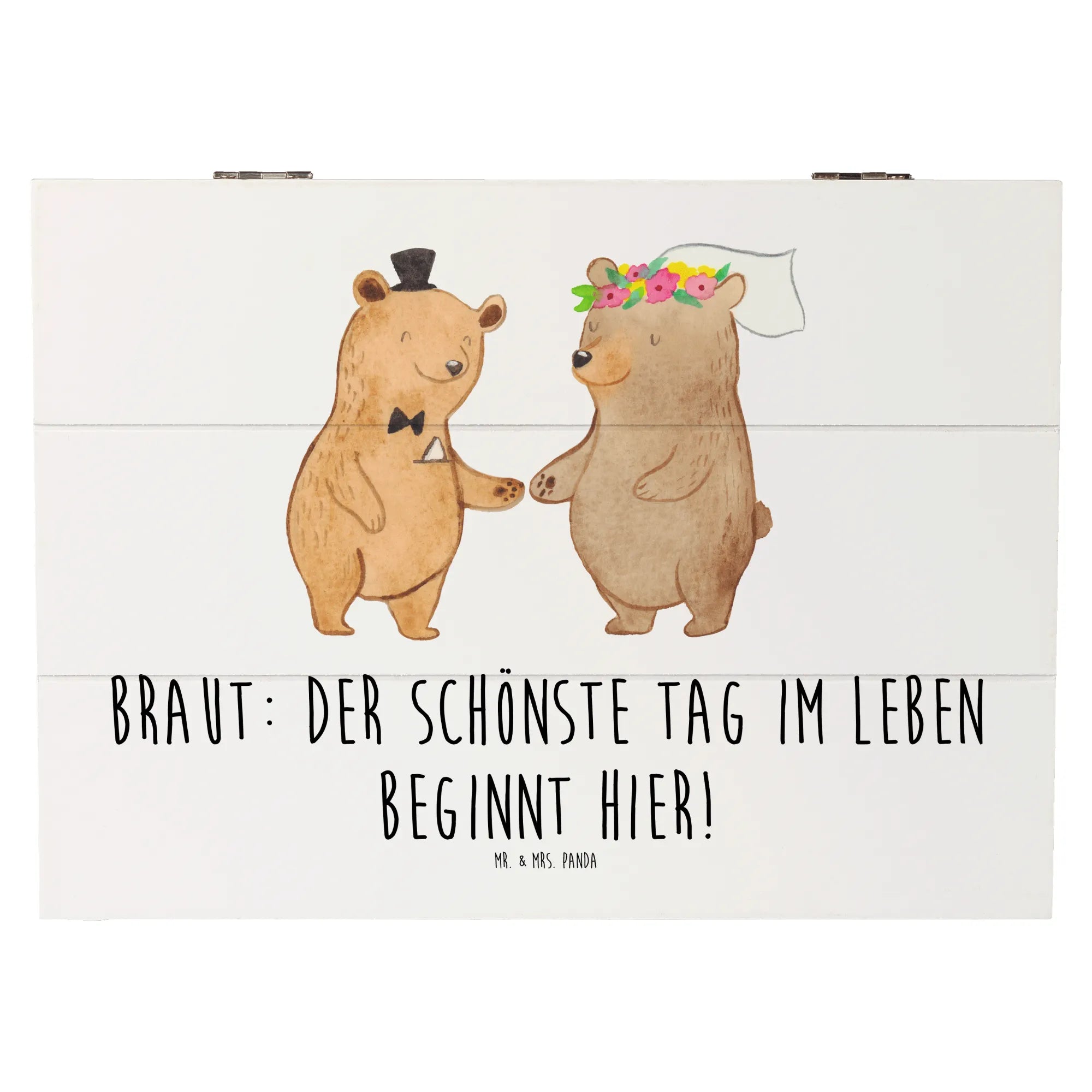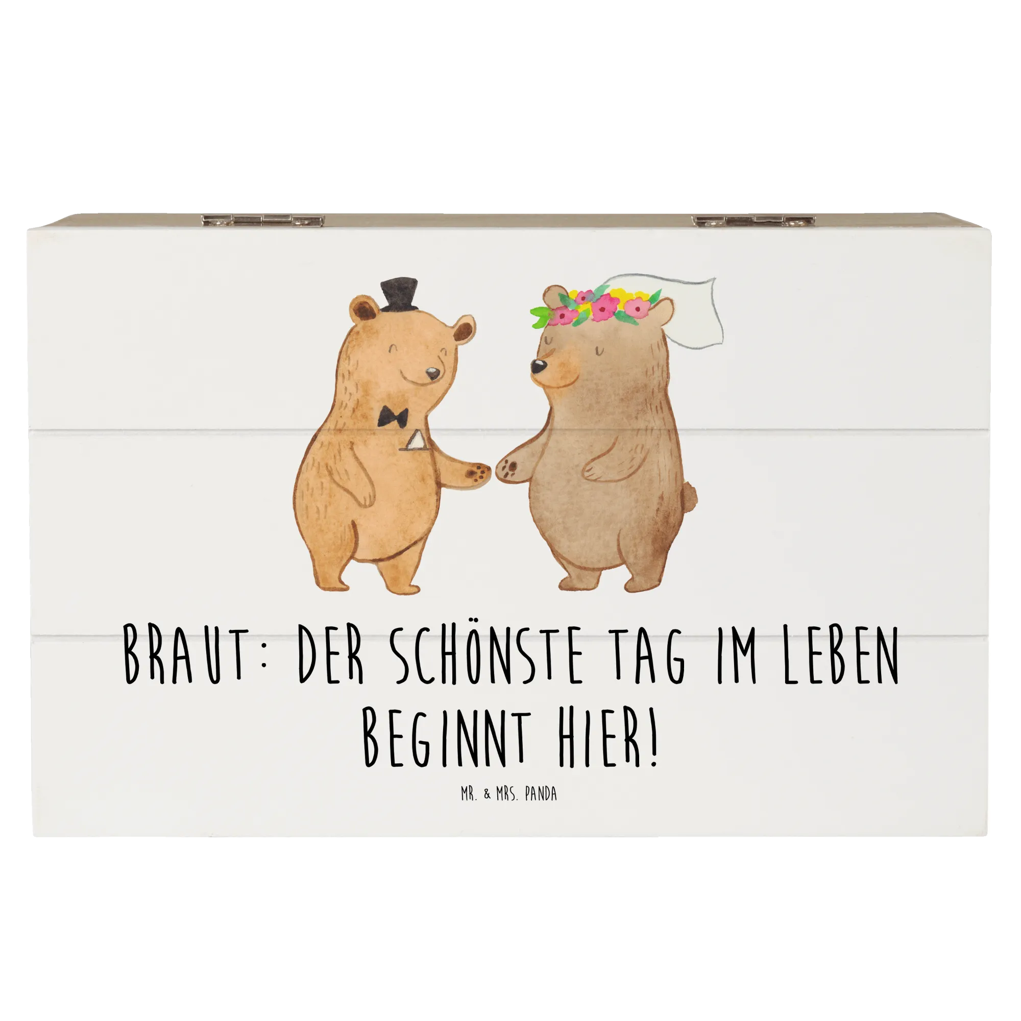 Die wunderschöne Holzkiste von Mr. & Mrs. Panda ist der perfekte Begleiter für den schönsten Tag deines Lebens. Mit dem liebevollen Motiv 'Braut: Der schönste Tag im Leben beginnt hier!' wird sie zu einem besonderen Erinnerungsstück, das jeden Moment deiner Hochzeit festhält.