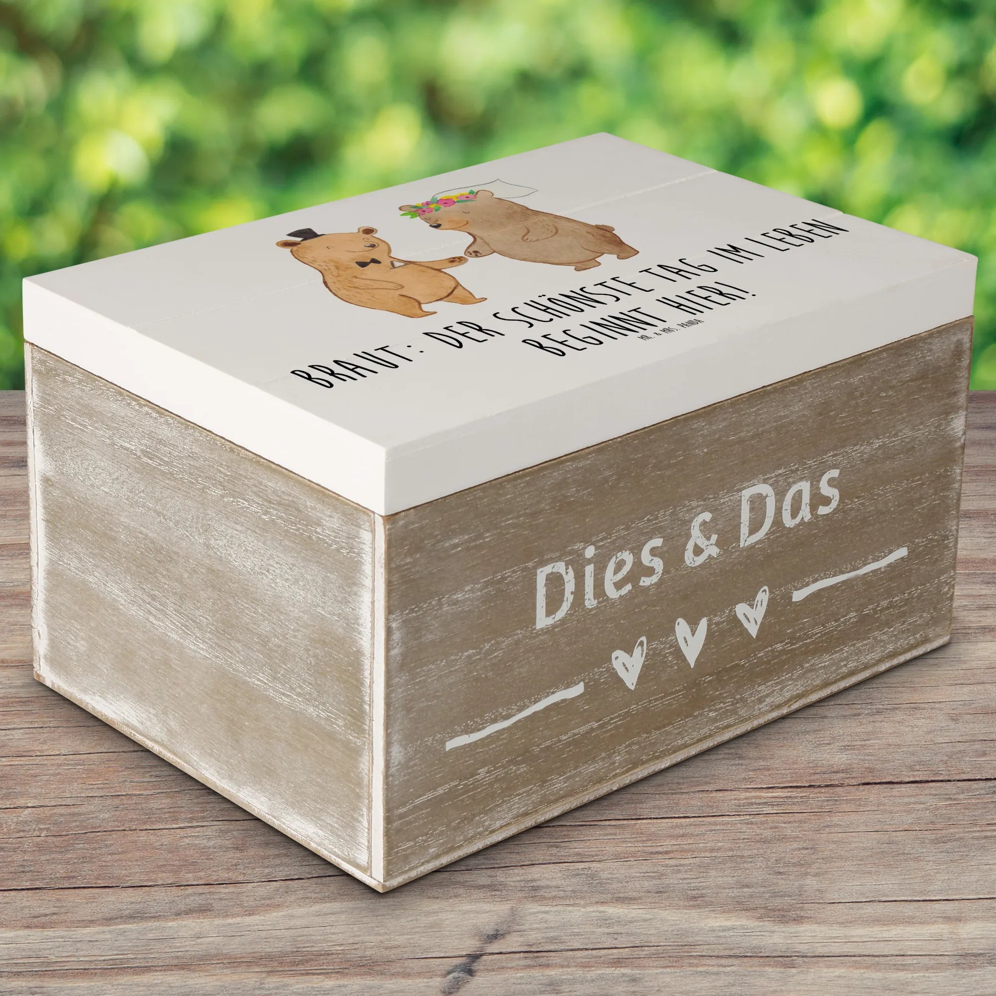 Entdecke die wunderschöne Holzkiste "Braut" von Mr. & Mrs. Panda, die perfekt für den schönsten Tag Deines Lebens geeignet ist! Die Erinnerungskiste ist nicht nur ein stilvolles Accessoire für Hochzeiten, sondern auch ein behüteter Aufbewahrungsort für all die kostbaren Momente rund um den großen Tag. Ob Du die schönsten Hochzeitsfotos, Briefe oder kleine Geschenke darin aufbewahren möchtest – diese Kiste ist die ideale Lösung!