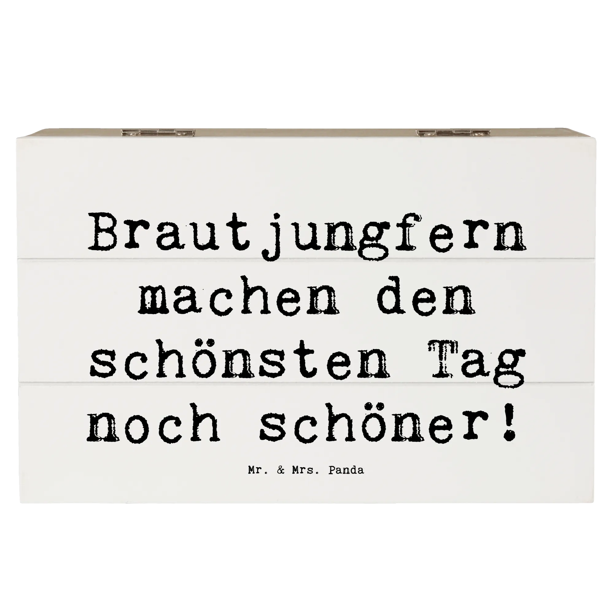 Entdecke die zauberhafte Holzkiste von Mr. & Mrs. Panda, perfekt für all die besonderen Anlässe in deinem Leben! Ob Hochzeit, Geburtstag oder einfach als schlichte Aufbewahrungsbox – diese Erinnerungskiste ist ideal für all deine Schätze. Übrigens, mit dem Slogan 'Brautjungfern machen den schönsten Tag noch schöner!' wird diese Kiste zum idealen Geschenk für deine Trauzeuginnen. Sie ist nicht nur ein wunderschönes Accessoire, sondern auch ein praktischer Ort für Erinnerungen – sei es das Fotoalbum von deinem Hochzeitstag, die ersten Babyschuhe oder ganz einfach als Dekokiste.