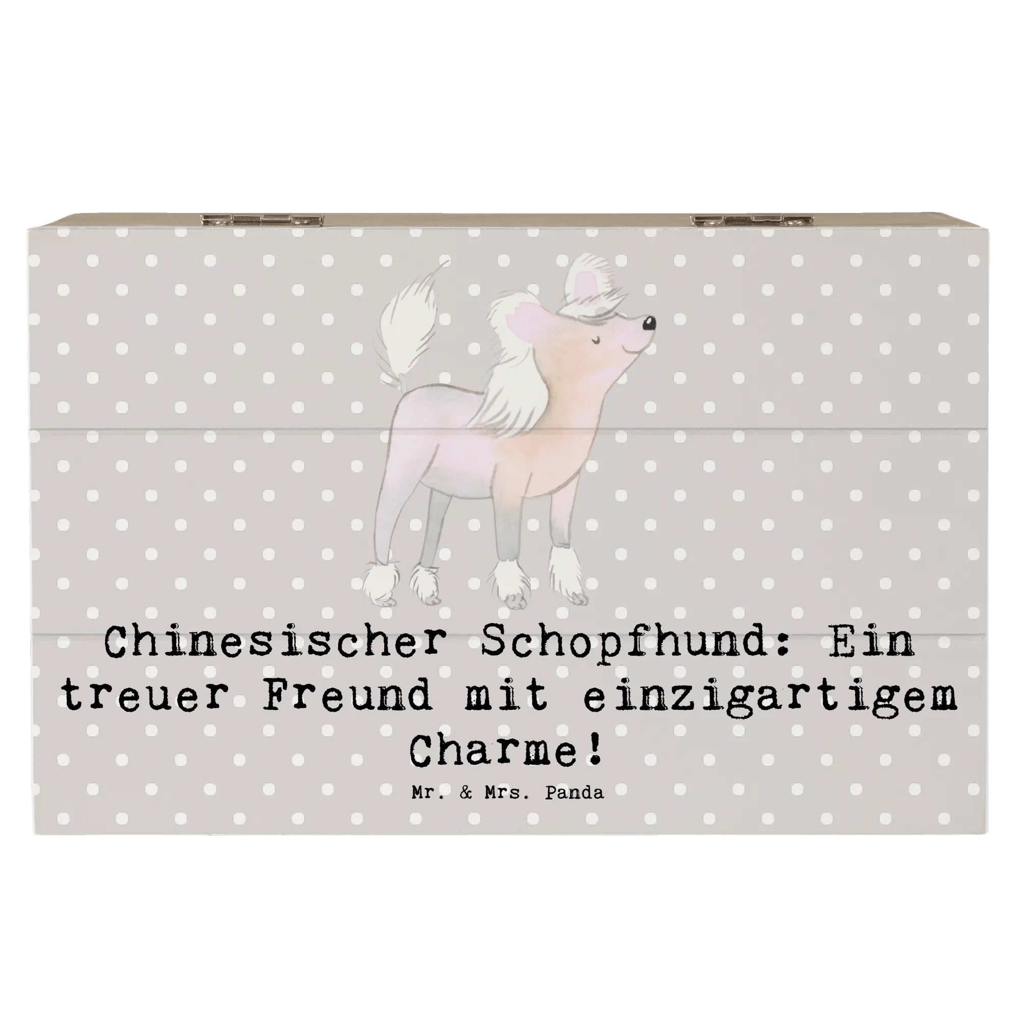 Entdecke die wundervolle Holzkiste mit dem süßen Motiv des Chinesischen Schopfhundes von Mr. & Mrs. Panda! Diese entzückende Kiste ist der perfekte Aufbewahrungsort für all deine kleinen Schätze und Erinnerungen.