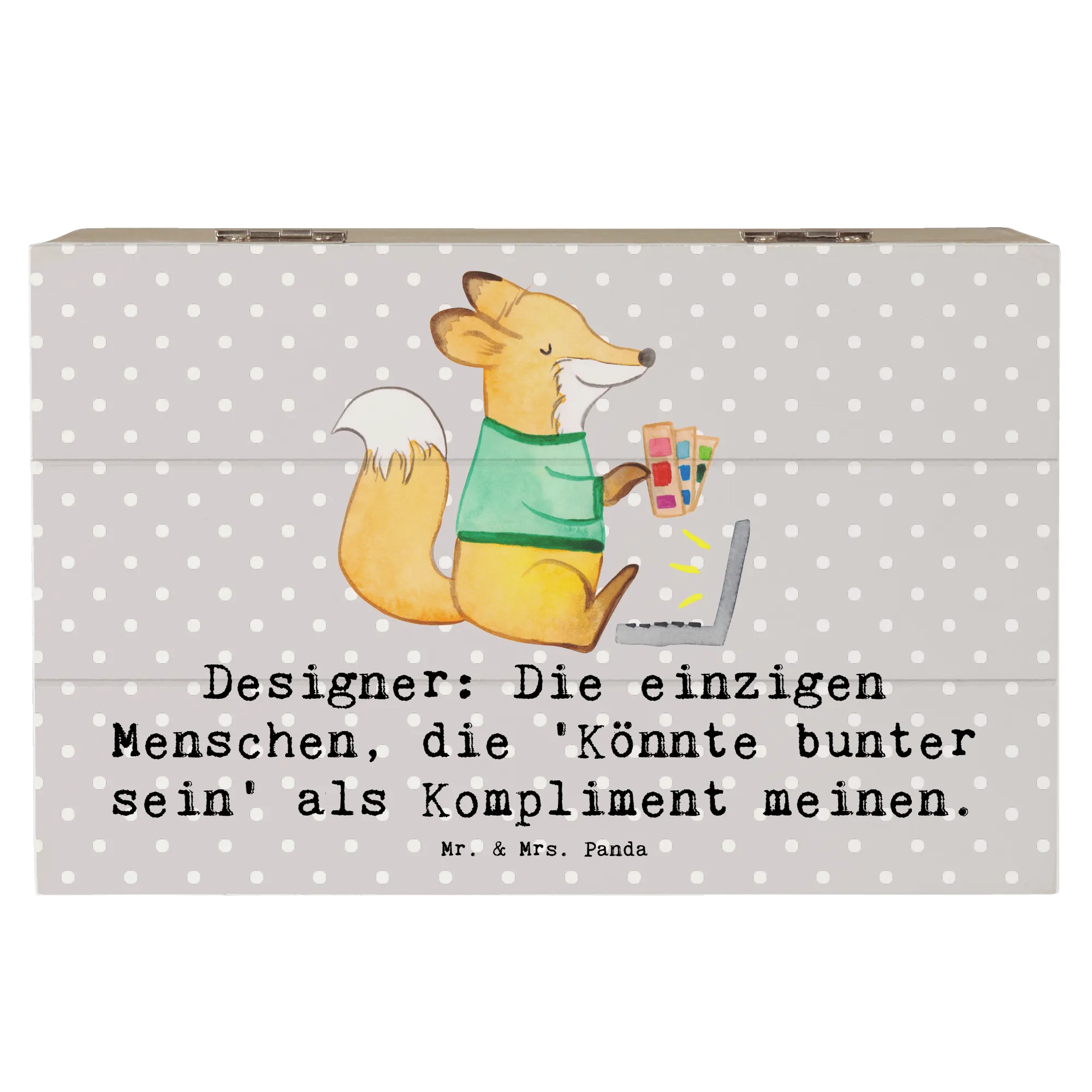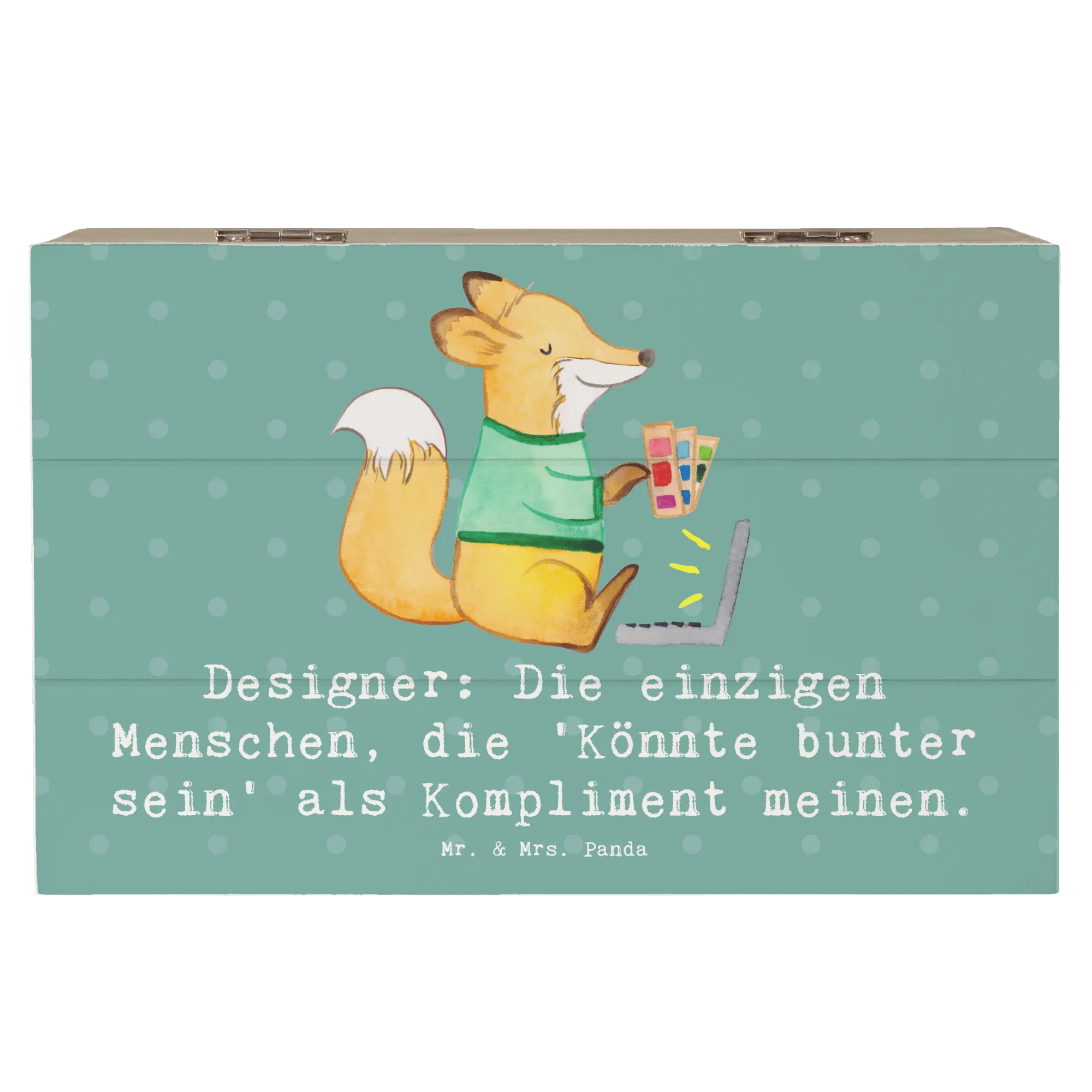 Dank der liebevollen Gestaltung mit dem Spruch „Designer: Die einzigen Menschen, die 'Könnte bunter sein' als Kompliment meinen“ ist diese Kiste eine himmlische Bereicherung für jeden Arbeitsplatz oder Wohnraum.