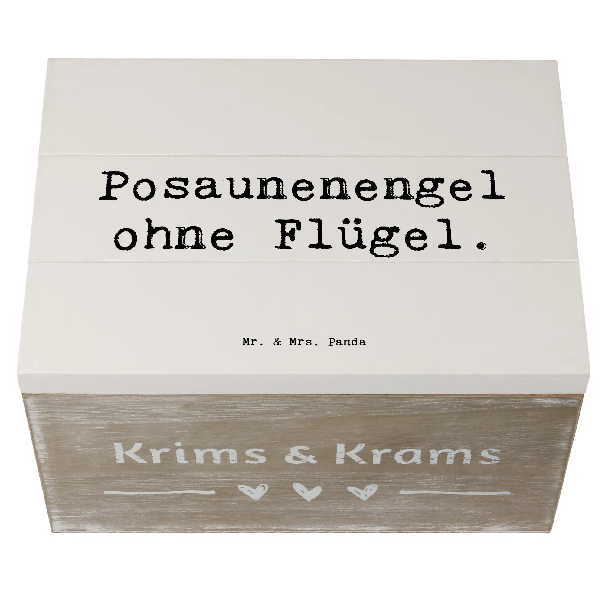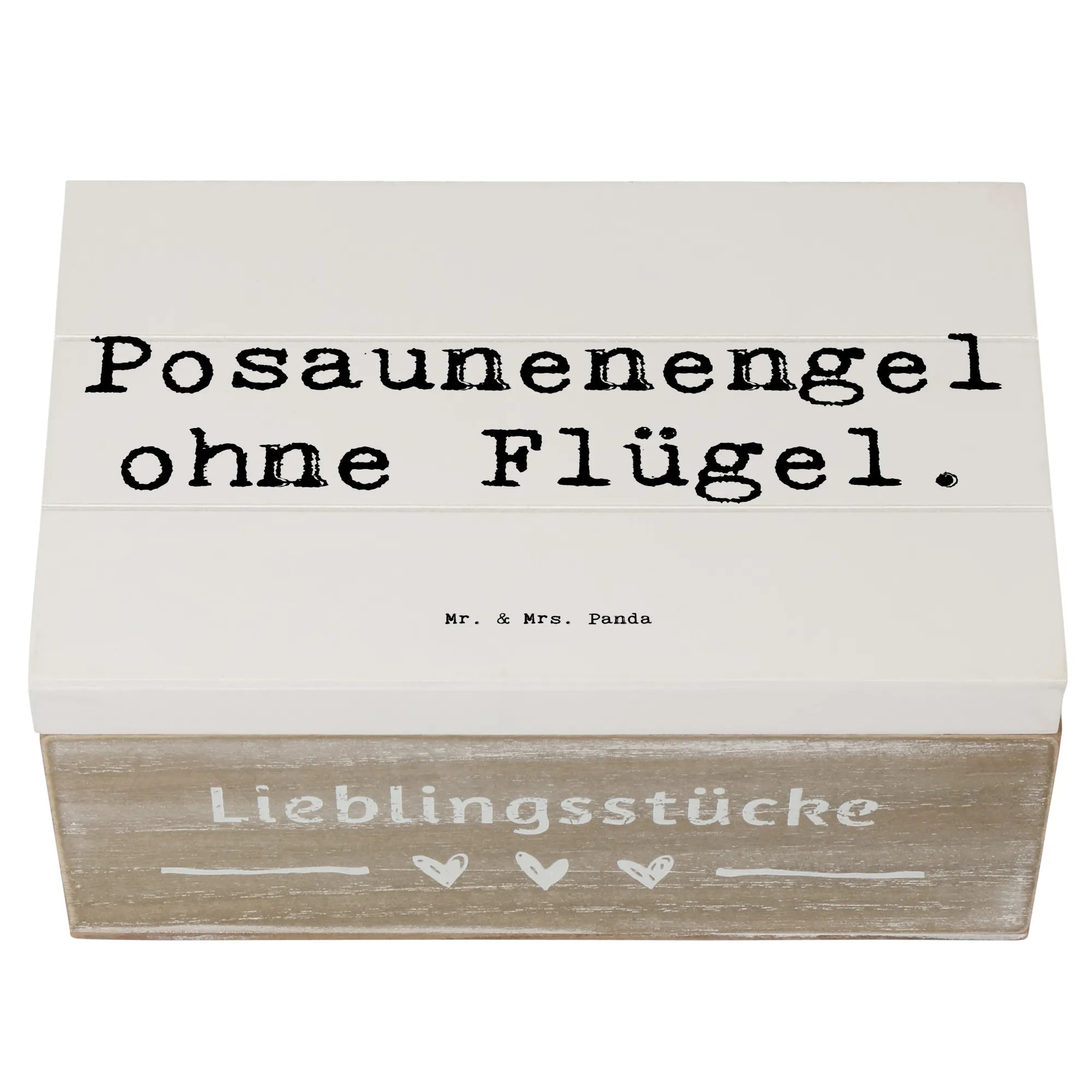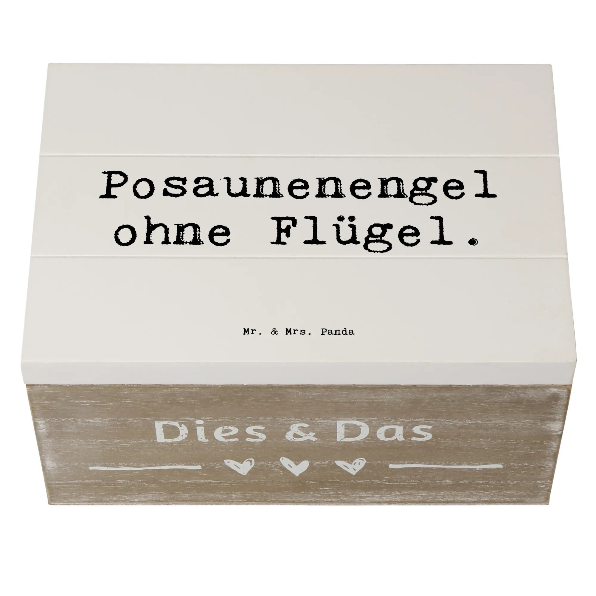 Die wunderschöne Holzkiste von Mr. & Mrs. Panda ist ein echtes Schmuckstück für alle Musikliebhaber und Posaunenspieler! Mit ihrem zauberhaften Motiv der Posaune und dem liebevollen Spruch 'Posaunenengel ohne Flügel' lässt sie nicht nur Herzen höherschlagen, sondern bietet dir auch einen idealen Platz für all deine wertvollen Erinnerungen. Ob für die ersten Schritte in die Musikwelt, besondere Anlässe wie die Kommunion oder Konfirmation, oder einfach nur als stilvolle Aufbewahrung für Fotos und andere Schätze, diese Kiste ist ein wahrhaft vielseitiges Geschenk.