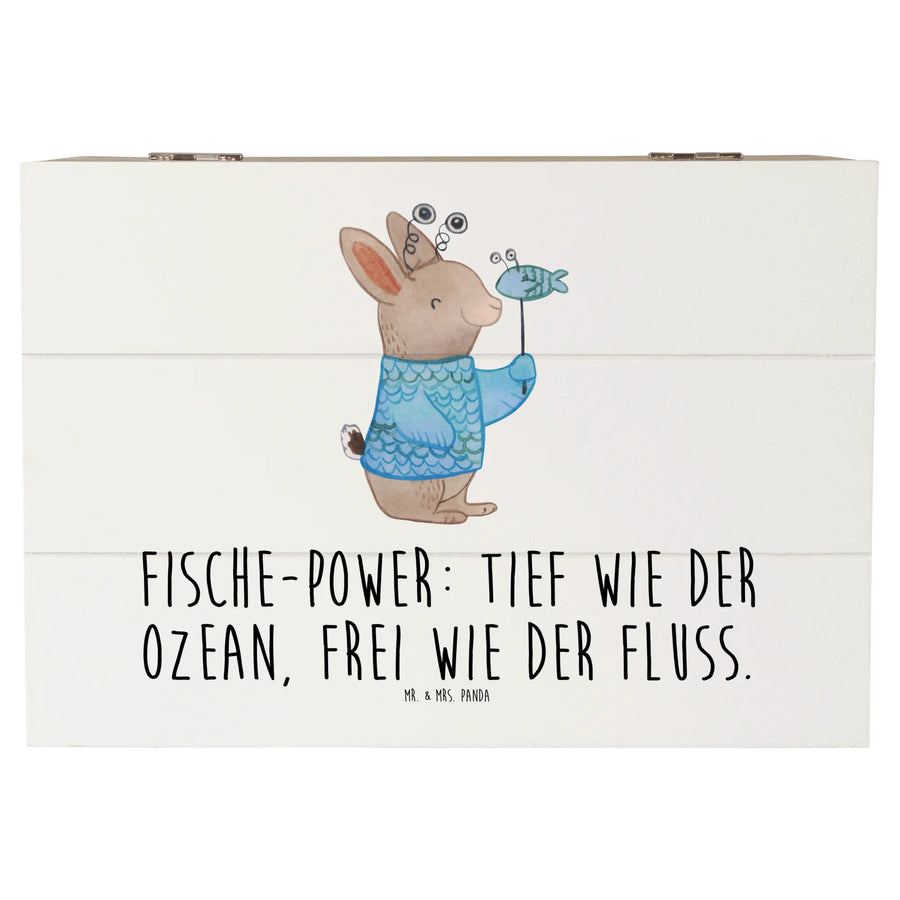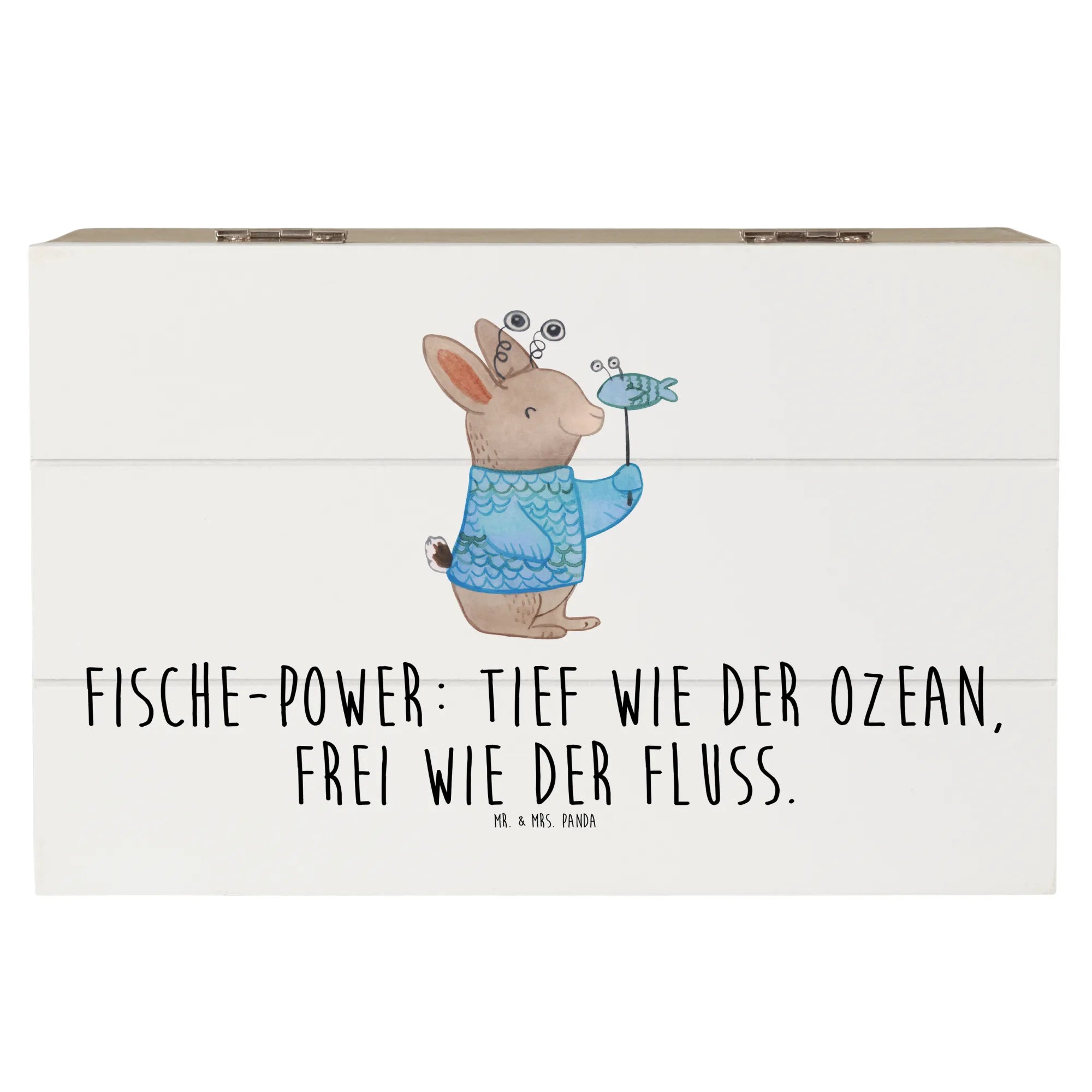 Das süße Motiv mit dem Hasen im Fischkostüm und dem Slogan "Fische-Power: Tief wie der Ozean, frei wie der Fluss." bringt ein Lächeln auf jedes Gesicht. Diese Holzkiste ist eine großartige Geschenkidee, um deinen Liebsten zum Geburtstag Freude zu bereiten oder um einfach mal Danke zu sagen.
